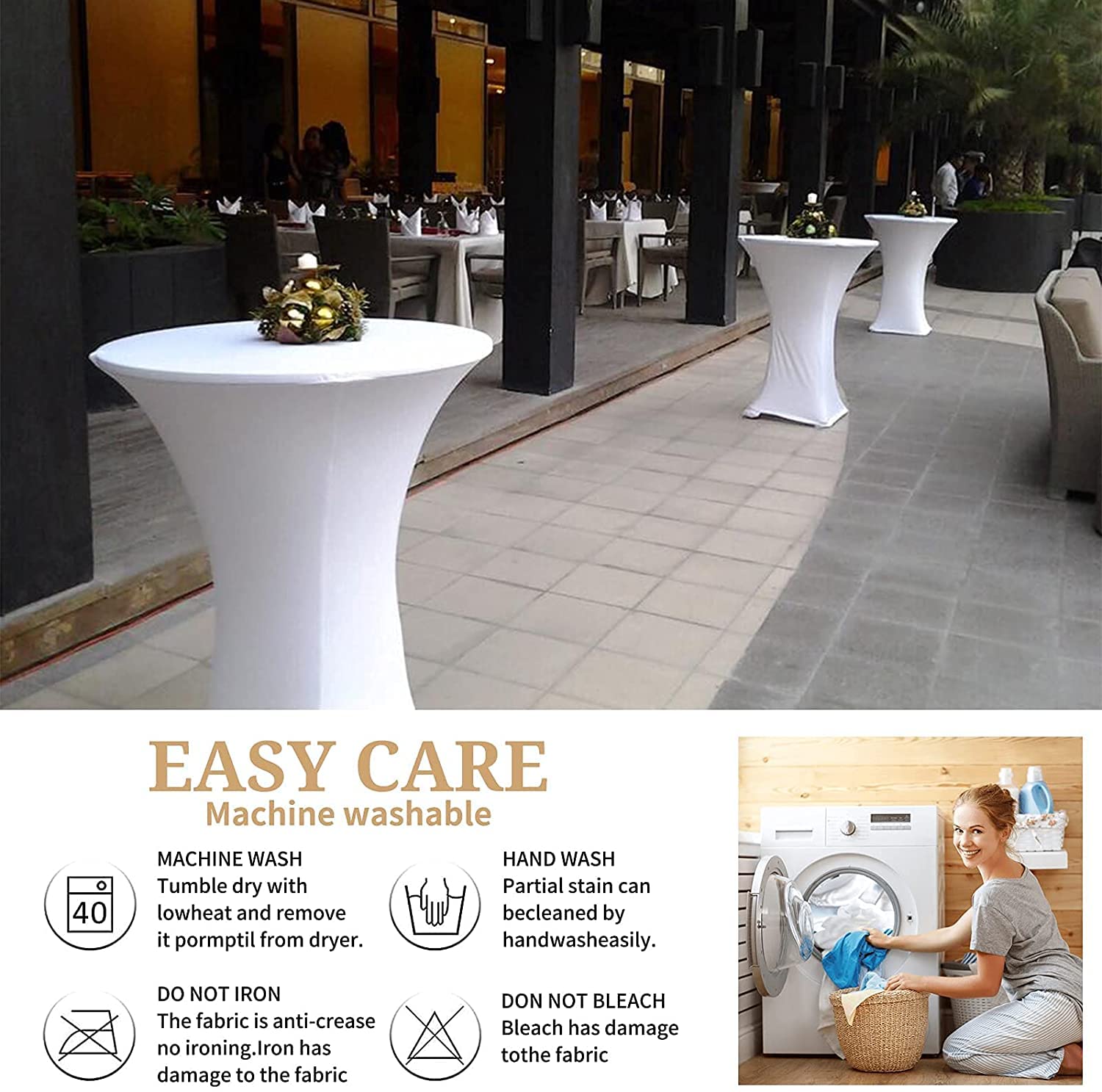 ["Spandex fabric: A set includes 6-pack round cocktail table covers, these cocktail table covers tablecloth made of 90% polyester and 10% spandex can be washed multiple times and does not need to be ironed.","Thoughtful design: The size of each cocktail table cover is approximately 32-inch diameter x 42-inch table height / 80 x 110 cm. The round cocktail table covers are equipped with reinforced foot pockets for the table legs, to secure the foot pockets tightly are very elastic and fit on many different table legs, they do not move when encountering wind, ensuring a snug and professional look.","Protective and beautiful: These custom fit stretch tablecloths are dirt-resistant and wrinkle-resistant, they protect your high tables from accidental dirt, dust, splashes, scratches, and stains. You can tie a bow, graffiti, or other decorations to make the black round cocktail table covers look special. Makes your tables look elegant, which can add to your party atmosphere","Easy to care for and reusable: These cocktail table covers are washable or machine washable and dry at low temperature in the dryer. Ironing is not required and can be washed countless times. There may be slight wrinkles when taken out, but it will quickly smooth out on the table. Bleach is not recommended. Do not wash with other materials.","Multi-purpose: Fits snugly on a bar-height cocktail table and also on folding cocktail tables. When used outdoors, this tablecloth does not slip or blow in the wind, it is not easy to stick small crumbs. Unnecessary things can be hidden unnoticed under the table, keeping the tabletop clean and tidy. Great as a wedding, fair, vendor, craft fair, jewelry exhibition, kitchen tablecloth or other uses for cocktail tables."]