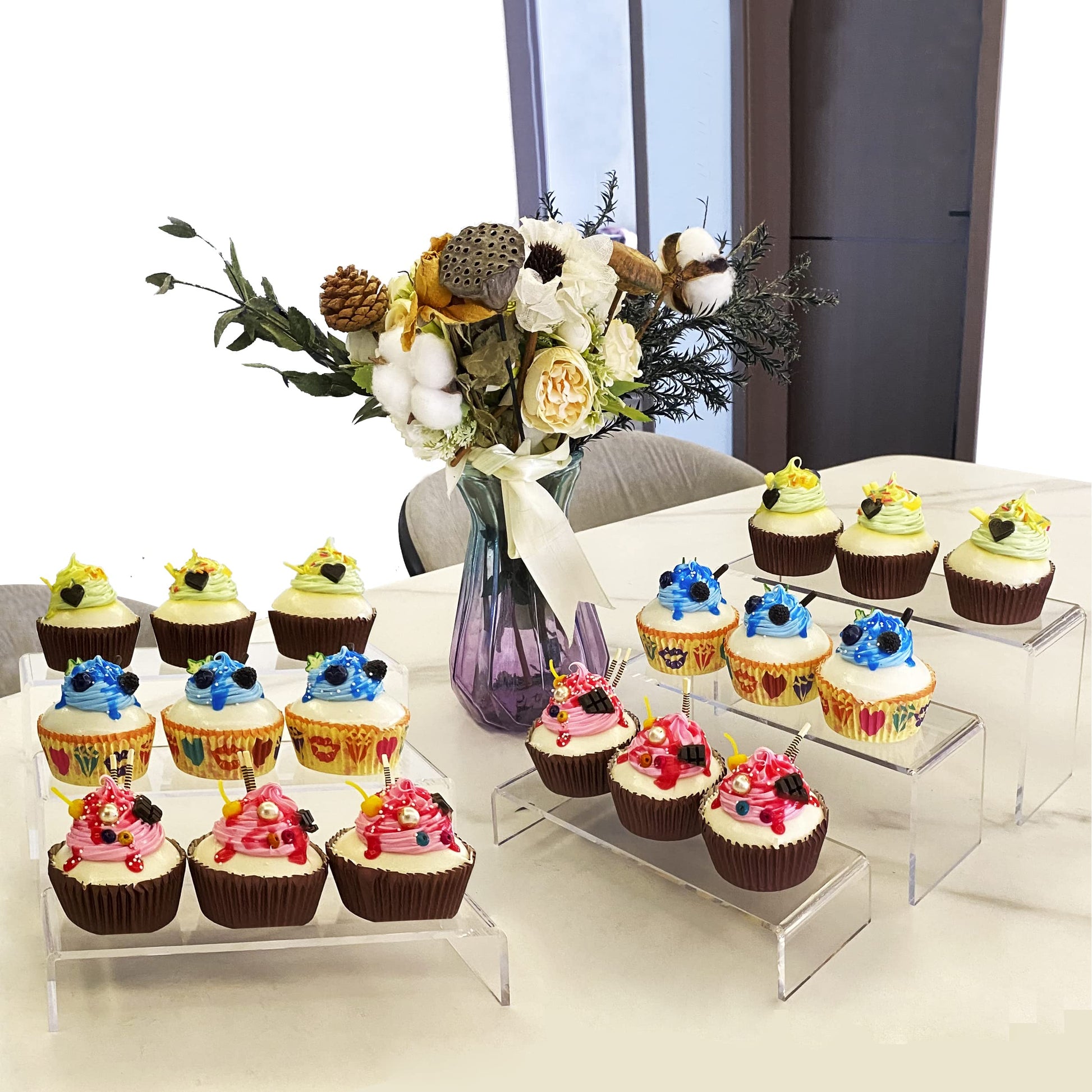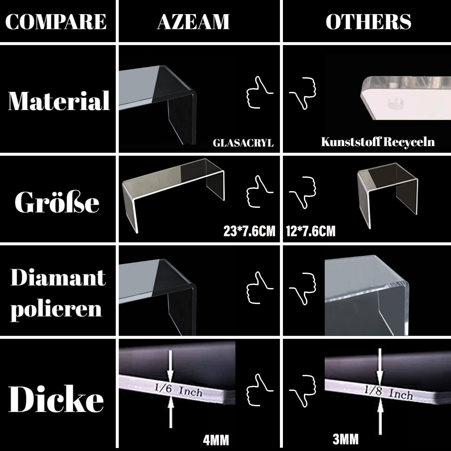 ["100% transparent stand, crystal clear, beautiful, over 20 cm long, 7 cm wide, large storage capacity and excellent load-bearing capacity, durable and sturdy.","Thickening treatment, 4 mm thick plate, exquisite craftsmanship, plate laser cutting, diamond polishing edge. Compared to most 3 mm thick brackets on the market, it carries better, does not fold easily, and is stronger and more structured.","Dimensions: Length, Width and Height: large size (2 pieces): 23 x 7.6 x 11 cm medium size (2 pieces): 22 x 7.6 x 7 cm small size (2 pieces): 21 x 7.6 x 4 cm. Total of 2 sets of three. Total of 6 packs. The outer carton is individually packed in a carton to ensure that the surface is not scratched and the product is not damaged or broken.","No need to assemble, just tear off the protective film on the surface to get a ready-to-use transparent rectangular acrylic stand set. Reusable and easy to clean.","Wide range of applications, the display stand can be used to display Funko Pops dolls, perfumes, cosmetics, nail polish, books, jewelry, cupcakes, snacks, cookies, small collectibles, shoes, and anything else you want to display. Can be placed in antique cabinets, retail stores, wedding celebrations, tea parties, dining room cabinets, showcases, and fairs. Beautiful and tasteful.","Tips: To protect the transparent and smooth surface from damage and scratches, there is a protective film on the front and back of the product. Please remove the protective film on both sides before use to ensure the transparency of the stand.","If you have any questions about our products and services, please contact us. We will definitely offer you the best quality service and after-sales guarantee."]