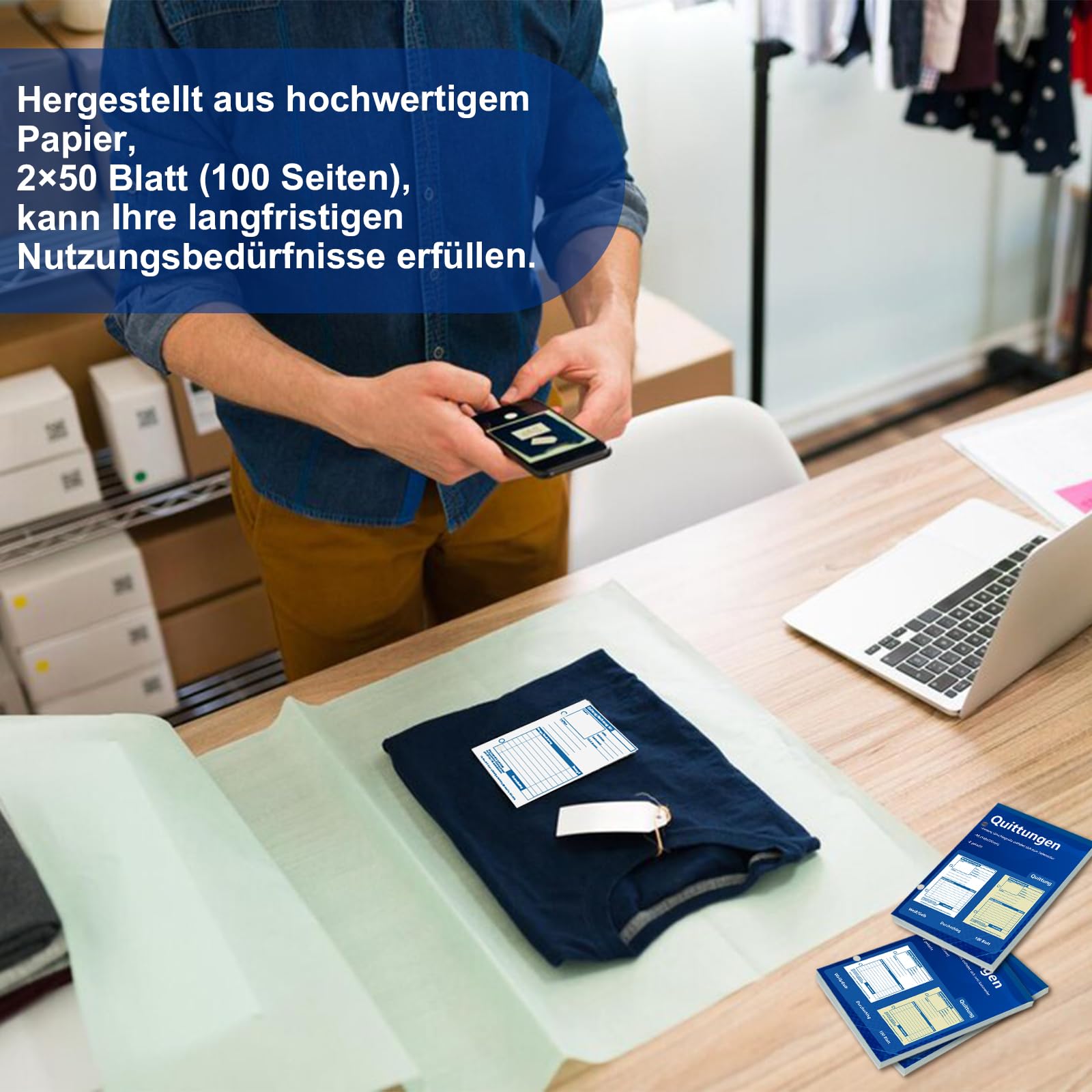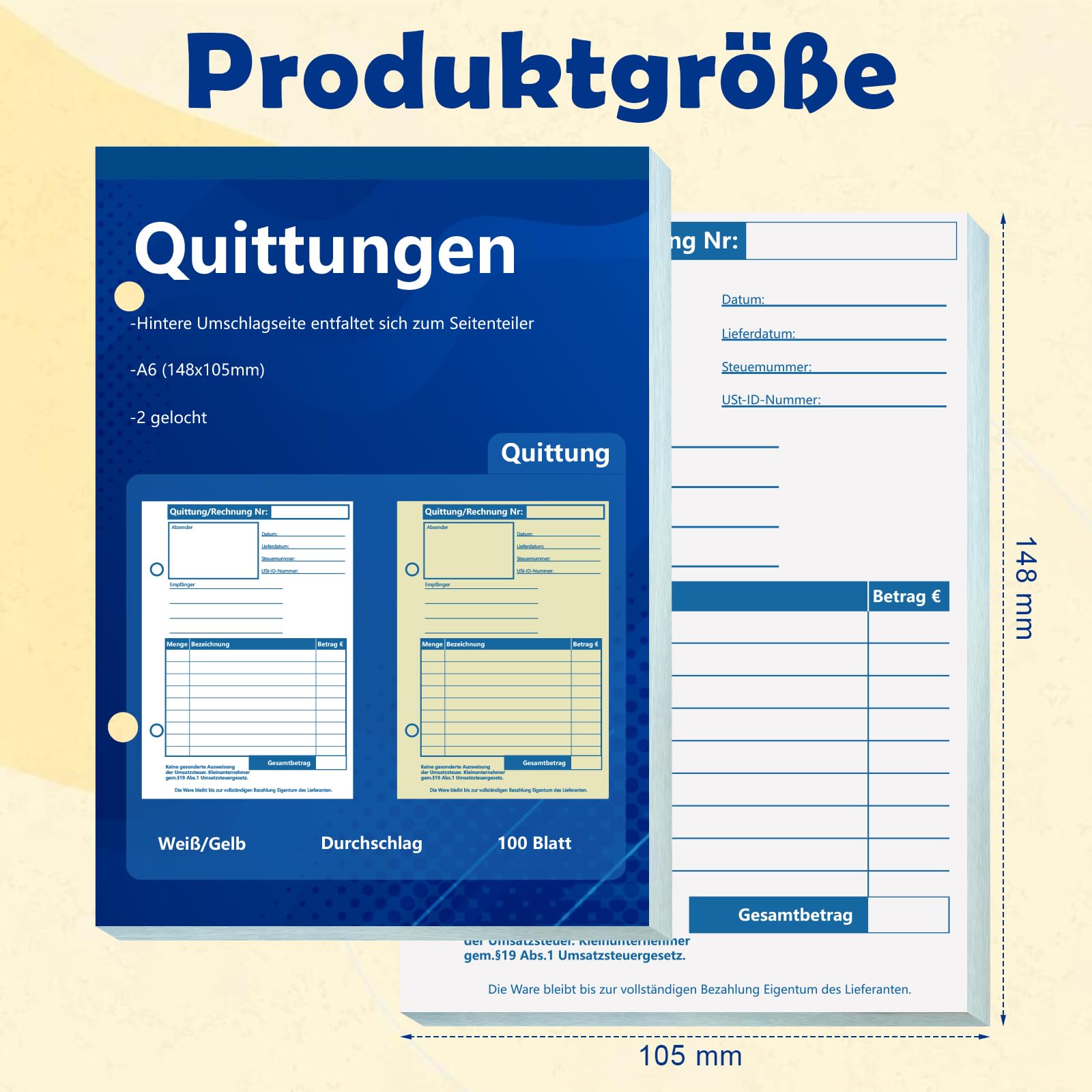 ["The lower portion of our receipt book may need to be moved forward when in use to cover the writing area.","【How to easily and completely detach the receipt?】 Before detaching, pull apart the cover and inner pages until the seal at the top of the receipt book is visible. After detaching, you can easily tear off the inner side of the receipt.","【Practical Dimensions】: Our receipt pad is size A6 with specific dimensions of 105 millimeters x 148 millimeters, making it easy to carry and store. Additionally, there are two 6mm diameter holes on the left side, allowing you to hang it on wall hooks, drawer handles at the counter, or keychains for easy access and note-taking.","【Archivable Records】: Our invoice pad consists of two copies and provides you with a carbon copy pad that automatically creates a duplicate while writing. This allows you to document each transaction separately. You can keep a copy of the receipt book as a record and hand over another copy to the customer as a receipt.","【Selectable Quantities】: This A6 receipt pad is made of high-quality paper and features a glossy cover. The surface of each page is very smooth, making it easy to write on without tearing easily. Each receipt pad contains 2×50 sheets, totaling 100 pages. Furthermore, we offer various quantity options so you can choose based on your daily needs. This receipt book will serve you as a reliable tool in the long run.","【Customized Use】: Our receipt pads are designed with multiple thoughtful sections where you can freely write numbers or categories, as well as other information about products or customers. This flexibility allows for effortless daily recording and smooth transaction processing. Finding the receipt book and managing your accounts will not only be easier in the future, but also much more efficient.","【Wide Application】: You can easily tear off the receipts along the perforation line, which is simple and quick. This practical design makes them ideal for a variety of business and transaction types. Whether for small businesses, restaurants, service providers, or clubs, these receipt books offer the flexibility and efficiency you need. They are an essential tool to help you issue neat receipts and smoothly process your transactions."]