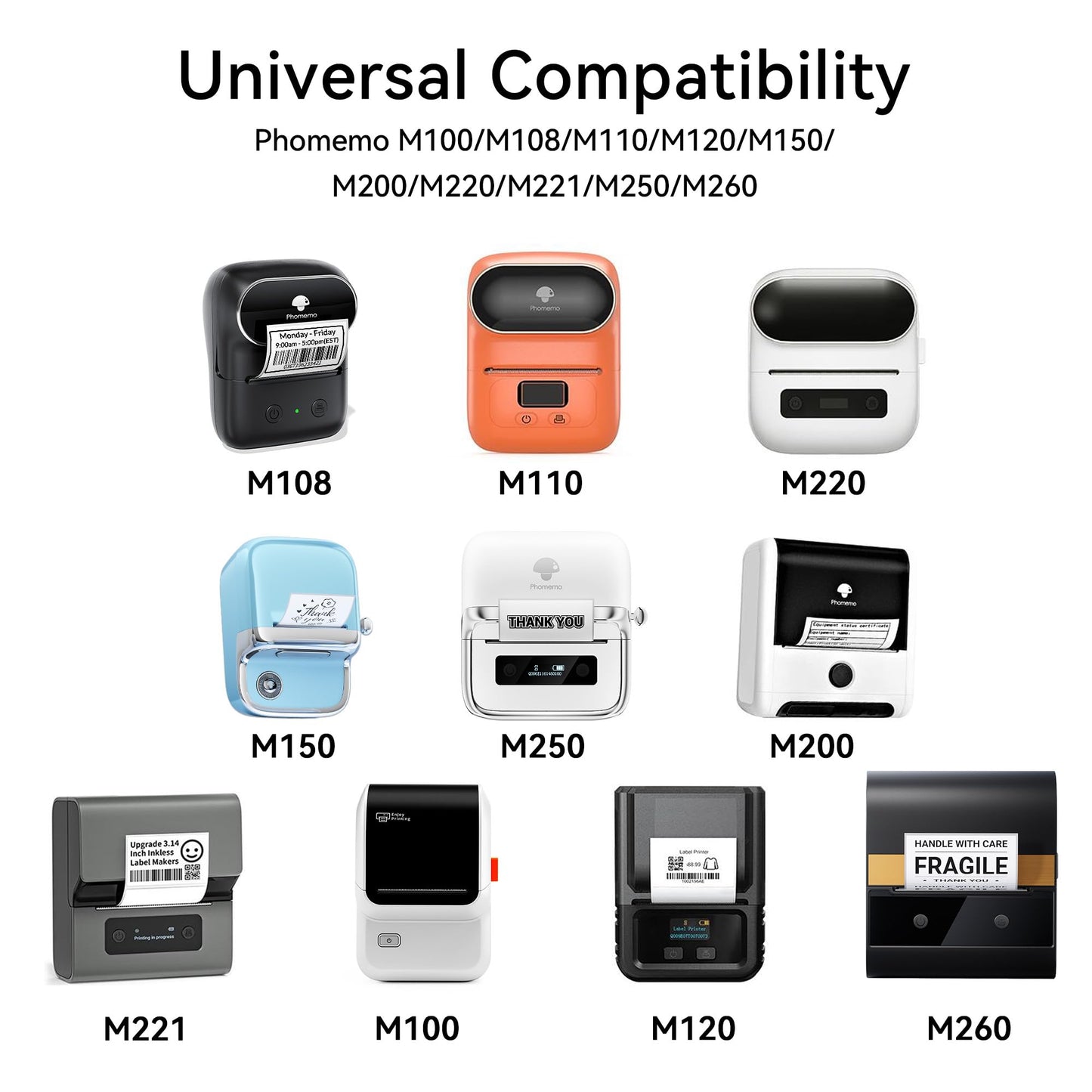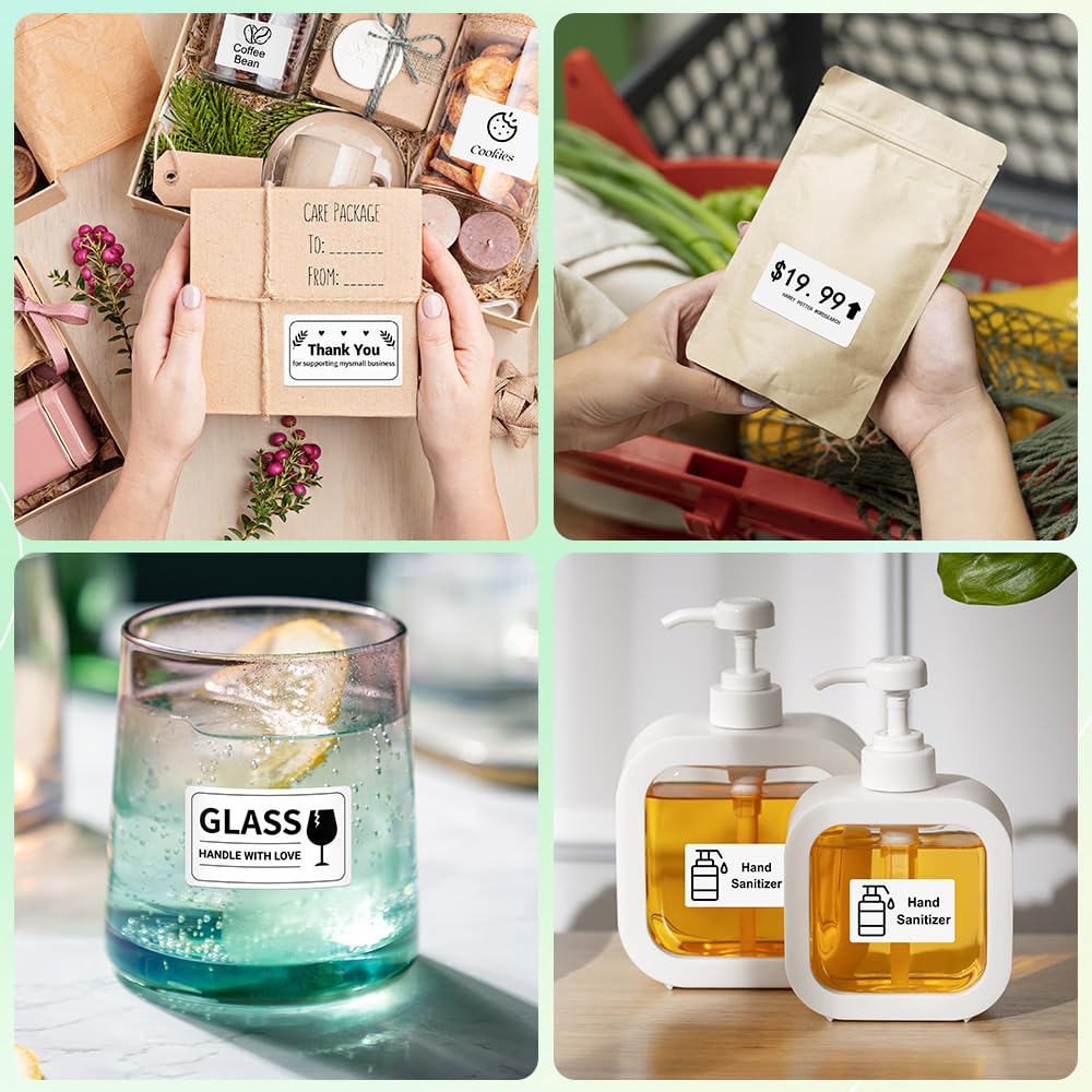 ["Details: 1.96\" x Length: 1.18\", Quantity: 6 Rolls, 230 Labels/Roll, Color: Black on White. Tips: Please extend the paper in the direction indicated by the arrow on the paper for about 1-2 circles, and then tighten or clamp the holder", "100% compatible: Compatible with Phomemo M110/M120/M200/M220/M221/M100/M108 label printers. Works with thermal label printers using black on white sticker paper", "Strong practicality & easy to peel: The thermal paper can be used both indoors and outdoors, such as for organizing your kitchen and documents, as well as labeling your items. There is also a specially designed cutting line to make it easier to peel the paper", "No ink or toner required: No ink is required as your Bluetooth label device is a thermal direct printer, saving money. Perfect for home or office organization. and save money", "Widely used: The high-quality label tapes adhere to plastic, paper, metal, wood, and glass, making them ideal for labeling office supplies, electronic accessories, tools, kitchen items, garage equipment, containers, pantry shelves, storage boxes, personal items, crafts, gifts, files, and more, to identify and quickly organize items"]