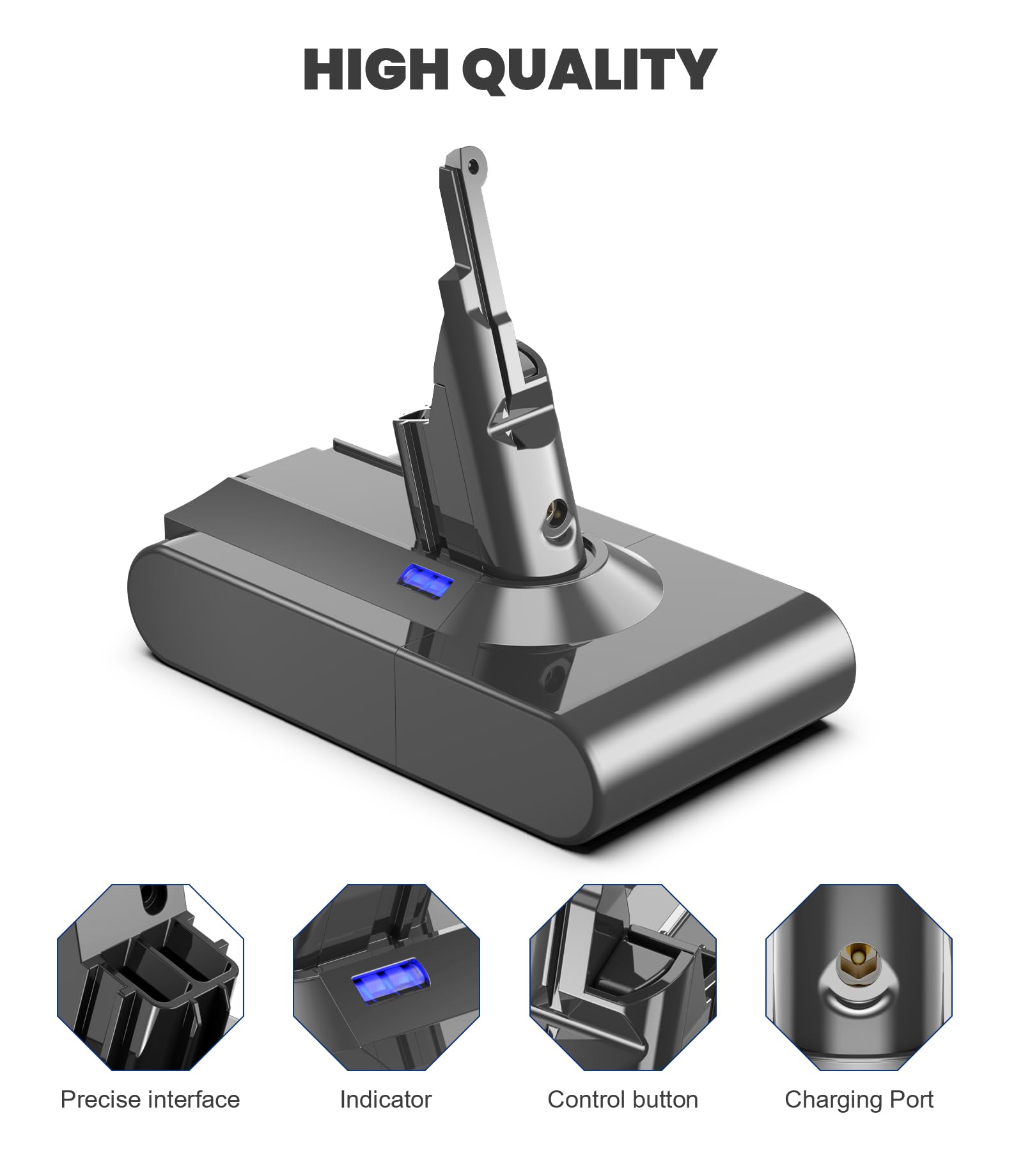 "6000mAh battery for Dyson v8 provides a high capacity of 6.0Ah and a voltage of 21.6V for long runtime and strong suction.