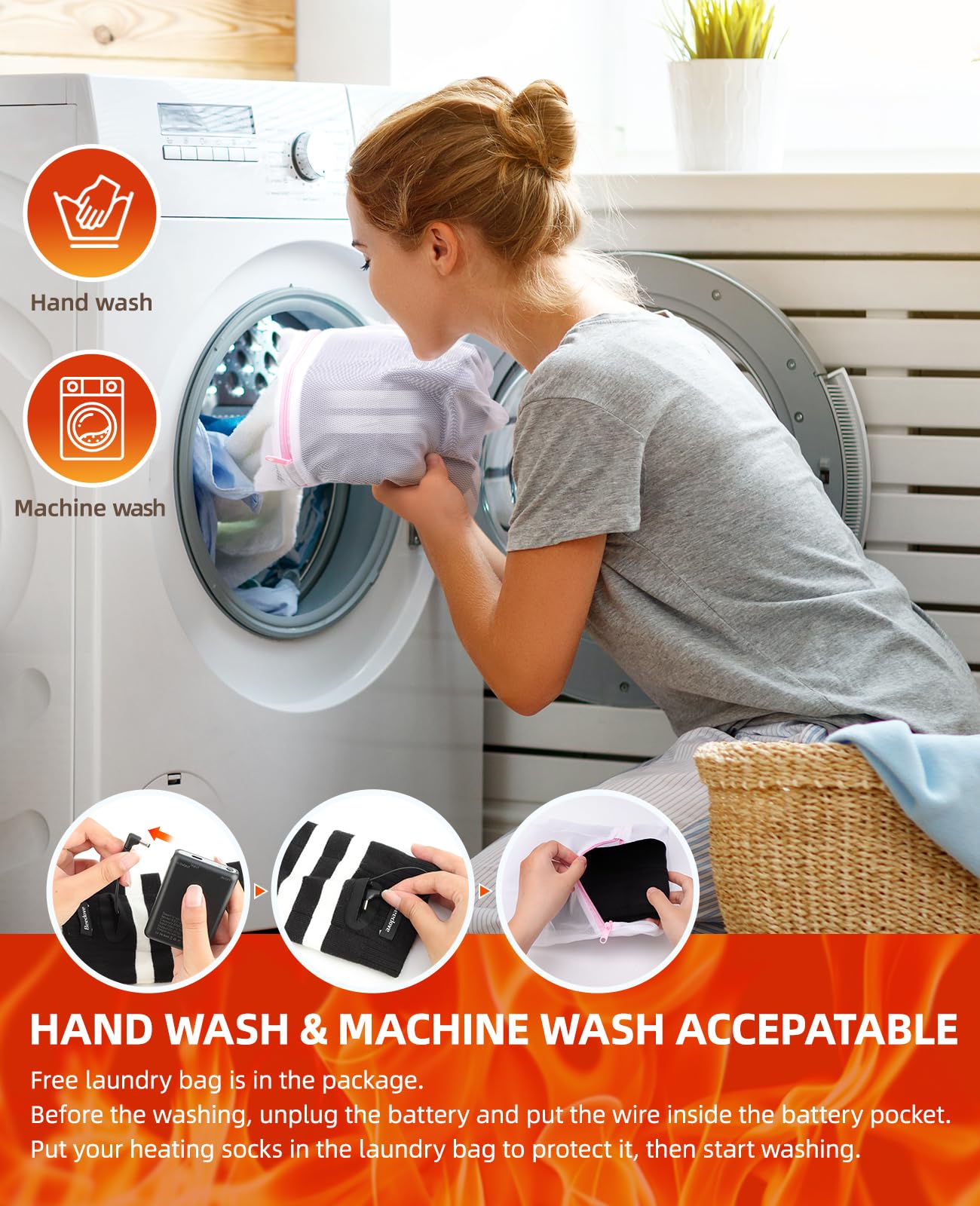 π₯["2024 Upgrade Heated Toe Design"] Conventional heated socks tend to only warm the sole area of the foot, but our improved heated socks have added a design to cover the toe area, making the heating area more extensive. The upgraded design more effectively increases the overall temperature of your feet and provides you with more warmth in the cold winter months. π₯["Large Capacity Battery and 4 Heating Levels"] 5V 6000mAh high-capacity battery meets your needs for long outdoor activities and can be used for a long time without frequent recharging. Electric heated socks are available in 4 temperature levels up to 149Β°F, high temperature (3.5-4H), medium-high temperature (4-5H), medium temperature (6-7H), and low temperature up to 9 hours. Note: These data are from tests with this product in a cooling chamber at -10Β°C. ["Multilayer Material and Fast Heating"] Our battery heated socks use multiple layers of materials to retain heat and provide a comfortable experience. Combining ergonomic design and endothermic rings, they are comfortable, breathable, and durable. They heat up quickly in 20 seconds to ensure your feet stay warm in cold weather. Heated socks in universal size for women and men EU 36-43. π₯["Winter Warmth Essential"] Whether you're relaxing indoors or outdoors in winter, this foot warmer gives your feet the warmth they need. Ideal for winter outdoor enthusiasts, allowing you to enjoy fishing, skiing, camping, hunting, mountaineering, hiking, or working outdoors, it is also good for people with Raynaud's and arthritis. Our heated socks are the perfect warm gift for Thanksgiving, Christmas, and Valentine's Day. π₯["Customer First"] For convenient washing, we provide a laundry bag as a gift to ensure that the heated socks are both hand and machine washable. We offer a 60-day full refund and a one-year product warranty, please feel free to contact us if you have any problems.
