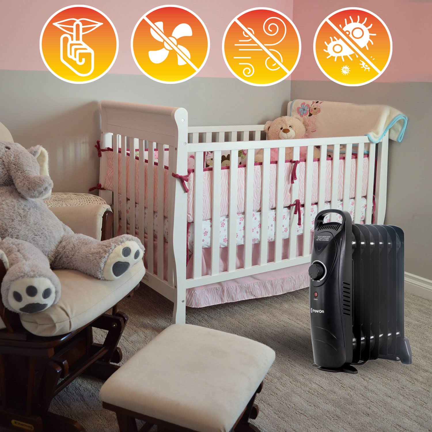["600W POWERHOUSE WITH LOTS OF POWER - Mobile electric heater with 7 fins: Perfect as a space heater for apartment, conservatory & RV - the electric heater provides cozy warmth everywhere.","ENERGY SAVING THANKS TO HEAT STORAGE - Radiator with stepless thermostat for temperature control: Ideal for small rooms. Since oil cools down slowly, oil radiators remain warm even after shutdown.","GERMAN BRAND BASED IN COLOGNE - Mobile electric heater with electric thermostat - approx. 30.2 x 13.5 x 38 cm. PowOn radiators naturally meet all regulations of the German legislator.","INTEGRATED OVERHEAT PROTECTION - Safe electric heater with indicator light and protection against overheating. As an additional heater in the living room or oil radiator while camping: You can heat precisely.","ECONOMICAL, LIGHT & QUIET - Mini radiator with German operating instructions. Our portable heater not only consumes little energy, it is also extra flexible thanks to the carrying handle - Weight only approx. 3.7 kg."]