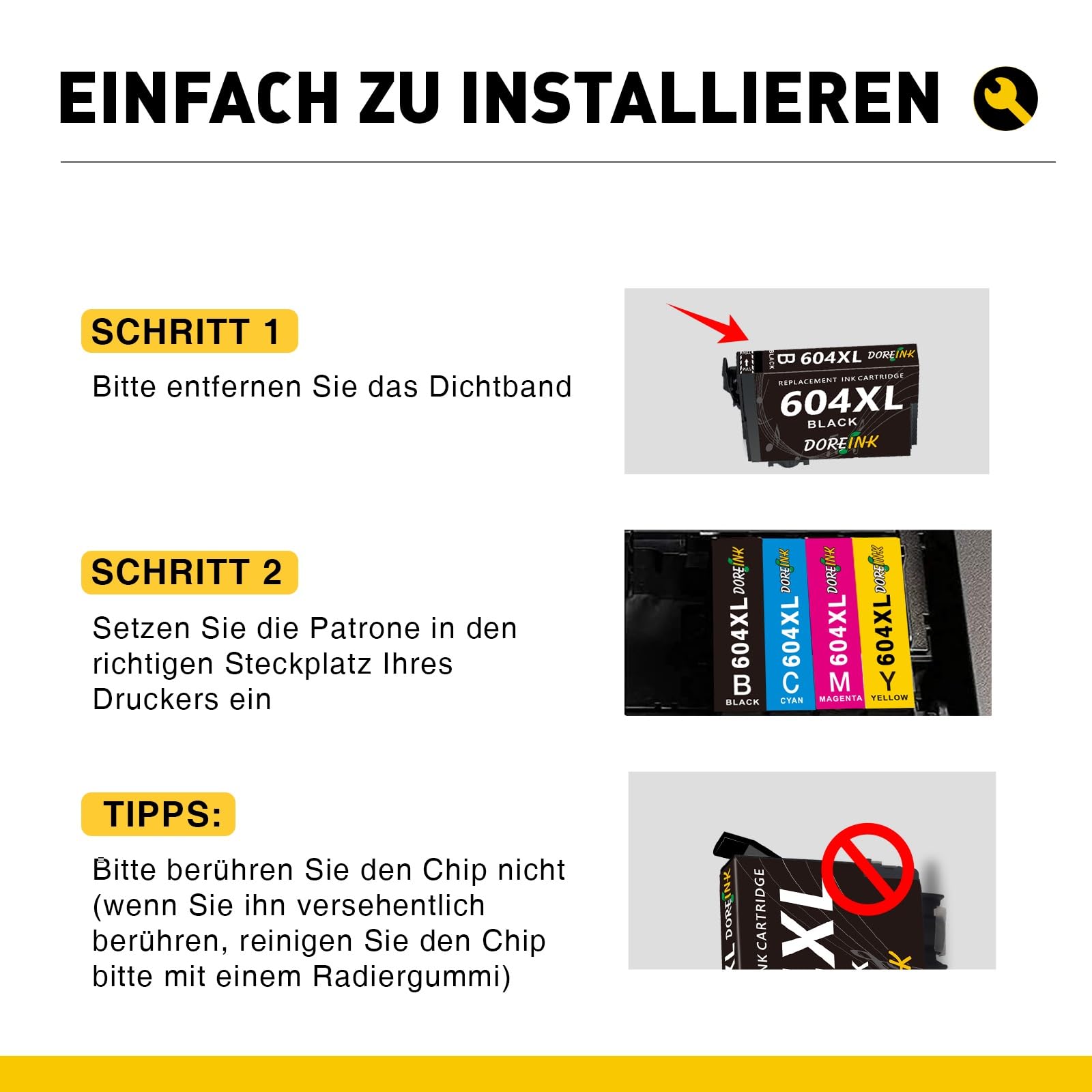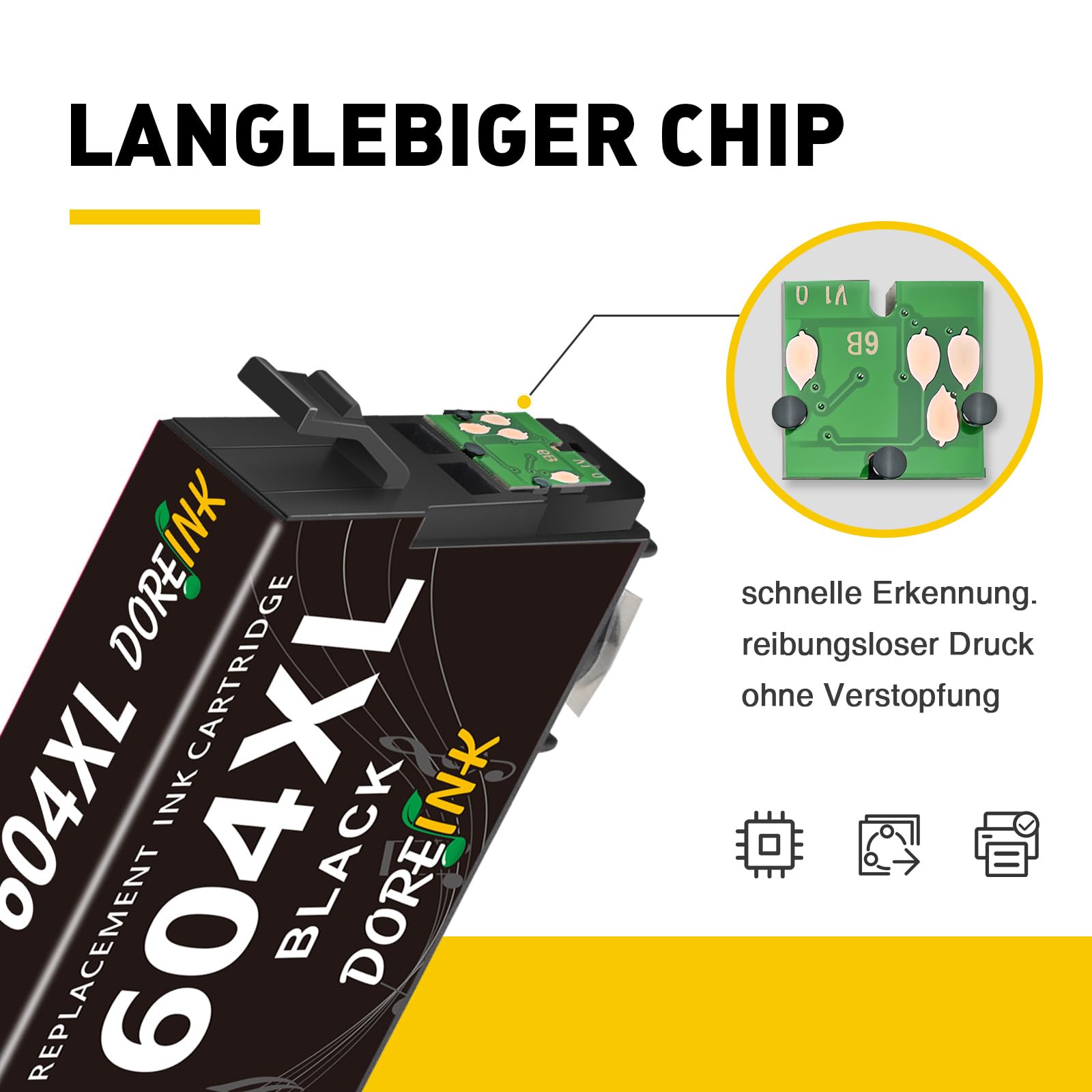 ["With the compatible DOREINK 604XL cartridges for Epson 604 cartridges, the chips are quickly recognized and ensure smooth, clog-free printing. long print duration very good, color like new. You will receive high-quality prints, lifelike and natural.","For all home printing needs: Whether it's editing homework for your children, creating high-quality contract documents for your father, or printing vividly colorful and detailed photos for the whole family - our DOREINK 604XL ink cartridges for Epson xp 3200 cartridges are the ideal partner for all your home printing projects.","604xl Cartridges for Epson printer cartridges 604: DOREINK 604xl cartridges for Epson are equipped with the latest chips and are compatible with Epson Expression Home XP-3200 XP-2205 XP-2200 XP-3205 XP-4200 XP-4205, Epson Workforce WF-2910 WF-2930 WF-2935 WF-2950, Epson Workforce WF-2930DWF WF-2910DWF WF-2935DWF WF-2950DWF printers for faster recognition and better compatibility.","Package contents: 3 Black, 2 Cyan, 2 Magenta, 2 Yellow, 9-pack compatible ink cartridges as a replacement for the Epson 604XL Multipack. (NON-Original).","Page yield: approx. 500 pages per black 604XL cartridge, 350 pages per color cartridges. (5% coverage)"]
