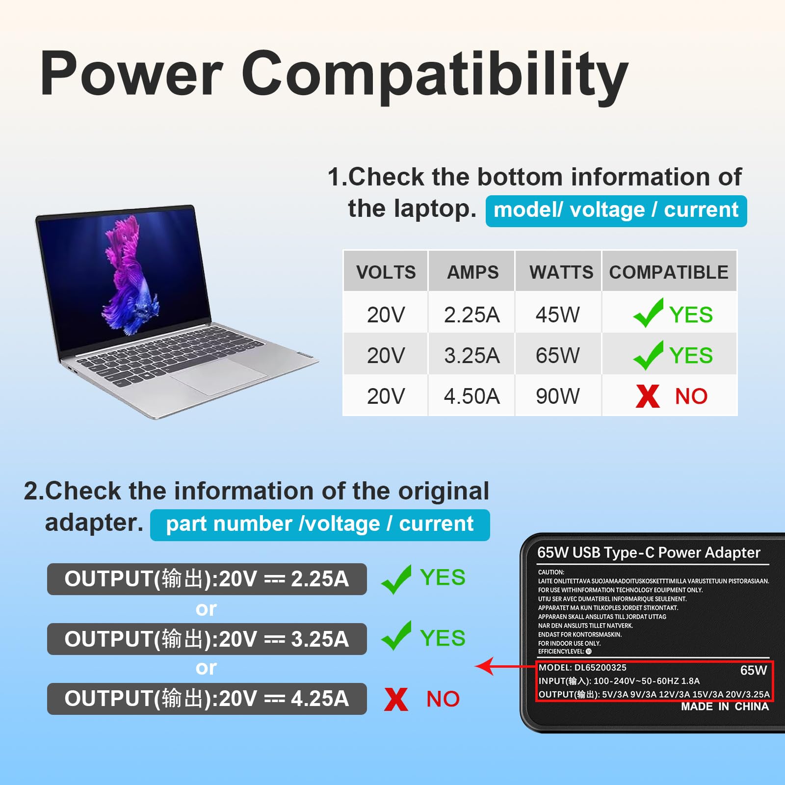 "⚡【65 Watt USB C Laptop Charger】Input: 100-240V~50/60Hz Output: 65W 20V-3.25A/15V-3A/12V-3A/9V-3A/5V-3A (Compatible with 61W,45W, 36W, 27W, 15W) Interface: USB C Type C Applicable Type: Can charge most smartphones, laptops, and tablets that support the USB-C interface.