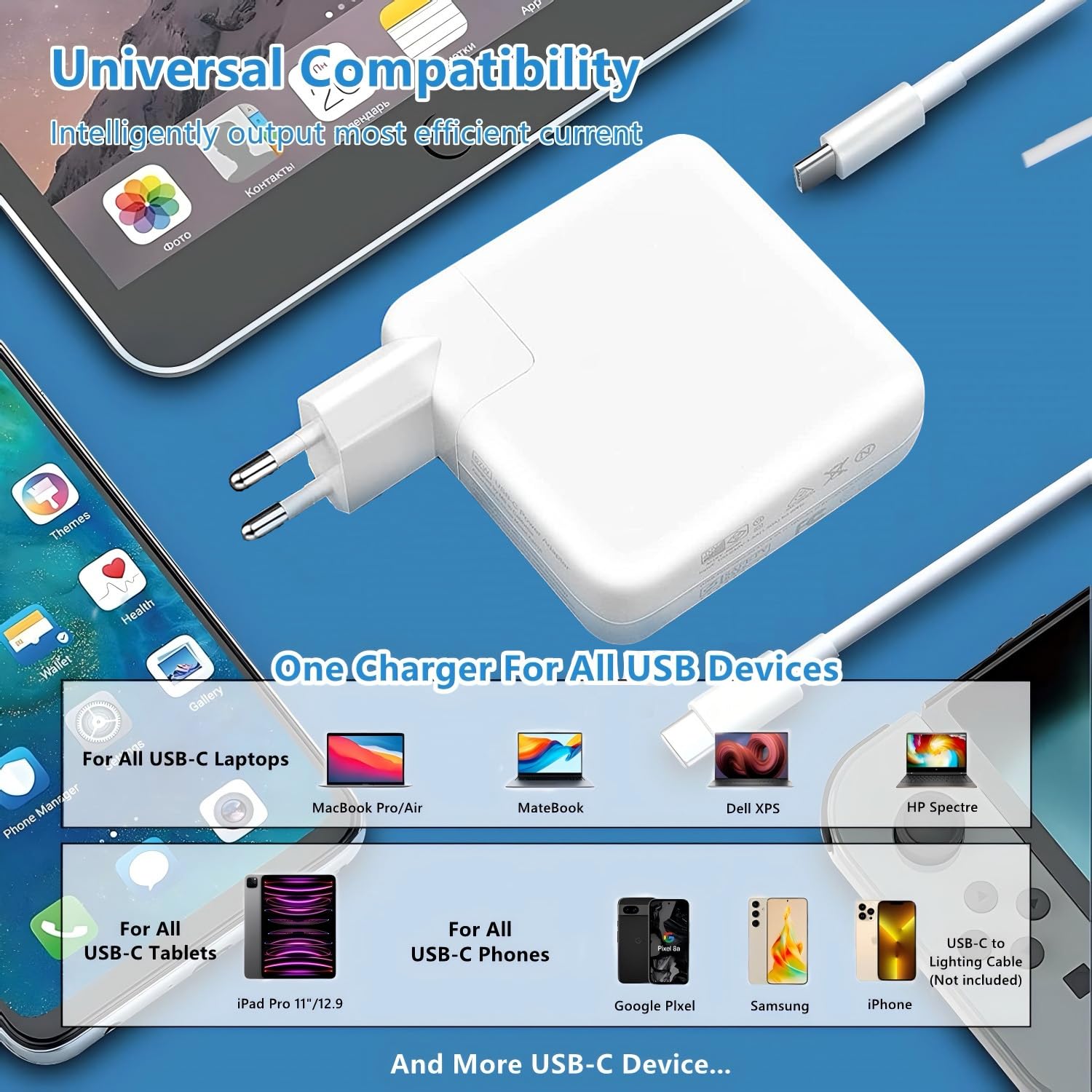 ["【Wide Compatibility】67W USB C Charger Compatible with MacBook Pro 13/14/15 inch M2 M1, MacBook Air 13 inch 2024 2023 2022 2021, Compatible with iPad Pro 12.9/11 inch (2020/2018) and Compatible with iPad Air 10.9 inch (2020), and all USB C interface devices, laptops, and Android phones. Package Content: 1*67W USB-C charger for Mac Pro (including a 2-meter long C-USB-C cable)","【Super Fast Charging】Full charge for MacBook Pro 13 inch in just 1h 45 min. Fast charging supports the high-speed processing capacity of M2, M1, M1 Pro, and M1 Max chips, USB C supports intelligent power of 67W, 65W, 61W, 45W, 30W, 29W, 25W, and 20W according to your MacBook, Lenovo, HP, HP Spectre, Huawei MateBook, Dell Laptop.","【Superior Safety】Each of our chargers has undergone professional technical tests before shipment to ensure excellent performance and safety. The built-in IC chip technology provides protection against overload, short circuit, and overheating, so you don't have to worry about damaging your devices. Made of thicker copper wire to support a maximum power of 5A 100W and 480Mbps data synchronization","【Compact Size】: The charging efficiency of this 67W USB-C charger is higher than that of the original charger. The ultra-long USB-C to C cable allows you to easily charge your laptop or Android phone, whether you are working or lying in bed. We have also added a detachable plug to achieve a more compact size that is convenient for you to take with you when you go out.","【Customer Service】Qiyezinuo provides very good customer service. Please buy with confidence. We have always been committed to offering products of the highest quality at unbeatable prices, and believe that our products will bring you a pleasant experience. If you have any questions about the products, please contact our customer service by email. We will reply to you within 24 hours."]