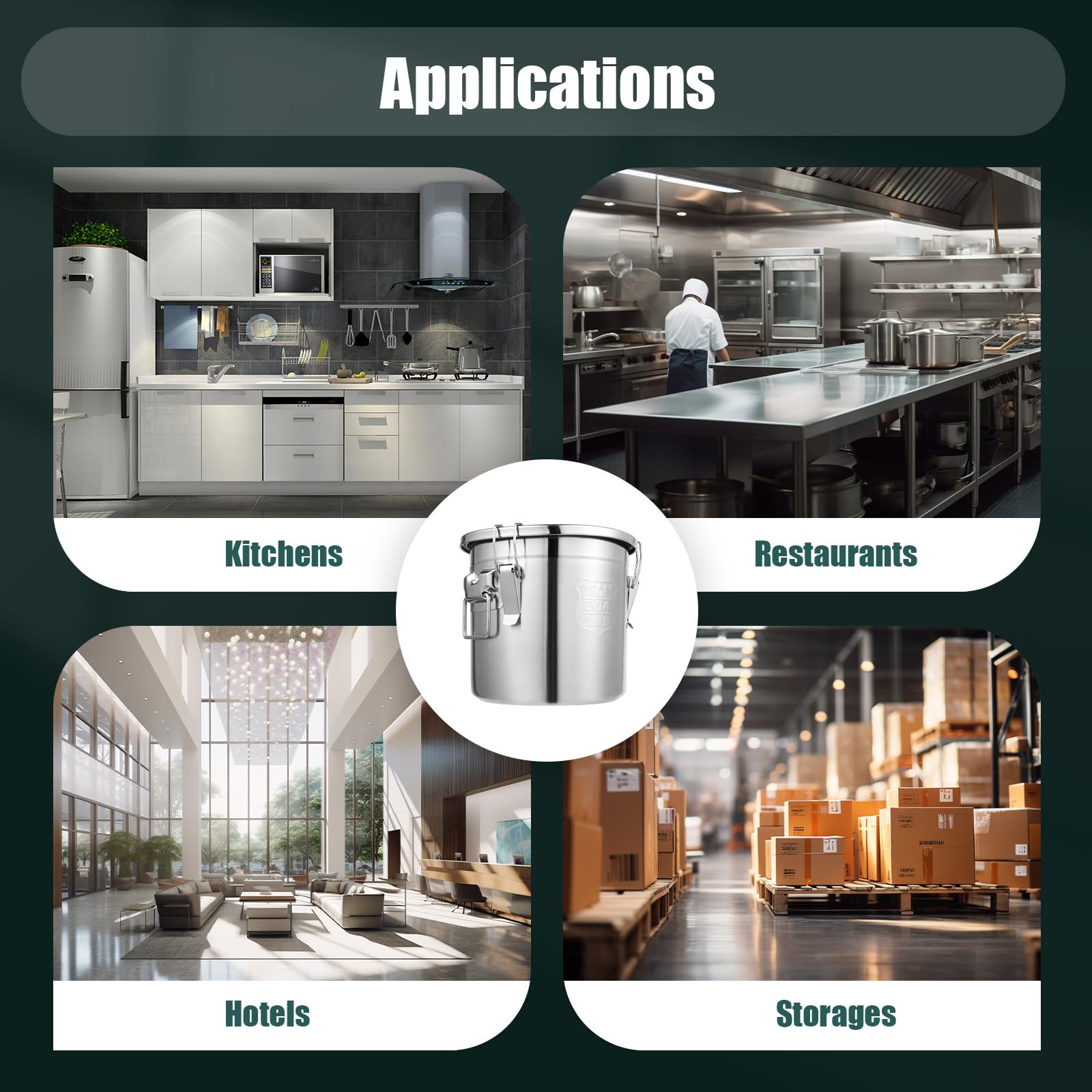 ["High-quality stainless steel: Our 6L stainless steel kitchen bucket is made of high-quality stainless steel, ensuring durability and longevity.","Convenient storage solution: This grain container is perfect for storing flour, grains, and other dry goods in your kitchen. Its spacious 6L capacity provides ample space for all your storage needs.","Safe airtight lid: The flour container comes with a secure lid that helps keep your ingredients fresh and free from moisture and pests. It ensures that your stored items remain in top condition for longer periods.","Versatile and practical design: The bucket with lid features a practical design with a sturdy handle for easy carrying and transportation. It can be used not only in the kitchen but also for organizing other household items.","Ideal for home and professional use: Our product belongs to the kitchen category and is suitable for both home and professional use."]