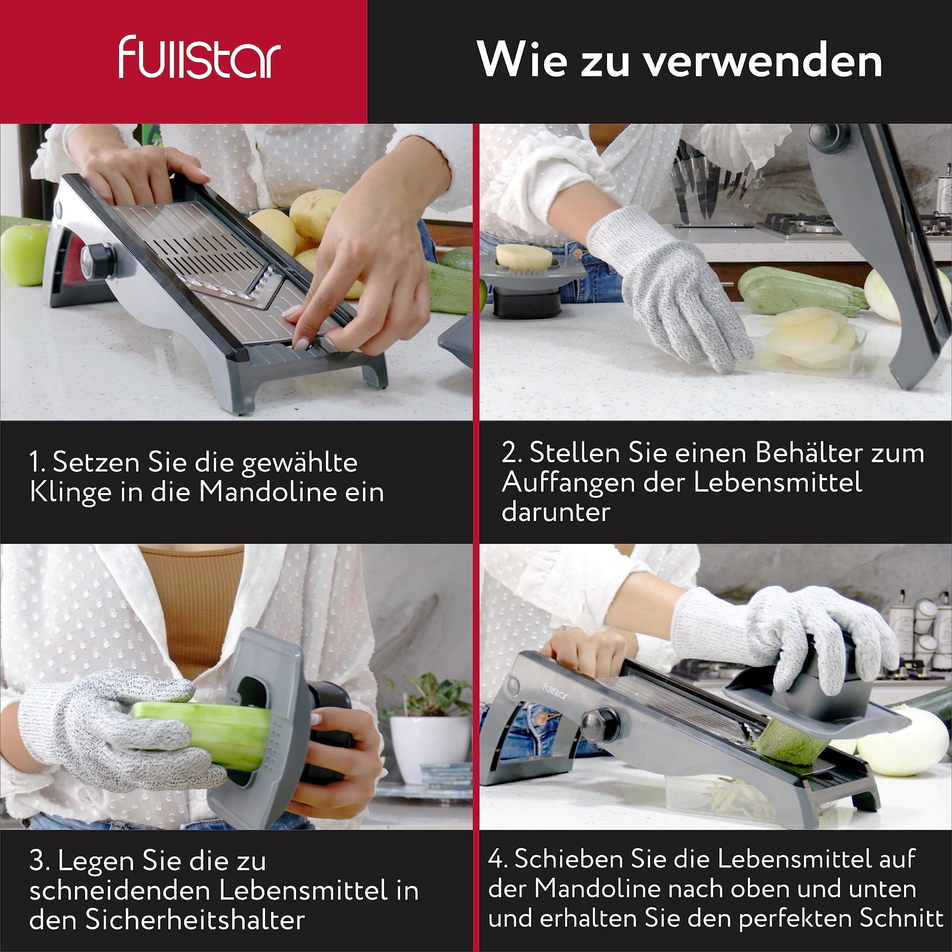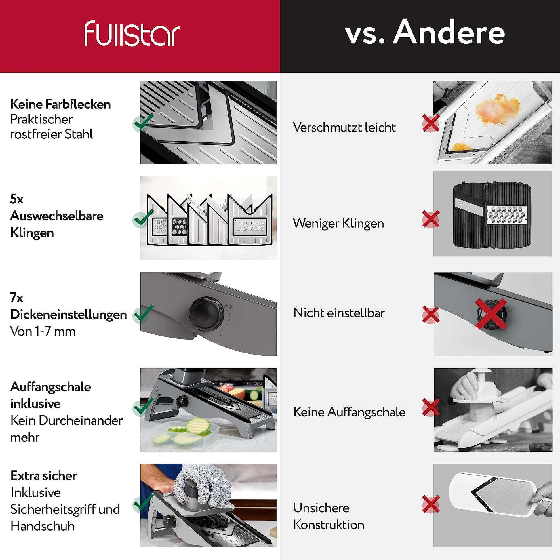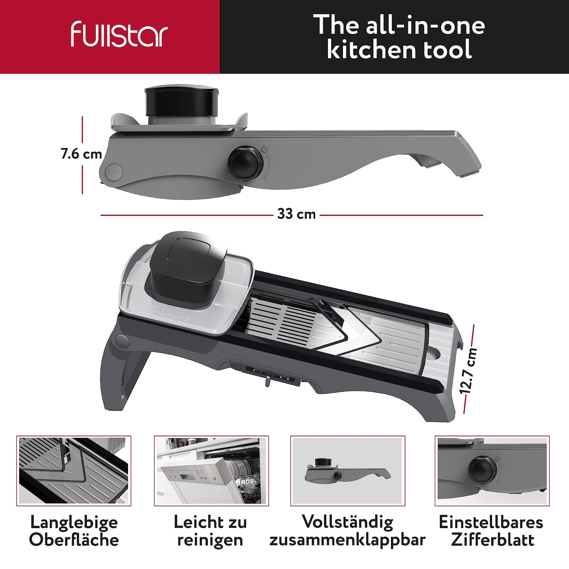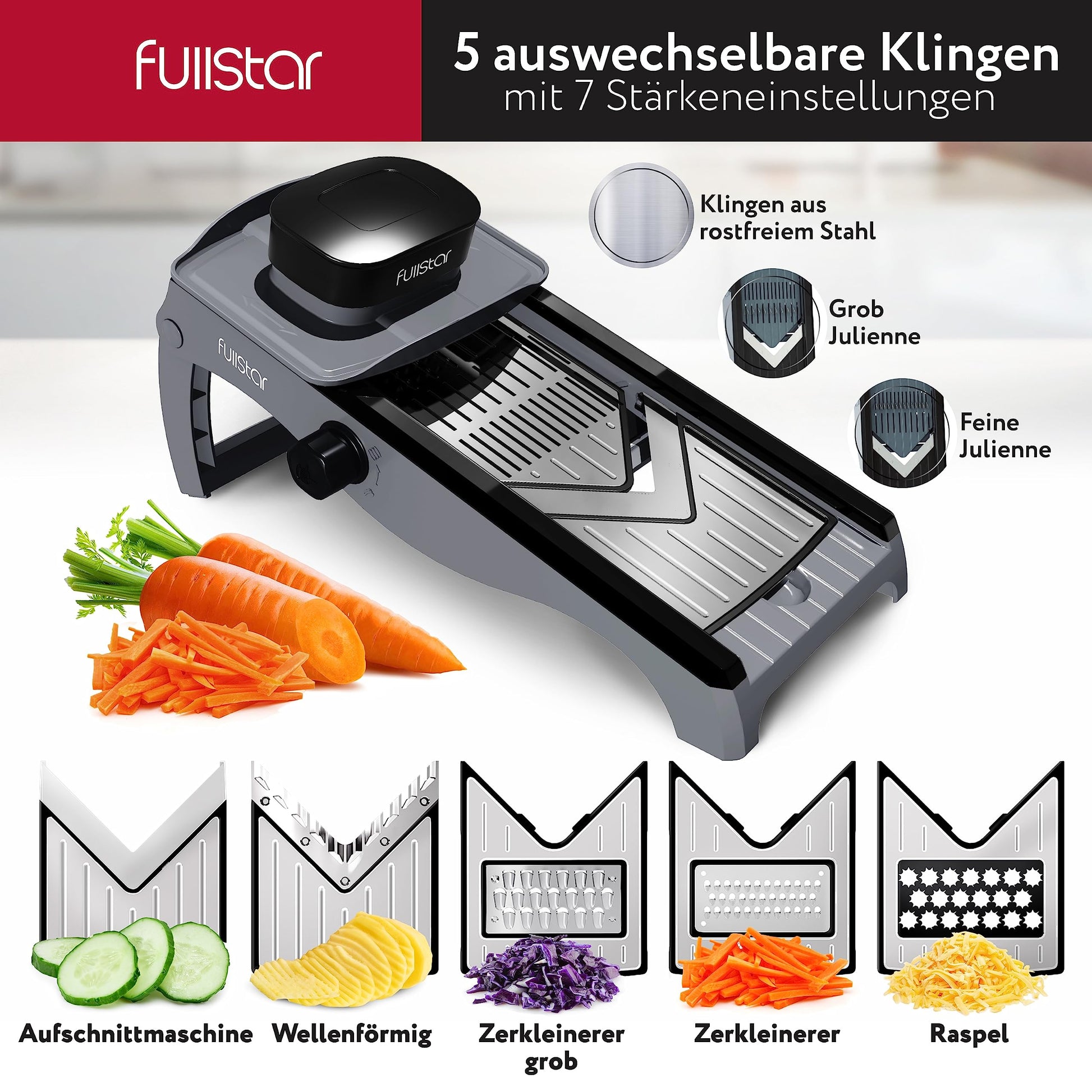 ["Mandoline Slicer with Multiple Blades - Looking for a powerful way to enhance your cooking results? The Fullstar stainless steel mandoline slicer makes cutting fruits and vegetables easier and safer than ever before, and looks elegant in any kitchen.","49 Different Cuts - Looking for a practical kitchen tool? This potato slicer comes with 5 interchangeable stainless steel blades that you can choose from. Discover up to 49 different results by adjusting the width between 1 and 7 mm.","High-Quality Master Slicer - This slicer is made from high-quality, BPA-free, and dishwasher-safe materials and is an absolute must-have in the kitchen. Its sleek design is durable, easy to clean, and store. Effortlessly slice potatoes, onions, and more like a pro chef!","No Mess in Food Preparation - With the catch container of this mandoline slicer, which also serves as a storage place for the blades, the work surface stays clean. When you're done, you can simply clean this 7-in-1 fruit and vegetable slicer in the dishwasher!","Included Bonus Accessories - For a safe cutting experience, the Fullstar mandoline and cheese grater come with high-quality accessories. With a cut-resistant glove, a safety handle, a sturdy, non-slip base, as well as a catch tray and blade holder, you're on the safe side."]