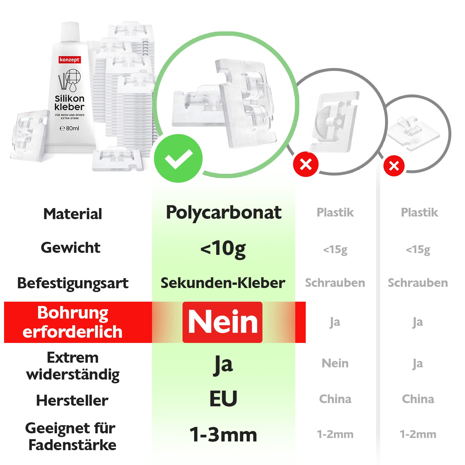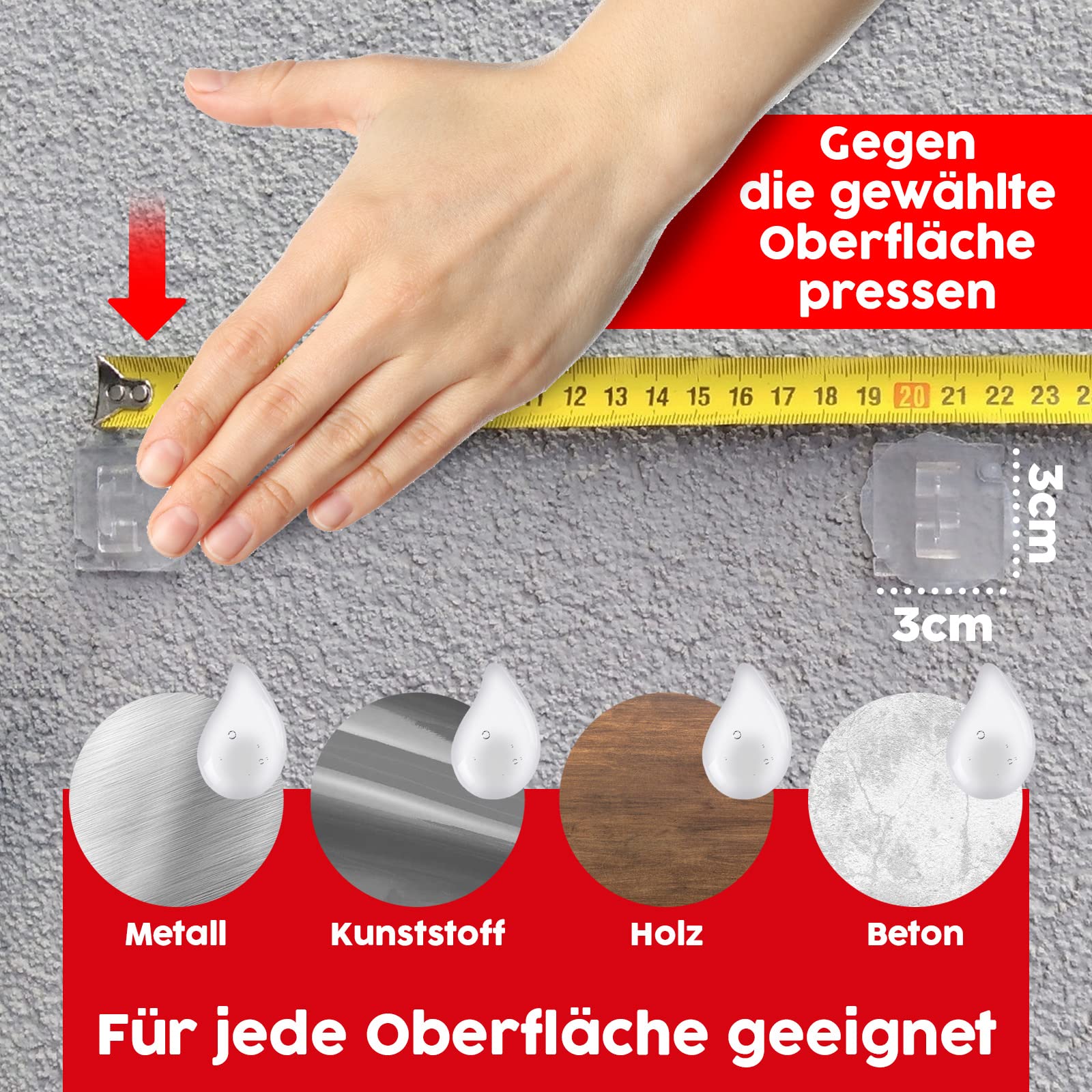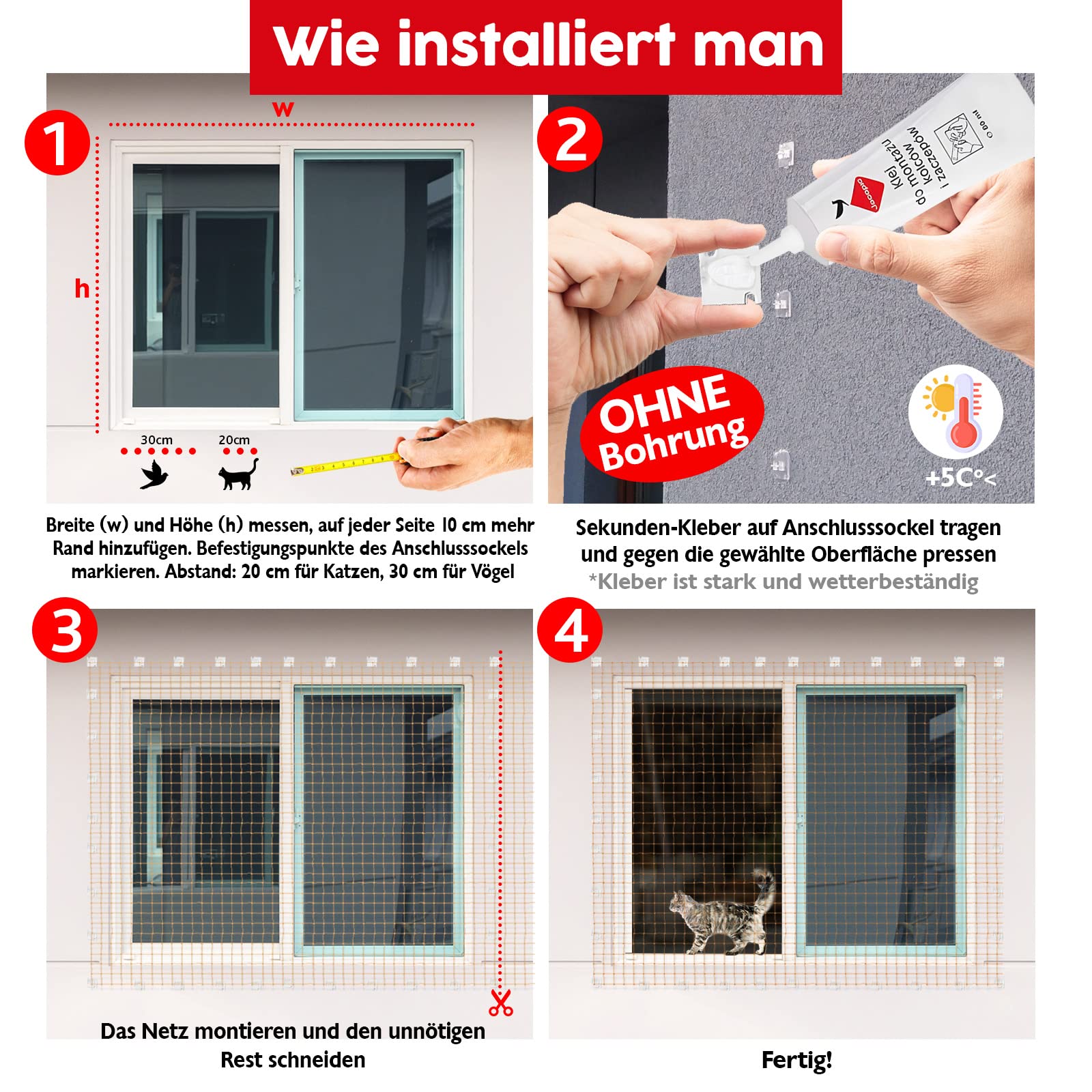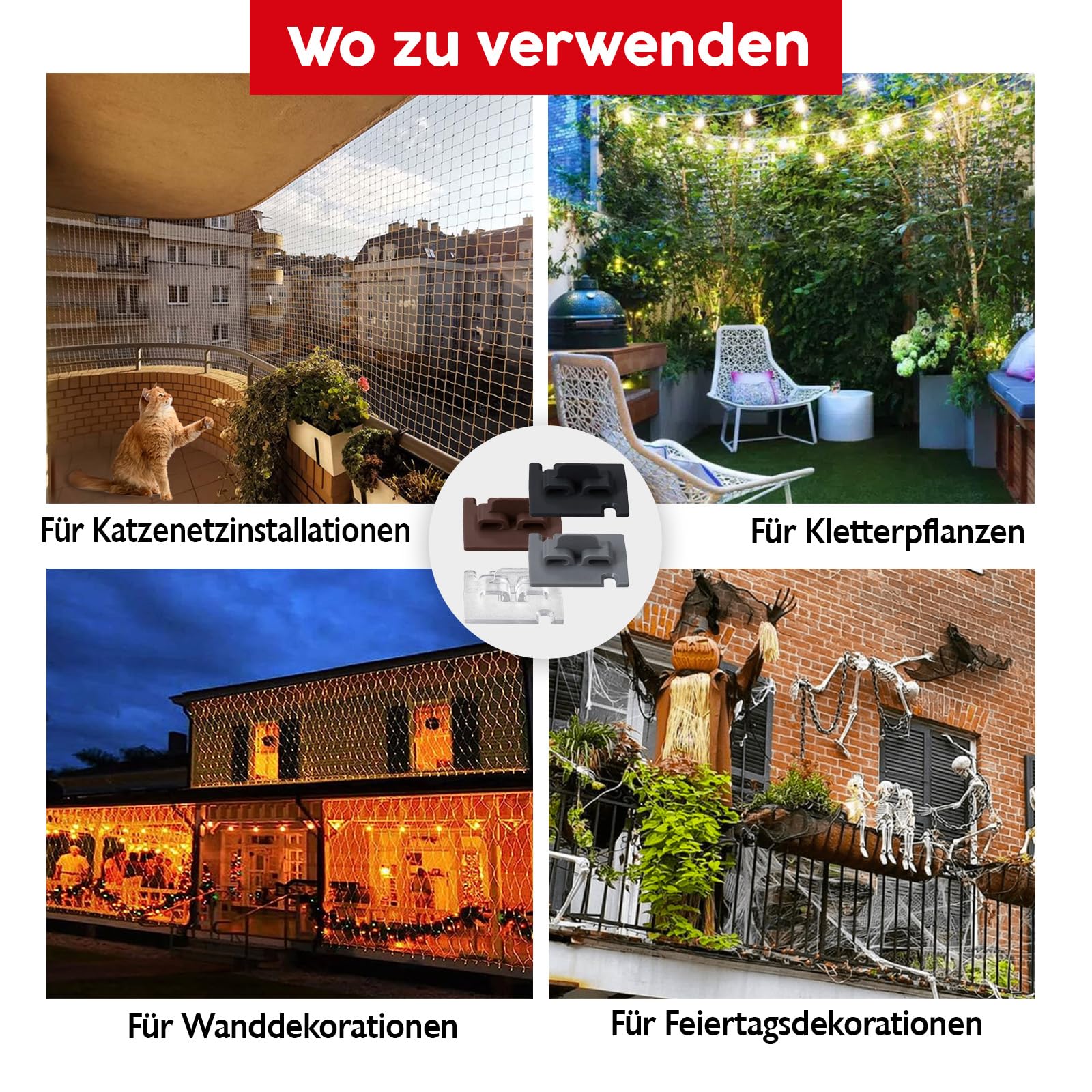 ["EASY INSTALLATION - Our strong adhesive hooks are ideal for attaching cat nets to the balcony without drilling. The set also includes extra strong mounting adhesive. Use the weatherproof, transparent, brown, or black adhesive hooks to secure the cat net on windows, balcony, or terrace. The installation for cat balcony protection is easy and no drilling is required.","VERSATILE APPLICATION - Our adhesive hooks can not only serve as eyelets for attaching cat nets to balcony, pigeon nets, bird nets, but also as fasteners for fairy lights, LED strips, or decorations. The adhesive hooks are ideal for windows and outdoor areas. With the strong adhesive hooks, you create a safe and cozy area for your cat while protecting your balcony from birds.","HIGH-QUALITY MATERIALS - Our hooks for cat nets without drilling are made of durable and weatherproof materials, perfect for indoor and outdoor use. The extra strong silicone adhesive securely adheres to various surfaces such as metal, concrete, or plastic to reliably attach the cat safety net.","CAT PROTECTION FOR BALCONY WITHOUT DRILLING: Cat safety for balcony without drilling - The adhesive hooks are easy to install and can be removed without residue when needed. Ideal for rental apartments where drilling is not allowed. Create a safe and protected area for your cat without damaging your apartment.","FLEXIBLE AND ADAPTABLE - Our adhesive eyelets for balcony are available in different colors and can be mounted on various surfaces. The attachment is compatible with various balcony and window sizes and is also suitable for use as a pigeon net or bird protection net."]