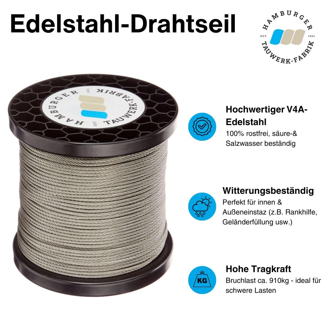 "✅ Easy processing - Thanks to the medium-flexible wire rope construction, it is easy to cut, crimp or connect with wire rope clamps - ideal for professionals & DIY enthusiasts.",
