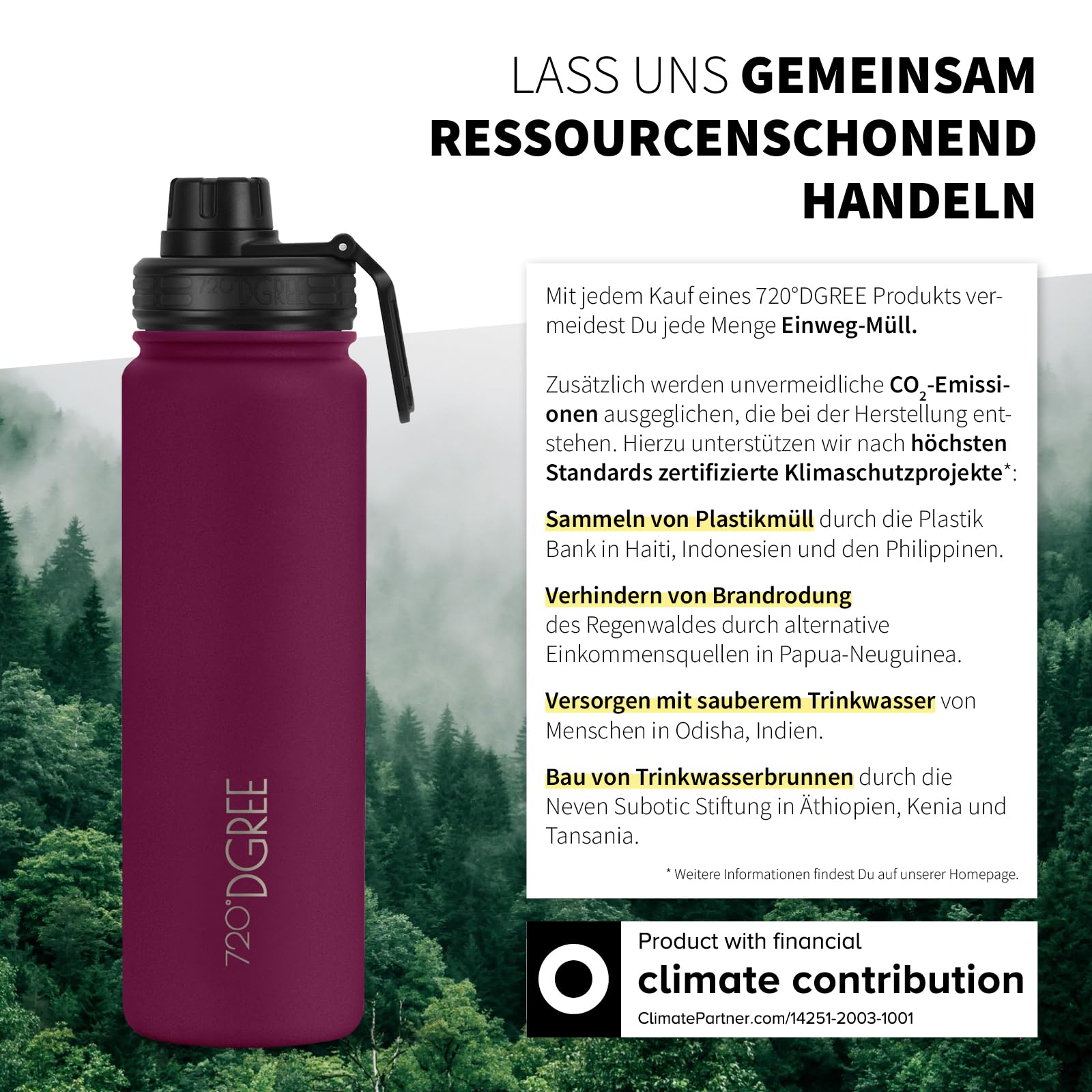 "FOR THE SAKE OF OUR ENVIRONMENT - With the reusable and very durable \"noLimit\" stainless steel water bottle, you actively contribute to reducing waste production from disposable bottles. This way you protect nature in the long run and even save money. Spare parts and other variations can be found in the 720°DGREE store.",
