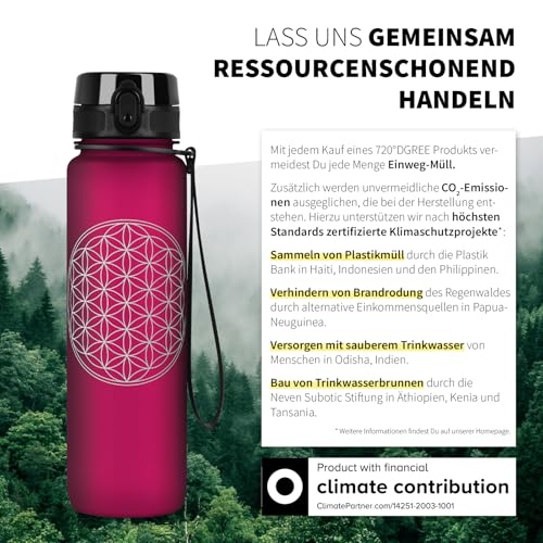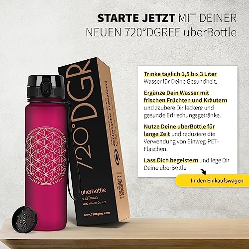 ["INDIVIDUAL LIKE YOU - Discover the \"uberBottle\" anew: The absolute eye-catcher with various, great and inspiring designs. Additionally with a motivating scale. With the two scales, you always have your daily drinking progress in view and at the same time the motivation scale helps you to reach your drinking goal every day. Perfect for home, office, on the go in nature or while traveling. But also ideal as a gift!","💧 YOUR FINALLY-ENOUGH-ON-THE-DAY-DRINKING-BUDDY - Whether sports, outdoor activities, work, university, cycling or at home, the \"uberBottle\" with 1000ml volume is always your perfect companion for all sweaty & thirst-inducing activities or simply to drink enough. Choose from various great DESIGNS that suit you. With MOTIVATIONAL SCALE & TIME MARKER you always have your fluid supply in view, while the practical carrying loop makes transport easier.","🔒 LEAK-PROOF SPORTS LID - It is equipped with a small ventilation opening and therefore allows a constant stream of drinking without needing to sip or suck. Together with the dust cap and the practical one-handed push-button opening, this ensures an effortlessly hygienic drinking experience, ideal for on the go. At the same time, the integrated silicone seals and the closure loop ensure that your drink always stays leak-proof in the bottle.","🛡️ LIGHT BUT ROBUST - Thanks to the robust and shockproof Tritan plastic, the “uberBottle” is light, durable and shockproof, without the risk of shards. Together with the low weight of 197g and a volume of 1000ml, it makes it your ideal companion in every situation and supports your active lifestyle. Dimensions: Bottle Ø 8cm, Height 25.8cm, Lid Height 4.3cm, Overall Height: 28.1cm.","💪🌳 HEALTH + ENVIRONMENT - Free of BPA and other plasticizers, the “uberBottle” offers you an odorless and taste-neutral drinking experience. The wide opening allows effortless cleaning as well as easy filling with ice, fruit, herbs or the 720°DGREE Infuuzed flavor. With the “uberBottle,” you avoid unnecessary single-use PET waste and make an active contribution to environmental protection.","💯 GUARANTEED SATISFACTION - We are already convinced and want to inspire you with the “uberBottle” as well. In the 720°DGREE store, you will find not only replaceable spare parts but also the simply delicious “InFuuzed” flavor - for when it should be more exciting than just water. Our German customer service will be happy to help you in case of any problems. Put the “uberBottle” in your shopping cart NOW!"]