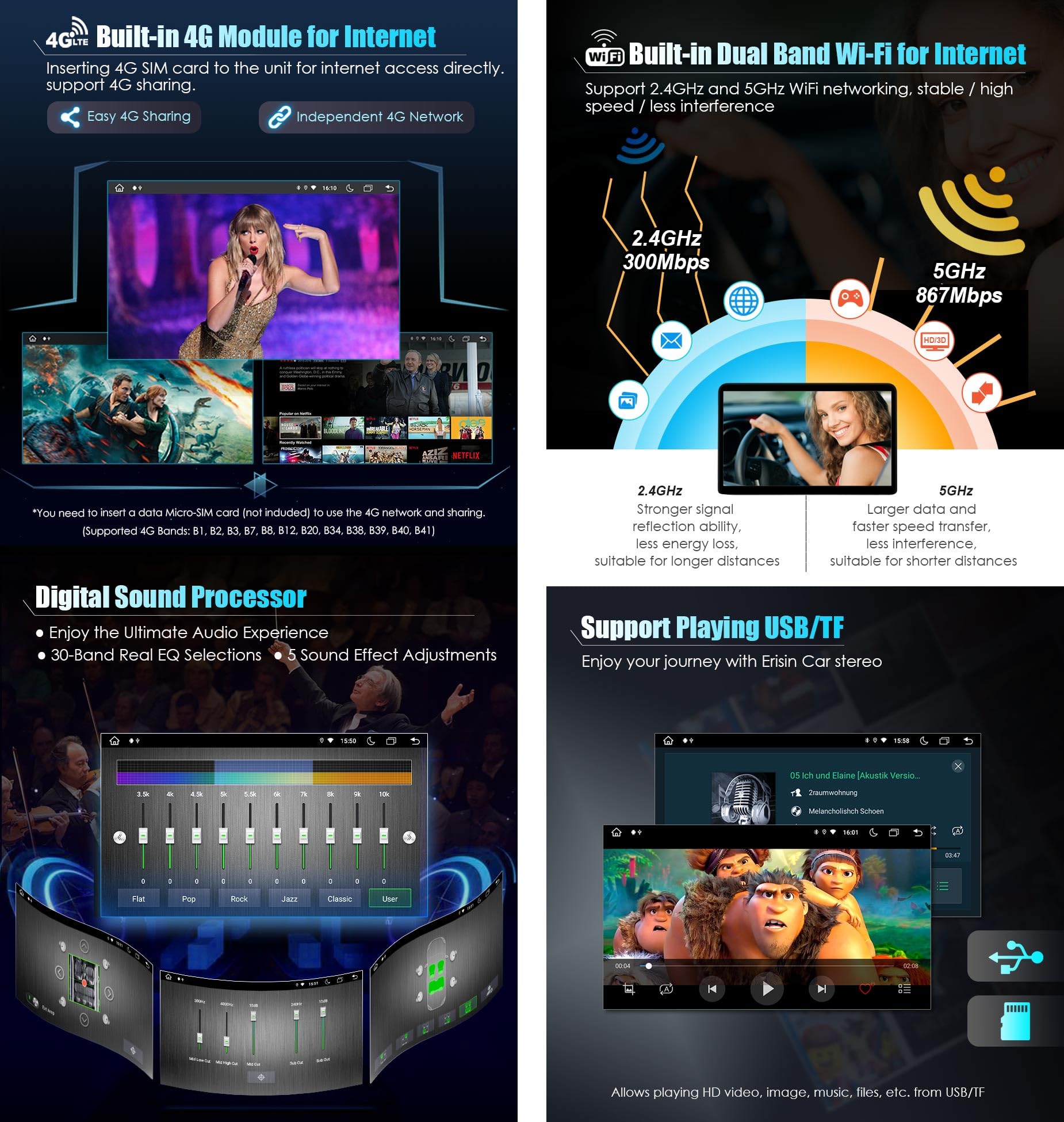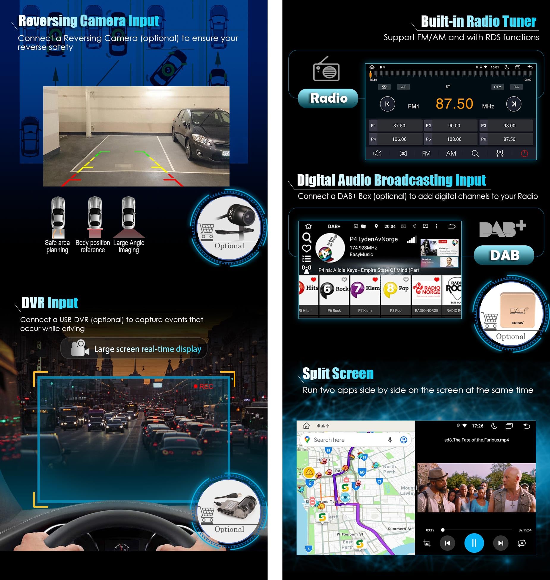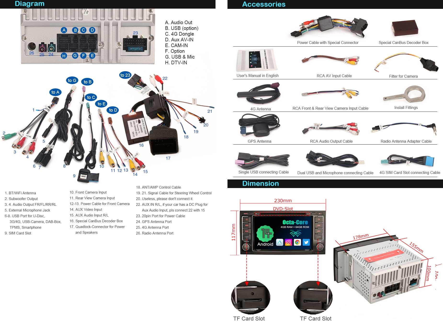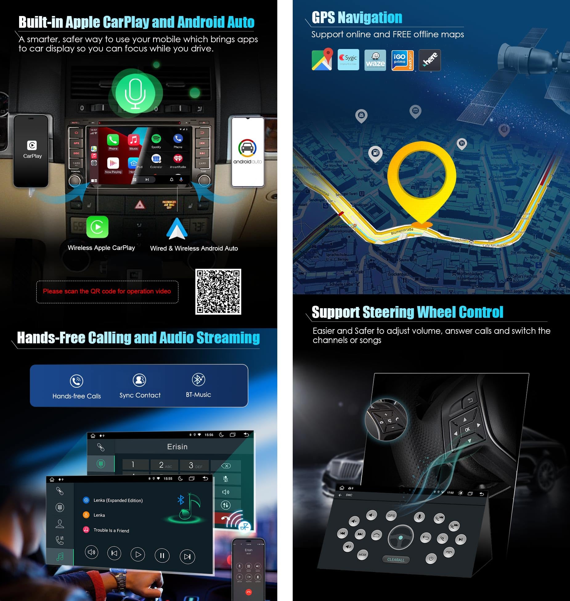 ["【Android 14- 4GB RAM+64GB ROM】This Android 14 car radio DVD GPS for VW Touareg T5 Multivan 2004-2010 has 8 Core 2.0GHz CPU. Fast start-up and high-speed processing, allowing you to enjoy a smooth and responsive user experience. 7-inch capacitive IPS touchscreen. Optimized CANBus decoding can retain steering wheel control and original functions. Supports subwoofer and 4*48W stereo sound. Supports DVD/USB/TF, FM/AM radio, 9 UI themes. Front panel size 9.05 inches wide * 4.61 inches high.","【Wireless Carplay & Android Auto】Wireless Carplay, connect iPhone via Bluetooth, Wired and wireless Android Auto, connect Android phone via USB/Bluetooth, access GPS, calls, music from mobile phones while driving, seamlessly integrate your phone on the large screen to use, making your driving easier and safer.","【Navigation & DSP Amplifier System】✔ Sat Nav/GPS navigation preinstalled local offline maps. Online maps are also supported after internet connection, you can install maps/navigation apps (iGO, Waze, Sygic, HereWeGo) depending on daily use. ✔ Built-in digital sound processor, 30 Band Real EQ selection, 5 sound effect settings, enjoy the ultimate audio experience.","【4G & Dual Band WiFi Internet】Built-in Dual Band WiFi module and 4G module, access the internet through hotspot connection or insert micro SIM card, easier and faster for online navigation, music, movies, etc. More choices while driving.","【Multiple Functions】✔ Steering wheel control. ✔Bluetooth hands-free calling, A2DP audio streaming. ✔Radio tuner (FM/AM) with RDS. ✔Android multimedia player, can play music/video/photo from USB/SD/CD/DVD player, supports 1080P videos. ✔ Panel light colors/wallpaper/boot logo/language adjustable. ✔Supports DAB+, DVB-T/T2, TPMS, OBD2, DVR, rear view camera, AVIN, etc., requires optional devices."]
