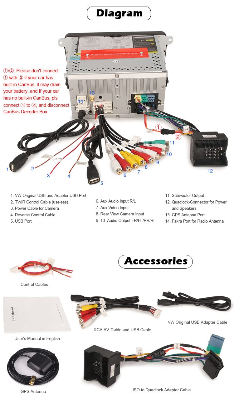 2. Support GPS navigation, free TF card with offline navigation maps and GPS antenna included. Support Bluetooth hands-free calling & A2DP Bluetooth function, you can make calls, listen to your phone's music and download the phonebook from your phone to use. Radio tuner with RDS, 30 preset radio stations (FM: 3*6, AM: 2*6). Support steering wheel control.