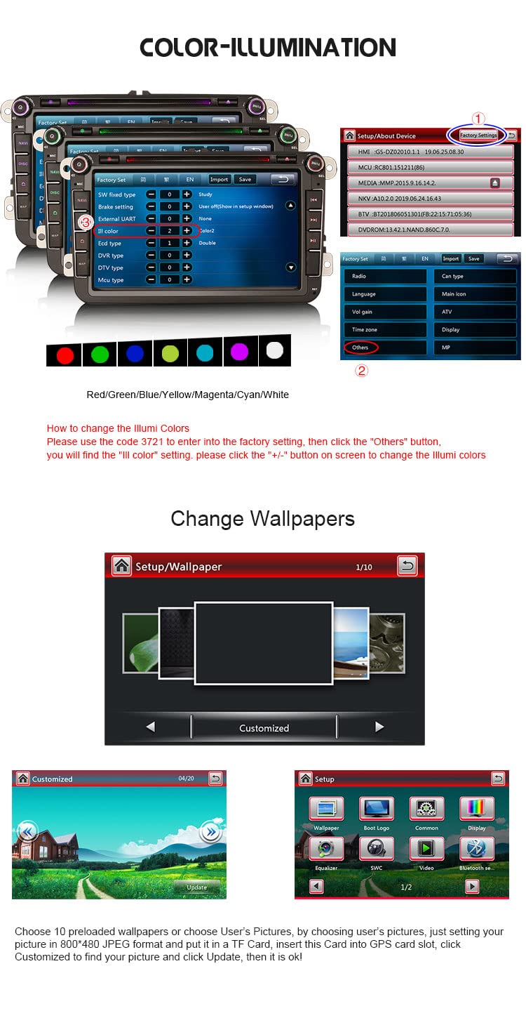 3. Built-in multimedia player, CD/DVD player, can play music/1080P video/photo from connected DVD/USB. Support the latest 10-band EQ, 4 x 45w surround stereo, subwoofer output. Built-in 6 games, clock, calendar. Supports DVB-T/T2, rearview camera, AVIN, etc. advanced functions. Support panel light colors/wallpapers/multi-menu language setting.