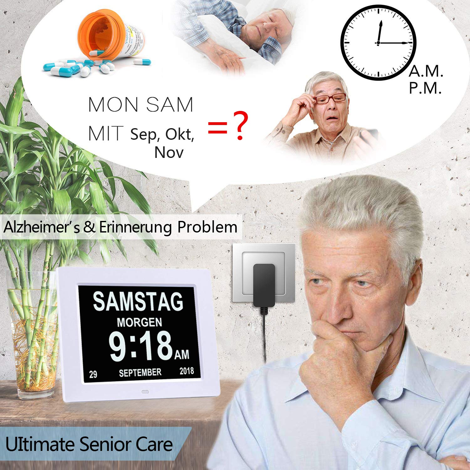 "💕KEY FEATURES: This unique 8-inch high-resolution digital and calendar day clock clearly displays the time, fully spelled out day of the week, month, and date in clear capital letters - without confusing abbreviations. The clock includes 7 different language options: German, English, Spanish, French, Italian, Polish, Dutch. The time display can be set in 12-hour or 24-hour format as needed.