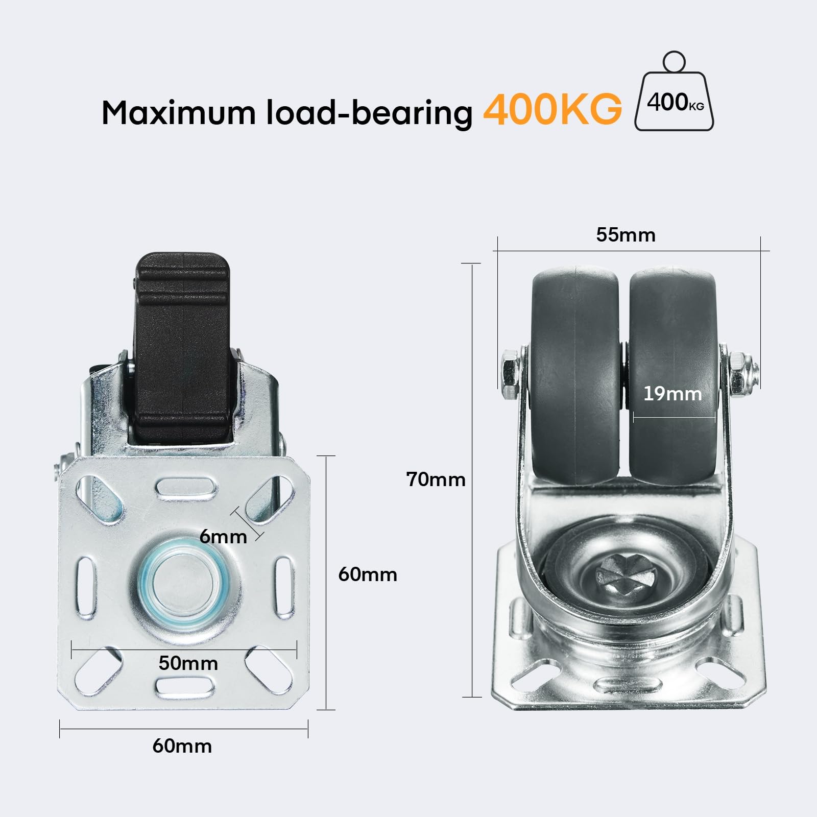 "High-quality material: Double wheels 50mm frame is made of high-quality metal zinc, thickened base, strong structure, strong stability, double wheel design has a high load capacity of 400kg. Brake casters have strong corrosion resistance and can be used indoors and outdoors without worry.",