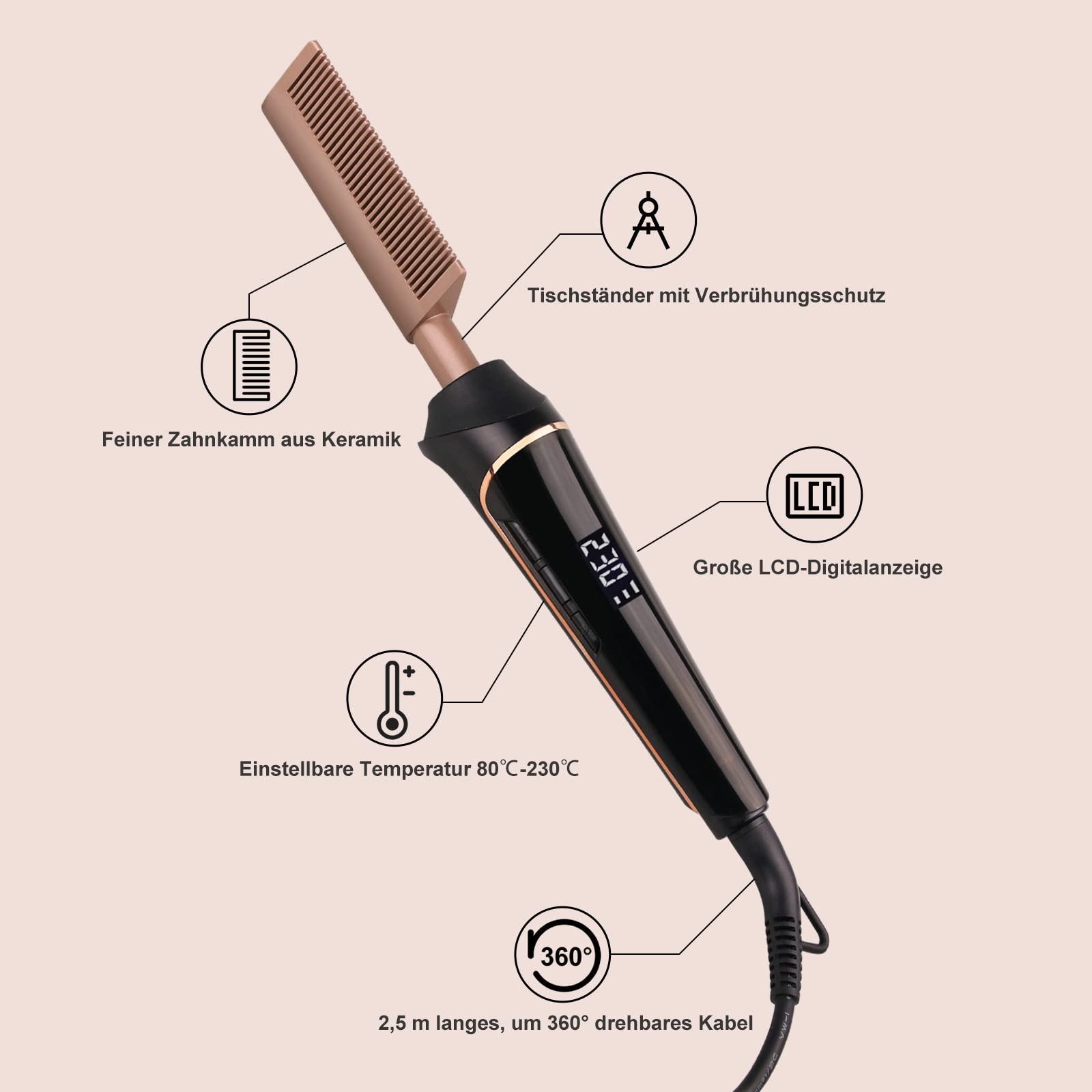 ["Ceramic Hot Comb: janelove Straightening Comb is made of Tourmaline Ceramic with good heat conductivity, effectively removes static electricity, smooths hair and beard styles, making it soft and shiny","Adjustable Temperature: From 80 to 450°F (10°F each time) with large LCD display real-time heating temperature, efficient PTC chip heats up quickly and steadily in 30s to speed up styling","Wide Applications: janelove Hair Straightener with 3mm thickness and temperature up to 450°F, Ideal for straightening hair roots and Curly Afro Hair / Beards / Wigs","Safe to Use: Straightening Comb has a stand function, Prevents burns on the tabletop. With heat-insulated protective cover and gloves. Prevent burns on cheeks, neck, or scalp during operation","Ergonomic Design: Straightening Comb with 360° rotatable cable, ergonomic handle makes it easy to use, 60-min Auto Shut Off, to keep your home safe, 100V to 240V for travel"]