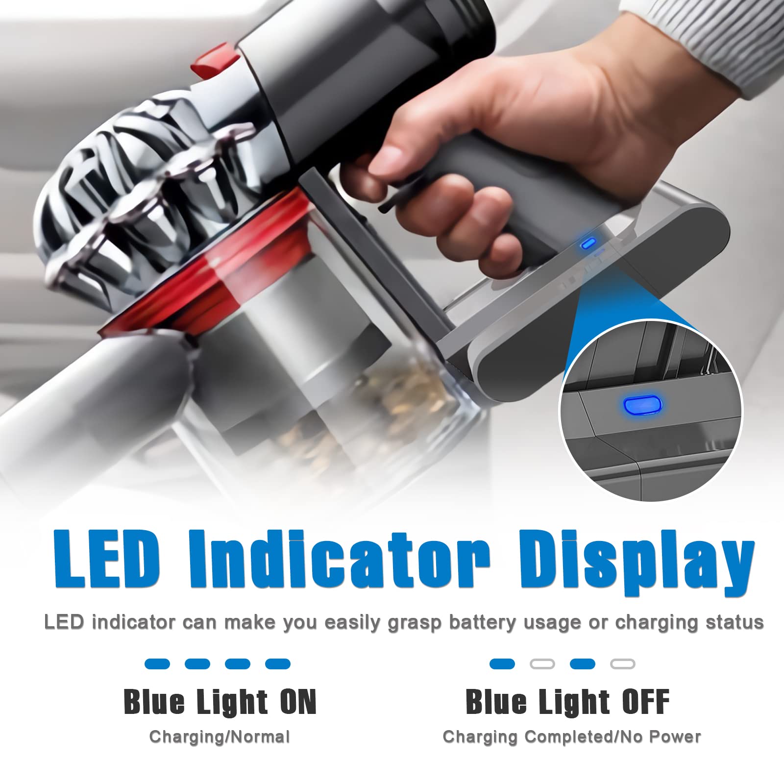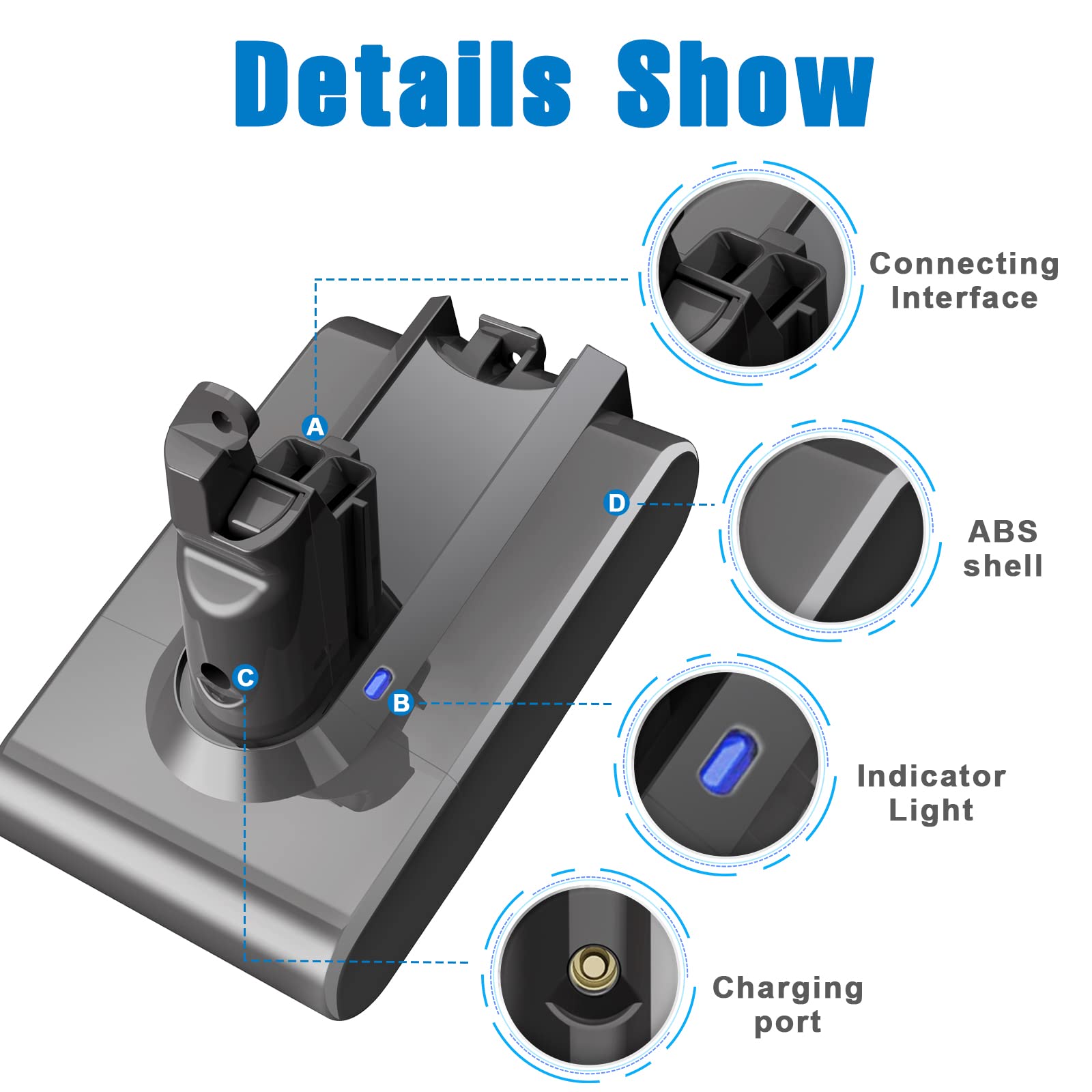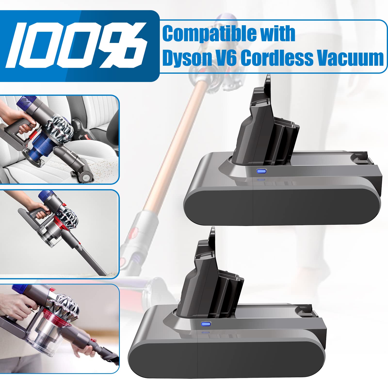 ["đăREPLACEMENT FOR DYSON V6 BATTERY ORIGINALă8000 mAh high capacity, perfect replacement for the original battery, higher capacity than the ordinary 3000 mAh battery, faster charging time, longer runtime, Battery Type: Lithium-Ion.","đșăFULLY COMPATIBLE WITH DYSON V6 SERIESăOur V6 replacement battery is compatible with tools from the V6 series like V6 Trigger, V6 Animal, V6 Motorhead, V6 Fluffy, V6 Absolute, SV03, SV05, SV07, SV09, DC58, DC59, DC62 Battery. (đNOTE: The V6 battery is not compatible with V7 or V8 series vacuum cleanersđ)","đșăHIGH QUALITYăThe V6 battery uses the highest quality cells, safe with quick charging technology, while providing overload protection, overcurrent protection, short circuit protection, high temperature protection to ensure that you can use the vacuum cleaner safely.","đžăUPGRADED CAPACITYăUpgraded cordless vacuum battery for Dyson V6, the usage time is longer than the original battery. The V6 battery is more durable, so your vacuum cleaner works longer, and it can also reduce the number of charging times, extending the battery's lifespan","đ§ ăQUALITY SERVICEă - 1 * V6 Replacement Battery, 1 * User Manual. 24*7 friendly customer support, 30 days money back. Any concerns about this item feel free to contact customer service. We are committed to providing you with a high-quality shopping experience!"]