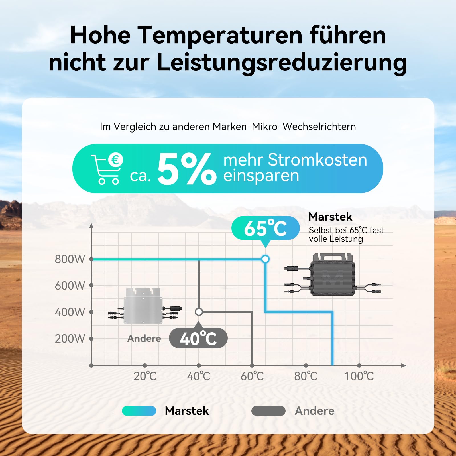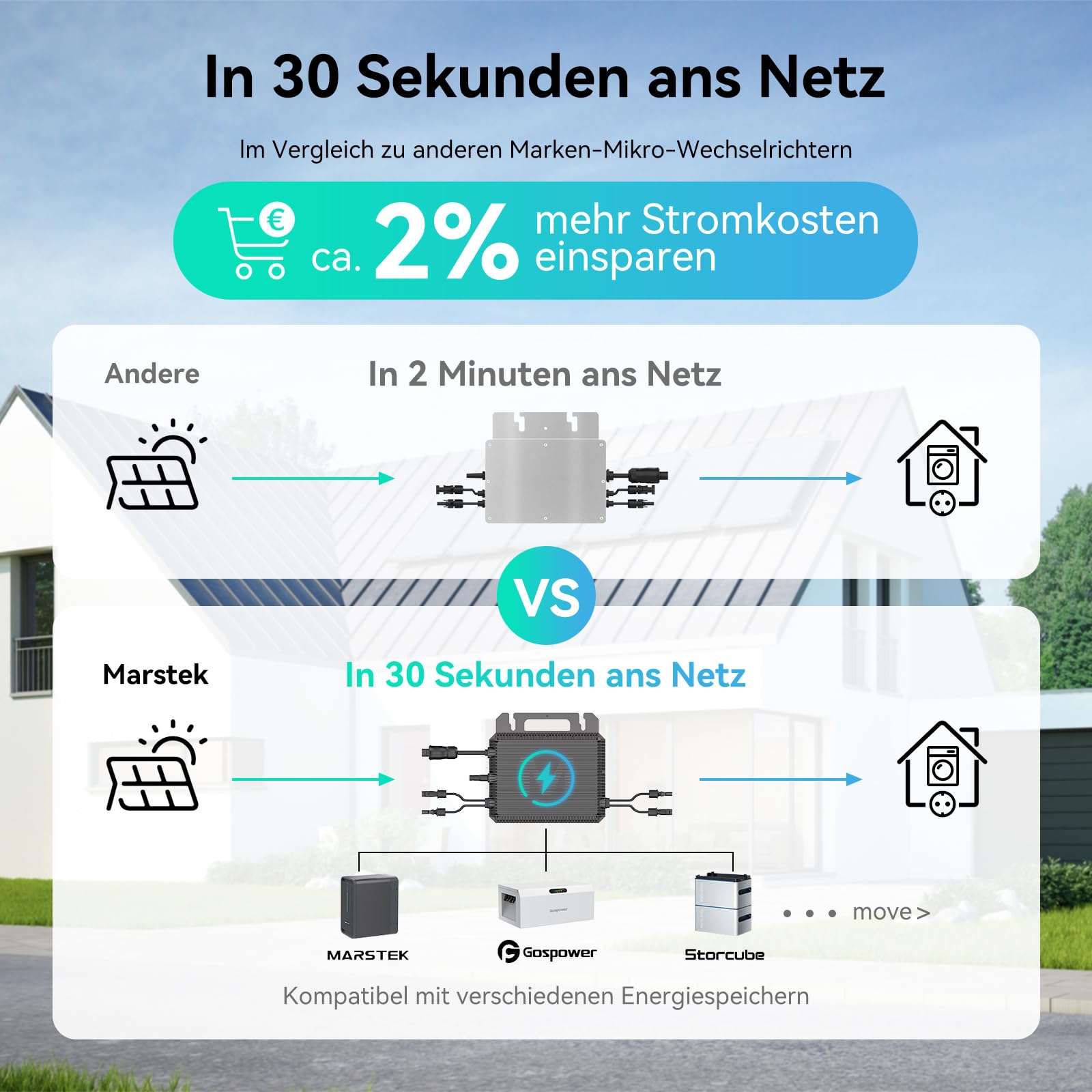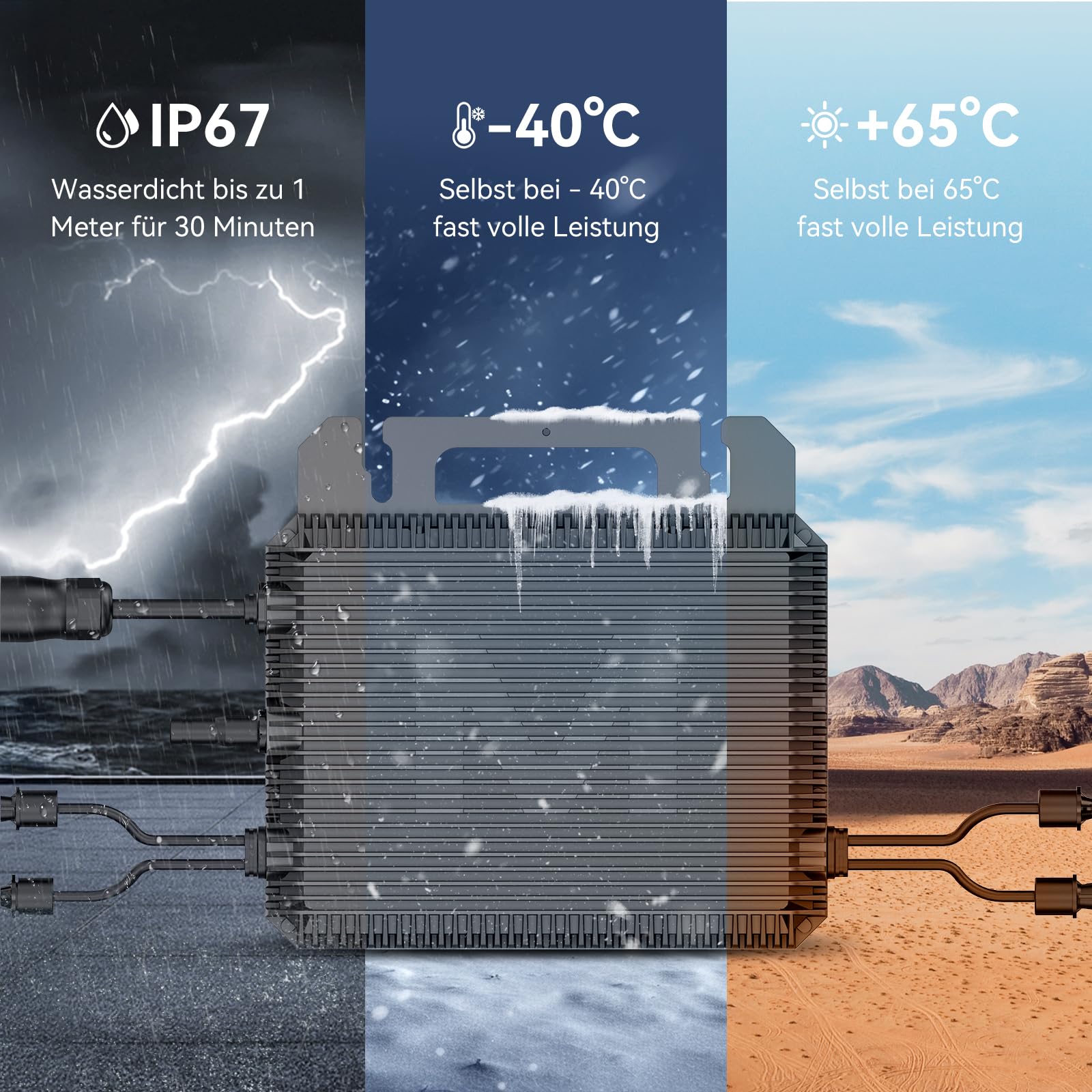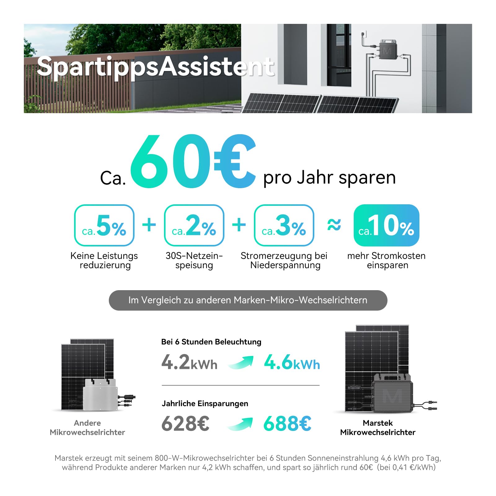 ["800-Watt Microinverter】Maximum AC output power is 800 watts. Suitable for up to 2 solar panels each ranging from 320W to 600W. Highest efficiency: 96.5%. Plug-and-play. The compact and lightweight design of the Rockcore microinverter allows for easy installation and use.","【2 MPPT for 1kW PV Input】The microinverter has two independent MPPT input channels, optimizing power generation from solar panels and accelerating return on investment. Up to 1000W PV input, with an efficiency of up to 99.8%.","【Full Safety Protection】The 800W inverter features a high-quality microprocessor, standalone chip, and IP65 protection. The microinverter independently controls each component in a parallel connection, minimizing safety risks.","【APP Remote Monitoring】Supports the operation of Marstek APP. Remote control and monitoring via wireless LAN or mobile APP. Maximizes the use of solar energy, enhances security, and simplifies the planning, installation, maintenance, and management of solar energy systems.","【Good Service】Local warehouse supply in Germany, guaranteed within 3-5 days. Long-term warranty service, warranty for the microinverter up to 10 years. 24-hour fast and reliable online service to solve your pre-sales and after-sales problems.","【0% Sales Tax】The price is already indicated with 0% sales tax. The price is only valid for private customers who meet the requirements for tax-exempt delivery according to § 12 para. 3 UStG. For business customers, an additional 19% sales tax is due and added to the purchase price."]