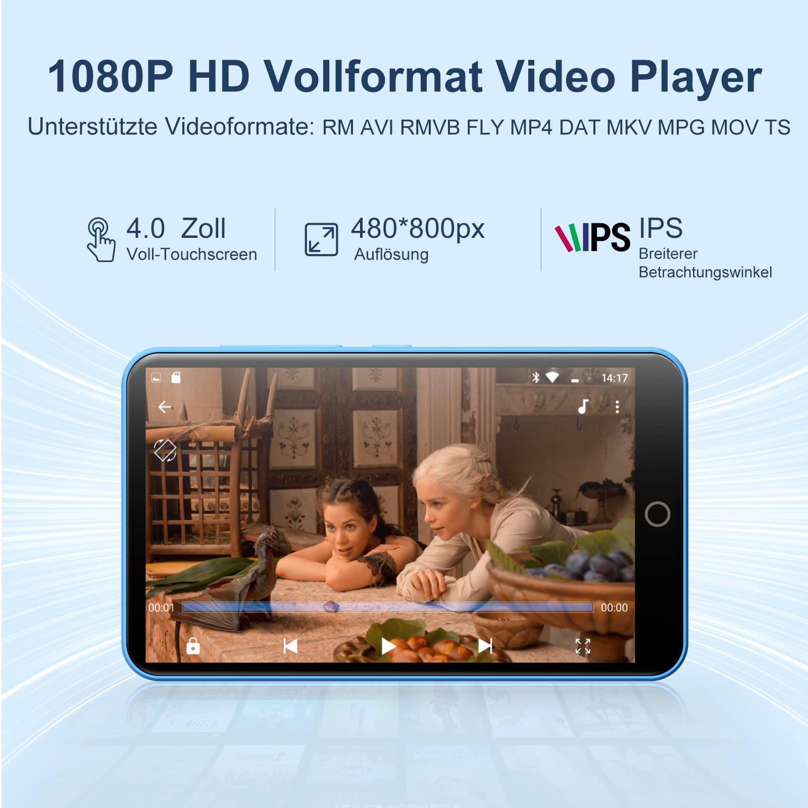 80GB MP3 player with Bluetooth and WiFi, MP3 & MP4 music player, Oilsky 4-inch 1080P touchscreen video player, portable Android Spotify player with Play Store app (Blue)
