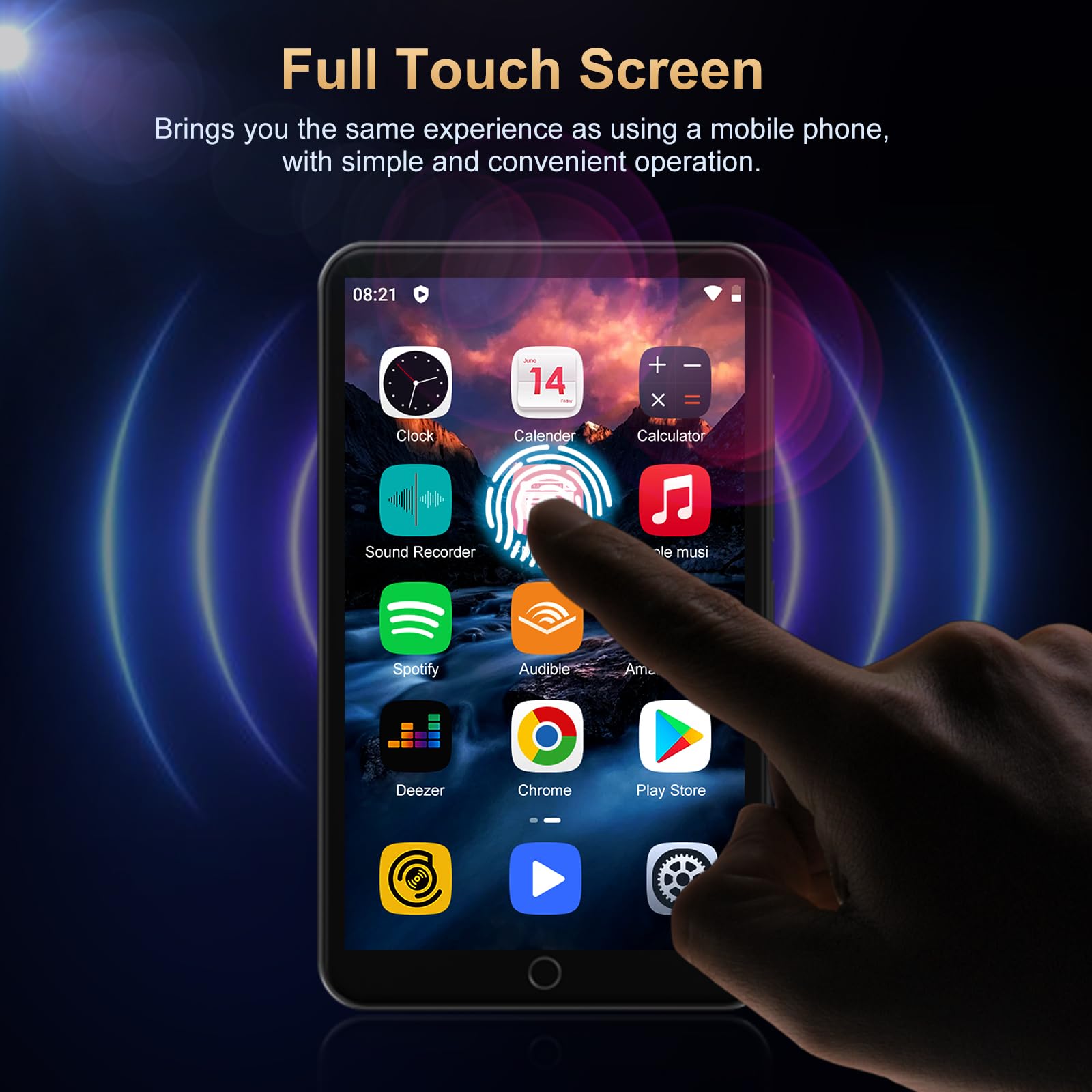 ["【WiFi Wireless Connection】This mp3 player supports downloading/uploading/listening to music online after connecting to WiFi. This wifi mp3 player covers a variety of mainstream media apps in it, such as Spotify, Amazon Music, HiBy Music, Audible, Deezer, Chrome, additionally allowing you to download other apps like YouTube, Facebook, Kindle, Pandora, Twitter from the Google Play Store.","【4.0 Inch 1080P IPS Touchscreen Mp3 Player】Our streaming MP4 player features a 4-inch 1080P HD full-screen touch display, allowing you to enjoy the audiovisual movie experience. The Android system ensures smooth, lag-free operation, and the one-touch lock function prevents accidental touches. It is user-friendly for both older people and children, providing a simple and convenient experience.","【Wider Bluetooth Compatibility】Our device is equipped with advanced Bluetooth 4.1 chip, ensuring wide compatibility with various Bluetooth devices. Whether headphones, speakers, or car radios, it effortlessly connects to all devices. Experience lightning-fast pairing and rock-solid, stable connections that never miss a beat.","【Unlimited Storage Space】This digital audio player has a microSD card slot, allowing you to expand external storage up to 512GB. This can satisfy your need to store more songs, videos, and audiobooks. As a bonus, you will receive an additional 64GB TF card as a gift. Get ready to take your music collection to the next level!","【Unleash Endless Entertainment】Our MP4 player features a powerful 2000mAh battery with USB-C fast charging. Enjoy an impressive 20 hours with Bluetooth headphones, 35 hours with wired headphones, and 5-6 hours of video playback. Plus, it boasts a stunning standby time of 3-5 months. And all in a compact, powerful design."]