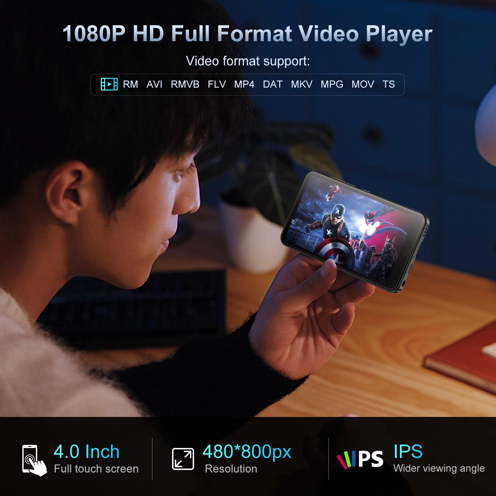 📺4.0 Inch 1080P IPS Touchscreen Mp3 Player: Our streaming MP4 player features a 4-inch 1080P HD full-screen touch display, allowing you to enjoy the audiovisual experience. The Android system ensures smooth, lag-free operation, and the one-button lock function prevents accidental touches. It is user-friendly for both older people and children, providing a simple and convenient experience.