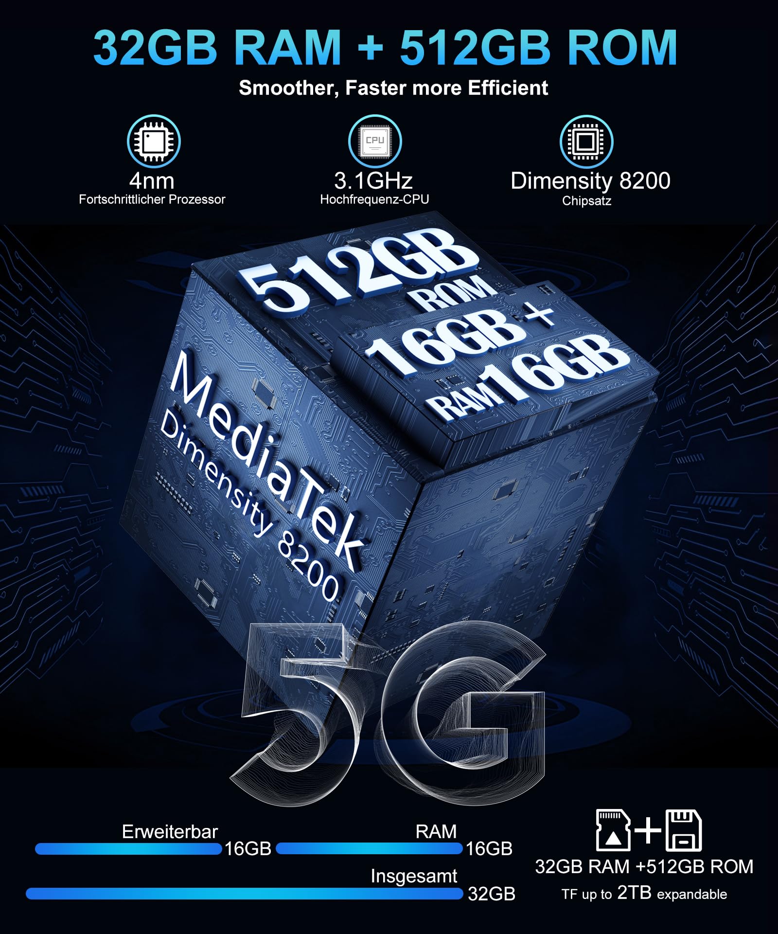 【32GB RAM+512GB ROM/(2TB Expandable)】8849 Android 14 waterproof rugged smartphone with MTK Dimensity 8200 Octa-Core processor (4nm/3.1GHz), providing brilliant operating experience for you. 32GB RAM (16GB RAM+16GB adjustable RAM) ensures super-fast downloads, quick processing, and low latency. With 512GB ROM and 2TB expandable storage, users can store more photos, videos, and other files. Whether you are a gaming or photography enthusiast, Tank 3 Pro is also your best choice.