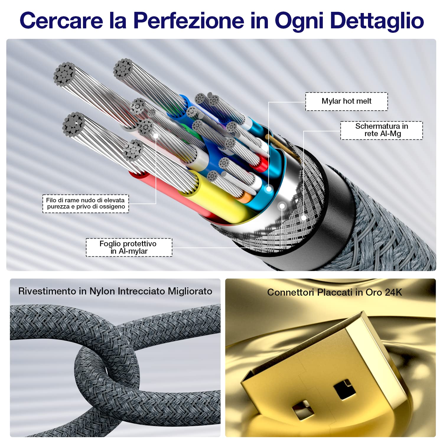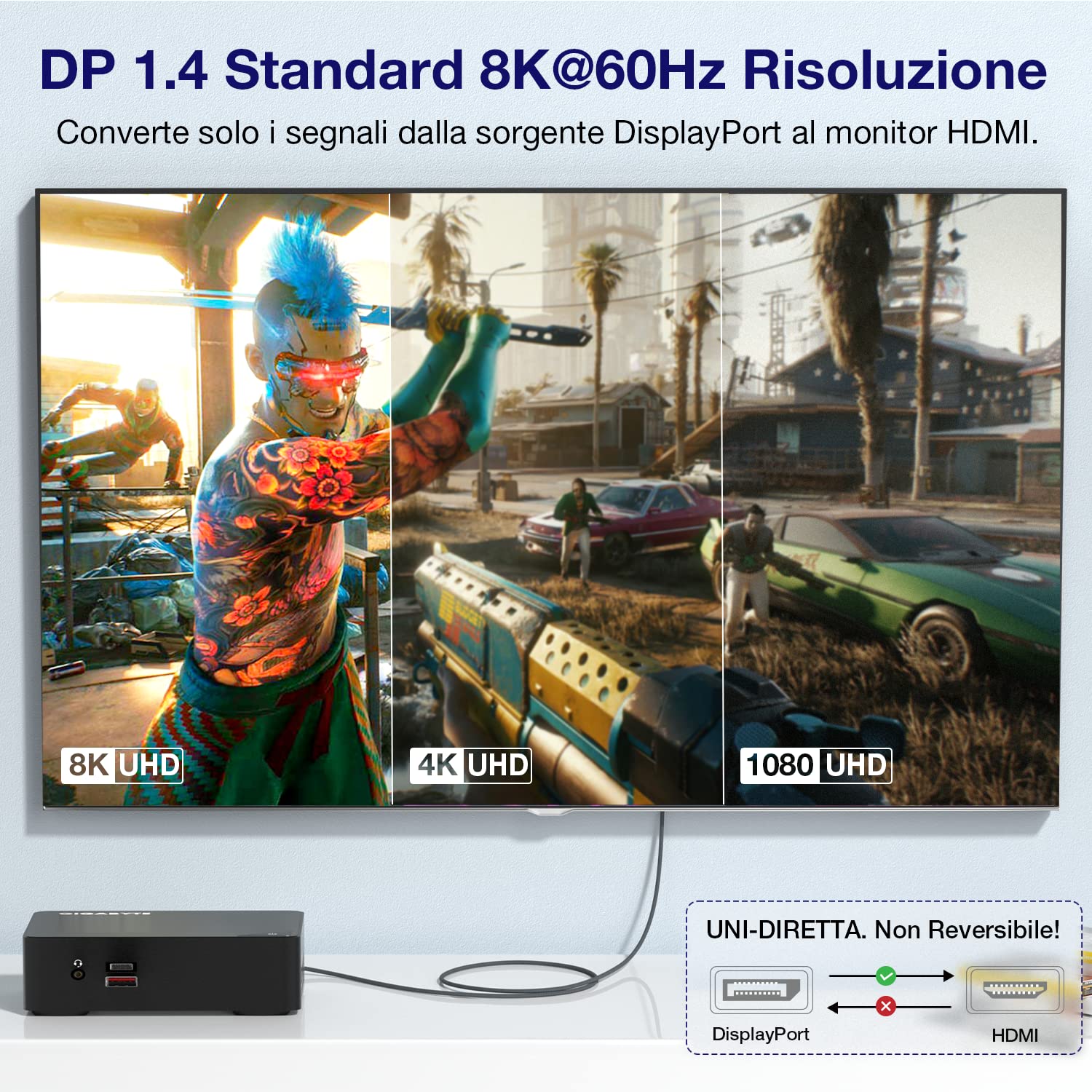["DisplayPort to HDMI Cable: This DP 1.4a to HDMI 2.1 Cable (male to male) connects DisplayPort (DP, DP++, DisplayPort++) on desktop/laptop/graphics card to an HDMI output for audio and video streaming or gaming. Note: This is a UNIDIRECTIONAL cable that only converts a DisplayPort source to an HDMI display.","High Resolution 8K @ 60Hz: The unidirectional DP to HDMI cable provides 8K Ultra HD video (7680 x 4320) with a high refresh rate of 60Hz, unprecedented innovation, compatible with 4K@144Hz/120Hz, 2K@240Hz/144Hz, 1080p@240Hz. Additionally, it supports 32.4 Gbps bandwidth (HBR3), HDR, Dolby 7.1, HDCP 2.2, DSC 1.2a, 32 audio channels, and FreeSync for a smooth and seamless viewing experience.","Multiple Supported Modes: The DisplayPort to HDMI male to male is considered efficient and useful. For the mirror mode, you can easily play games or watch movies on a larger display. For the extension mode, you can connect a second monitor to your computer for a larger desktop workspace. With the Multi-Screen SLS mode and AMD Multi-Monitor technology, you can connect up to 6 screens simultaneously.","Durability and Safety: With triple shielding, gold-plated connectors, and a slim aluminum casing, the cable ensures longevity and never breaks, providing stable and high-quality audio and video signals without worrying about dropped frames, artifacts, or distortions. The braided DP connector allows for easy connection and prevents damage to the device's original DP input port.","Universal Compatibility: This DisplayPort to HDMI cable is compatible with laptops (HP ProBook EliteBook, Lenovo ThinkPad), desktop towers (HP, Dell, Lenovo), graphics cards (AMD, NVIDIA DIA), and other devices with DisplayPort. You can also connect to TV, projector, monitor, VR headset, etc. Compatible with HDMI-enabled TVs/monitors/projectors for video and audio transmission. We recommend using GTX1650S/1660Ti/RTX2060/2070/2080Ti, RTX3060/3070/3080.."]