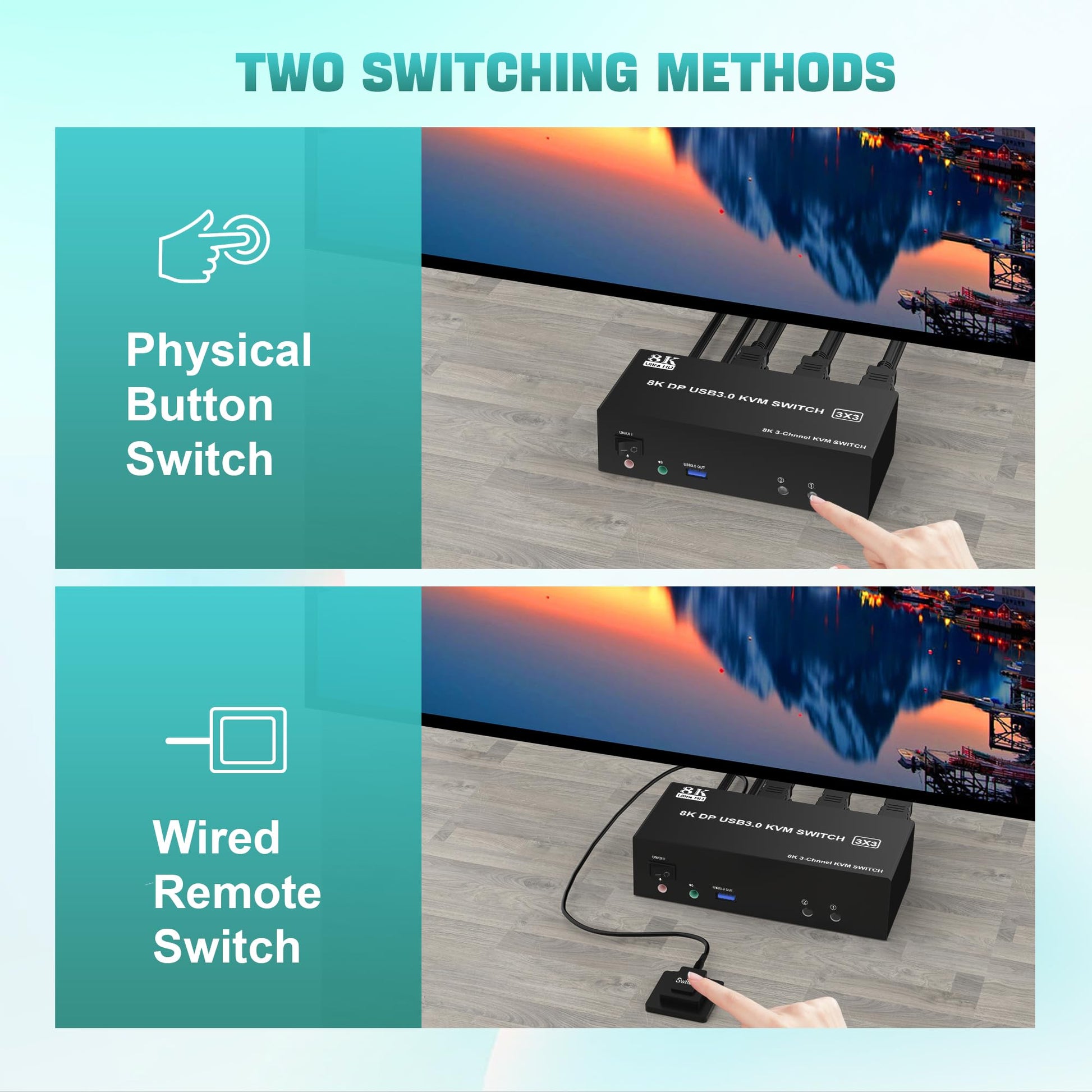 ["KVM Switch Displayport 1.4 supports 8K@60Hz/4K@144Hz"] This KVM switch 3 monitors supports resolutions and refresh rates up to 8K@60Hz/4K@144Hz. ☛Note: Only if your computer's graphics card, monitor, and DP cable all support 8K@60Hz, then you can achieve 8K@60Hz effect, so if you want the maximum resolution, you need to check your devices first.