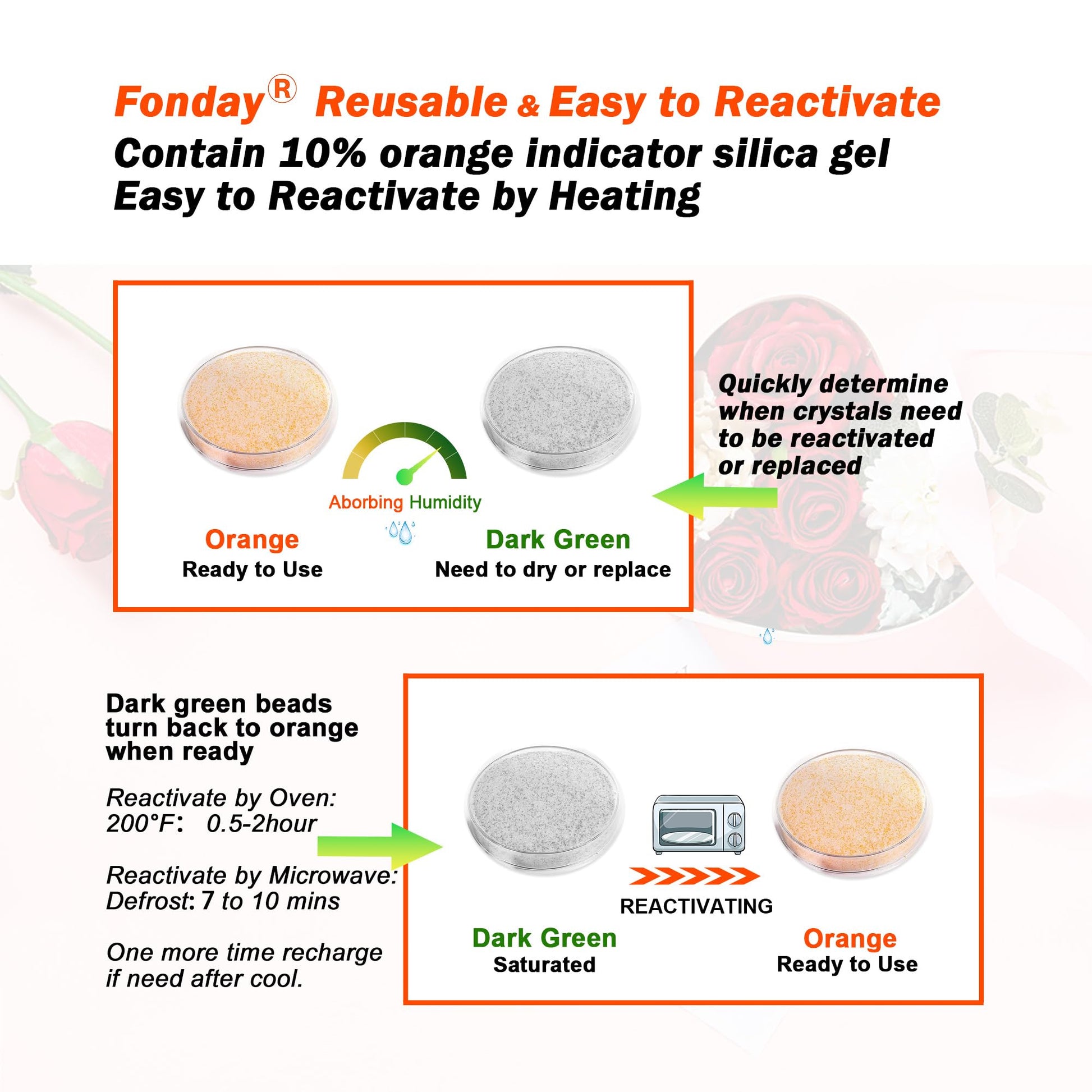 [Rejuvenation Instructions] You can rejuvenate the silica gels as instructed. The drying crystals can be reused when dark green beads turn orange again. (Rejuvenate in oven: 0.5 to 1 hour at 392°F to 482°F; Rejuvenate in microwave: 7 to 10 minutes in defrost mode)