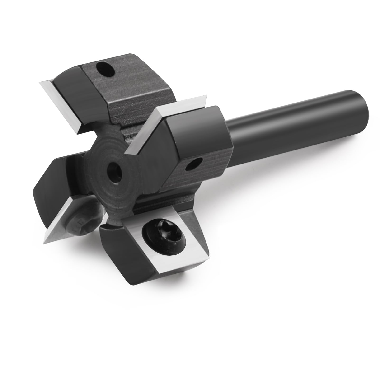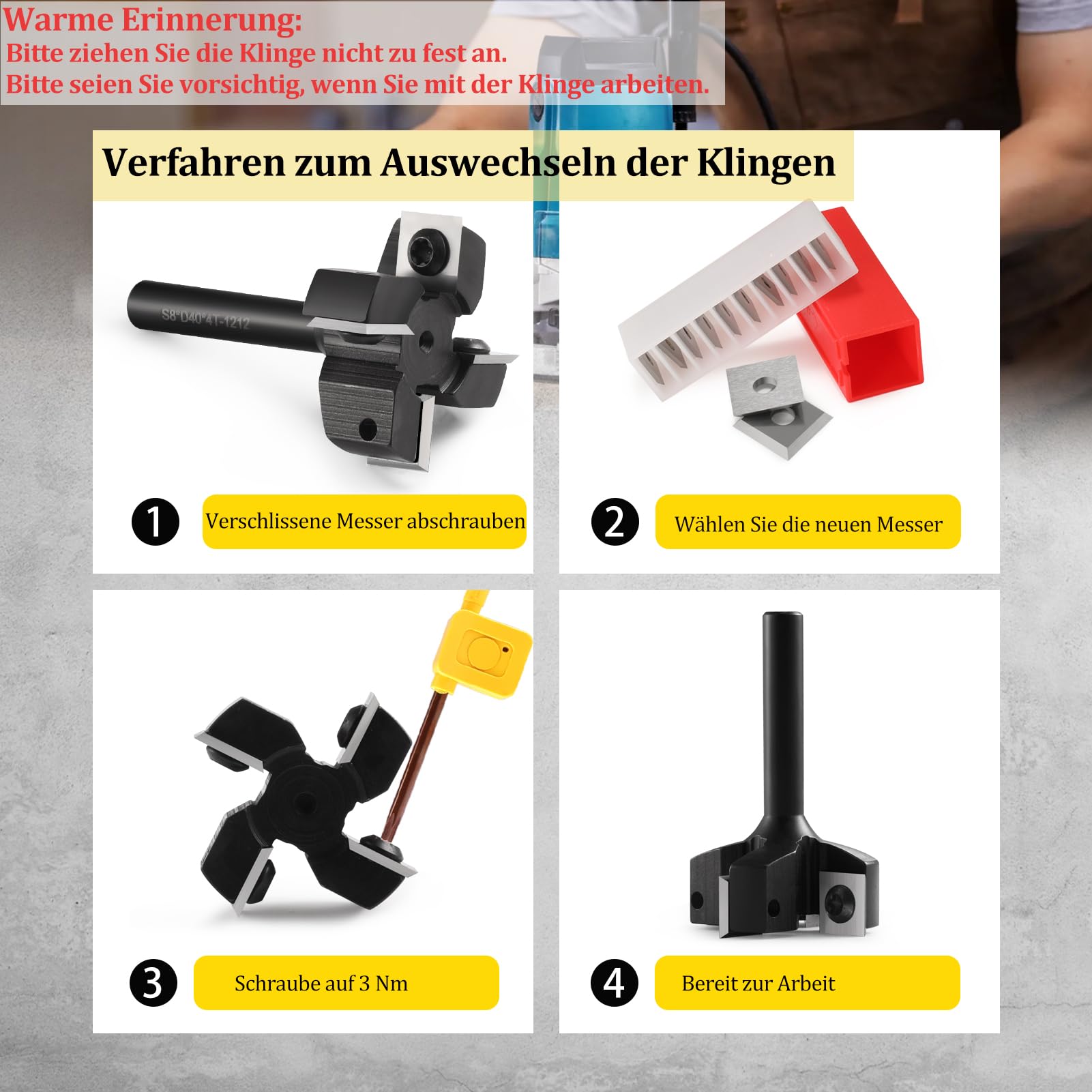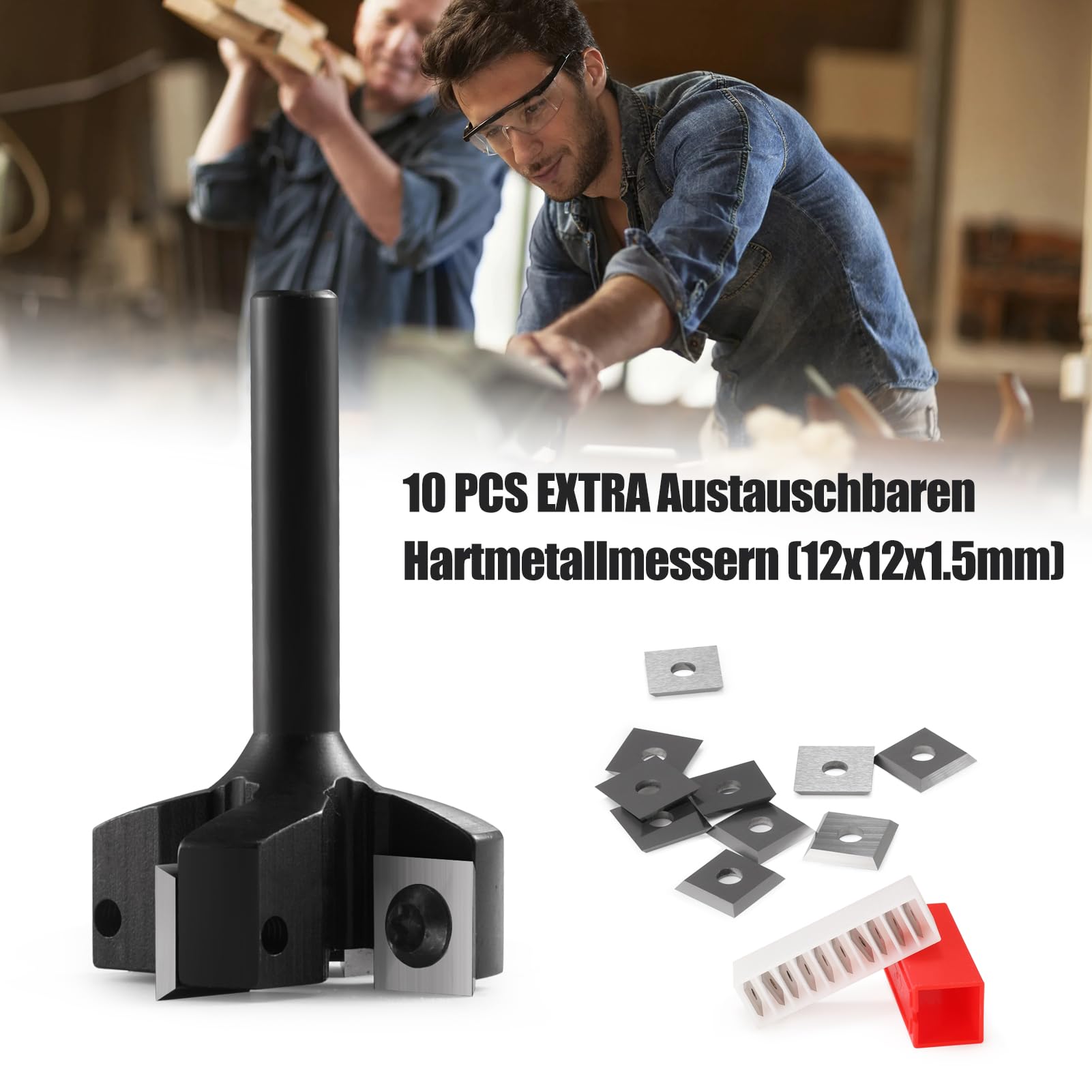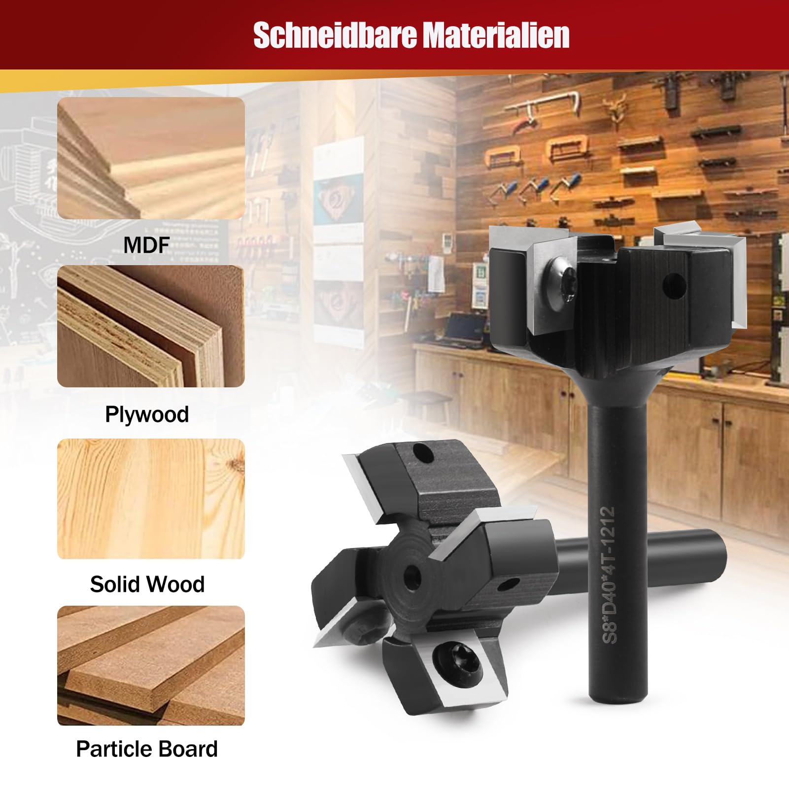 "8mm Shank Router Bit: The rare precious metals TaC and TiC are added, resulting in impact resistance and wear resistance, higher density, better compactness, no bubbles, uniform and denser metallographic structure, making the end mill more durable. Specifications for Router Plane Cutter: Plane cutter wood has a shank: 5/16 inch (8mm) // Diameter: 1.58 inch (40mm) // Total length: 2.47 inch (62.8mm) // Body material: hard carbon steel // Inserts: 12x12X1.5mm, 35°. The matching inserts are sold under ASIN "B0CKXFHJNC / B0CKXFSJFY". The flat shaft design ensures vibration-free rotation, providing you with safe operation. Made of a tungsten carbide alloy with excellent heat and wear resistance, it can prevent the bit from becoming dull due to overheating, and can ensure the surface quality of the derivative. Comes with reversible inserts 10 piece replacement blades (12x12X1.5mm, 35°), Easy blade replacement doubles the life of the cutter. Surface bit is used for: For vertical milling machine or CNC wood router, maximum flexibility of use. Please check that the screws are tightened before use. Suitable for milling various hard wood surfaces, such as: plywood, solid wood, MDF. Thanks to the special geometry of the Plane Cutter Metal, milling is particularly quiet. If abnormal vibrations or noises occur during cutting, please reduce the speed and depth."