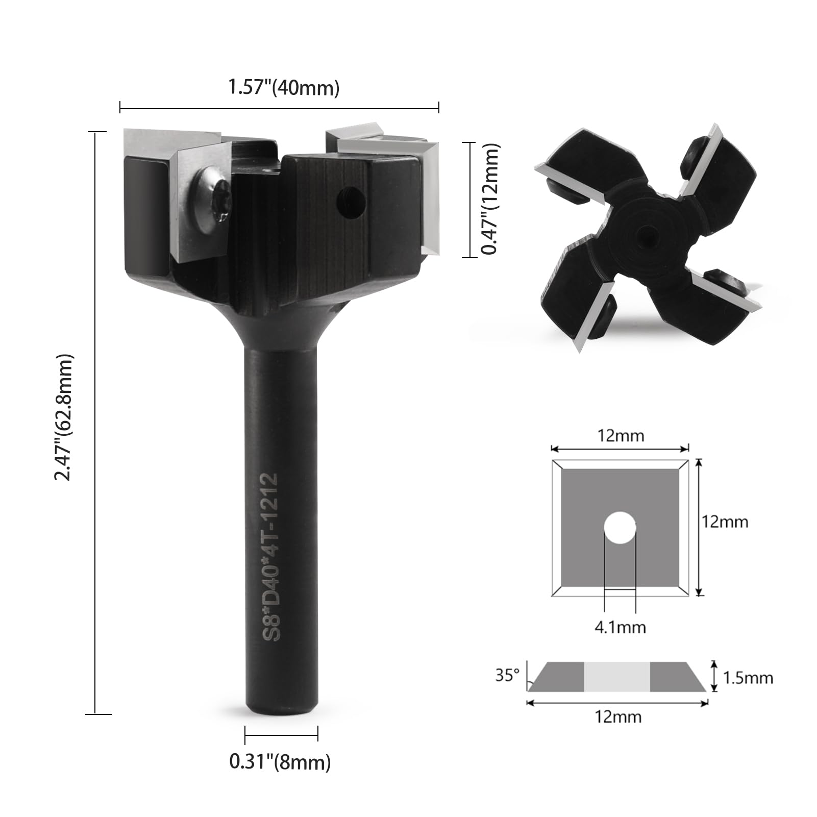 8mm shank 4 flute planer cutter with 10 interchangeable carbide inserts(12x12x1.5mm), diameter 40mm, CNC panel cutter cleaning cutter for router woodworking(D=40 S=8)