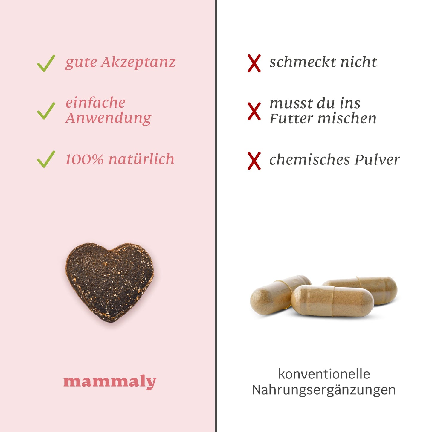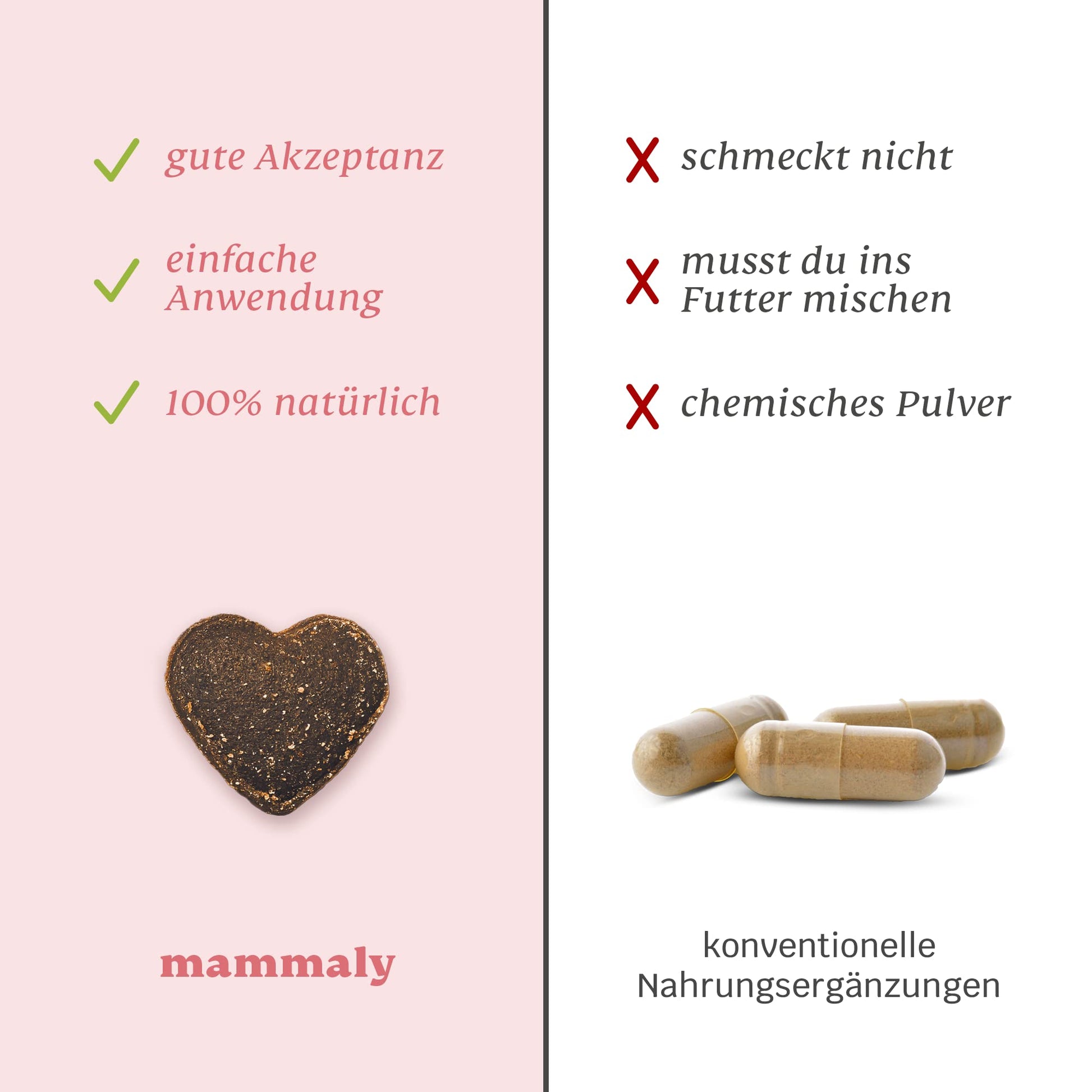 +300,000 dog owners already swear by the mammaly routine: Our delicious dog digestive snacks & health products are developed with veterinarians in Germany and made from branded raw materials. Completely free from added sugars, artificial flavor enhancers/aromas, dyes, or fillers (UltraPure product philosophy) - instead, they are extra soft & juicy. More than just treats.