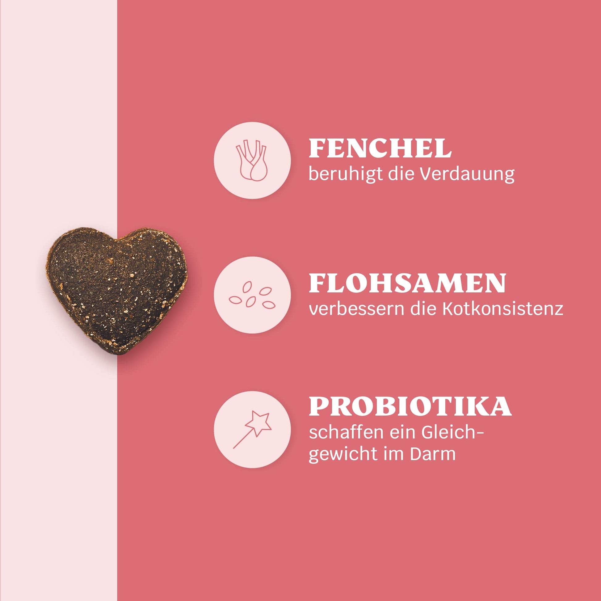 TREATS INSTEAD OF TABLETS: Having trouble mixing stomach tablets into your dog's food? Our juicy mammaly dog treats are not only full of important nutrients, but also delicious. Additional feed in (heart) snack form is easy to portion and tastes super duper delicious. Gut wellness sticks for digestion & stomach with probiotics.