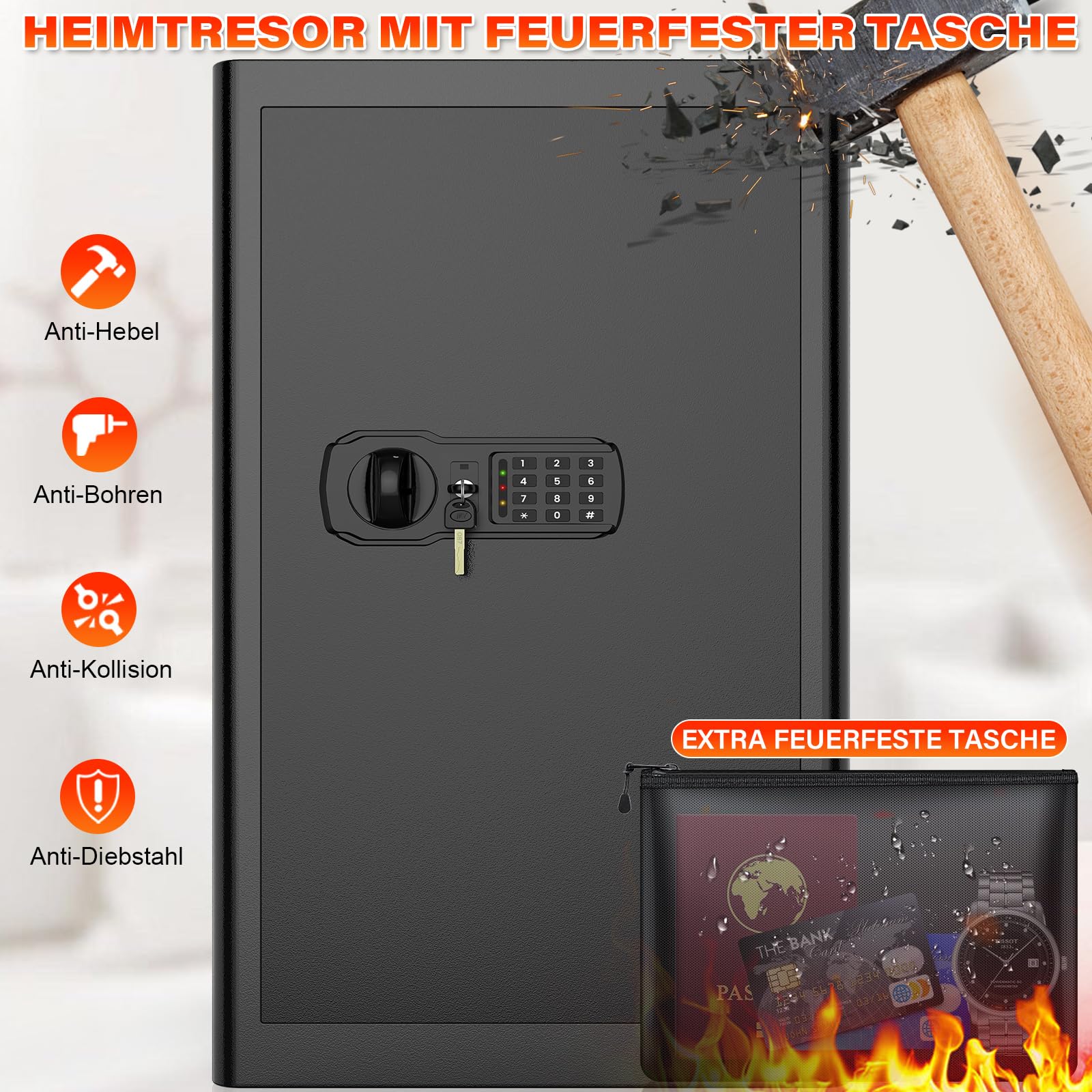 "Large Home Safe And Fireproof Document Bag: The 90-liter safe with large capacity can protect almost all valuable items and possessions, such as cash, jewelry, medications, household items, etc. The combination of a digital safe and a FIREPROOF BAG can protect your valuables from fire, hurricanes, and earthquakes. This safe is perfect for securing items FROM CHILDREN, THIEVES, AND PEOPLE you don't trust.