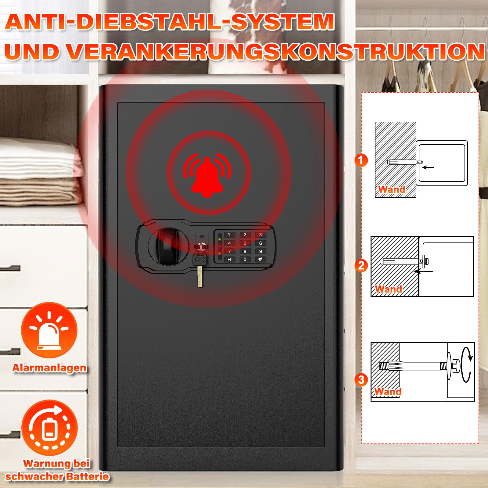 Prevents Theft And Anchoring Design: Our safe box is made of high-quality steel with thickened 30mm triple bolts and a 64mm thickened front door that is not easy to open after closing. There are 2 pre-drilled holes on the back and bottom of the safe. If you want MORE SECURITY, it can be bolted to the wall or floor. We have included expansion screws to make installation easier.