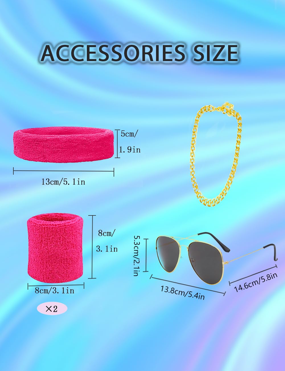 ["What you get - This 80s tracksuit includes 1 jacket, 1 pair of pants, 1 pair of 80s sunglasses, 1 pair of wristbands, 1 neon headband, and 1 artificial gold bracelet, making it a comprehensive costume set for standing out.","Made of soft and stretchy fabric - This 80s costume for men is made of 100% polyester with high elasticity and strength, providing a comfortable wearing experience. It fits perfectly, not too tight, itchy, or hot. Plus, the track pants have an elastic waistband for a secure and comfortable fit.","Unisex vintage style design - This 80s party suit is not only suitable for men, but also great for women. They are the perfect 80s couple outfit for adults. Designed in a casual retro style, you'll look cool and stylish.","Wide applicability - This 80s costume for men and women is the ideal attire for any retro or vintage 80s or 90s party such as hip hop festivals, rock festivals, bachelor parties, 80s/90s birthday parties, nightclubs, band performances, and 80s/90s Halloween parties and Christmas. With this 80s shell suit set, you'll receive many compliments and have lots of fun.","5 sizes available - This retro tracksuit from the 90s and 80s comes in five sizes. Please carefully check the size chart and choose the right size before placing your order. If you find the accessories lacking, please contact us immediately, we will provide you with a solution."]