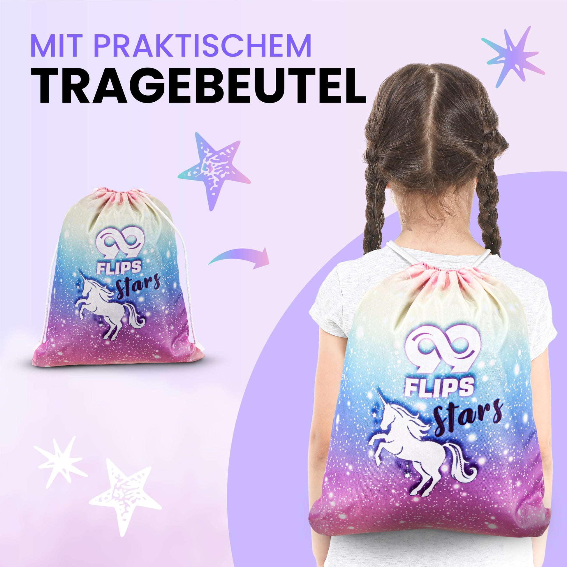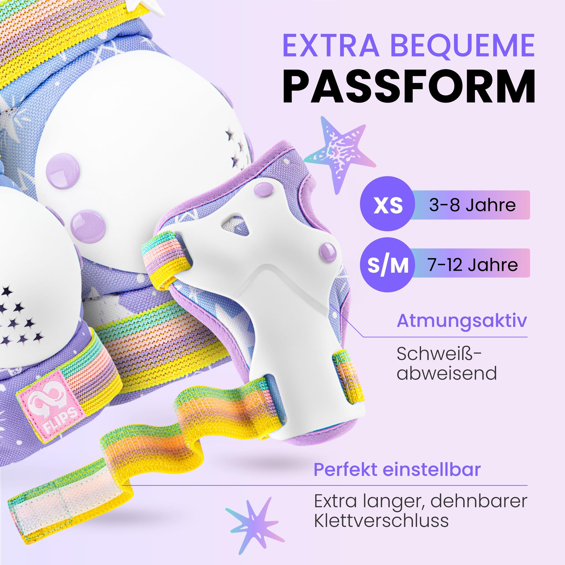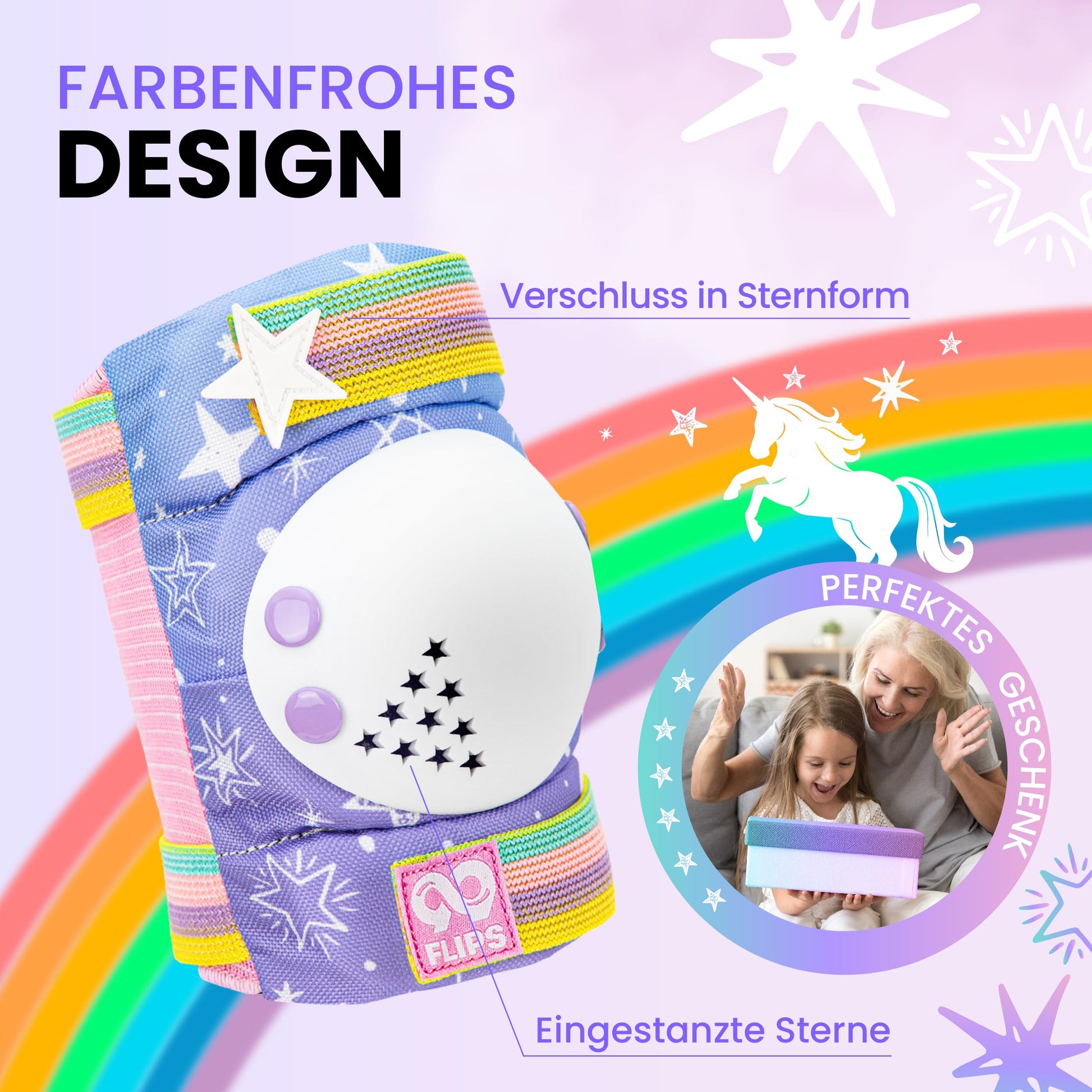 "Magical Design: Unique details like star-shaped air holes, glittering appearance, and colorful closures make the knee and elbow pads for children a real eye-catcher and make every child's heart beat faster. With Unicorn Bag: Included is an enchanting unicorn-themed carry bag, ideal for storing the children's protective gear set or as a practical companion for snacks during the skateboard session. Strong Material: Robust, securely riveted protectors offer excellent cushioning even with stronger impact and accompany young skaters beyond their first attempts. Room for Growth: The extra-long Velcro straps allow for individual adjustment of the children's knee pads, provide a flexible fit, and leave room for future growth from 3 years old. Perfect Gift: Give the enchanting protective gear set for children from 99FLIPS and transform every session, whether on a skateboard, scooter, inline skates, bike, or BMX, into a magical adventure."