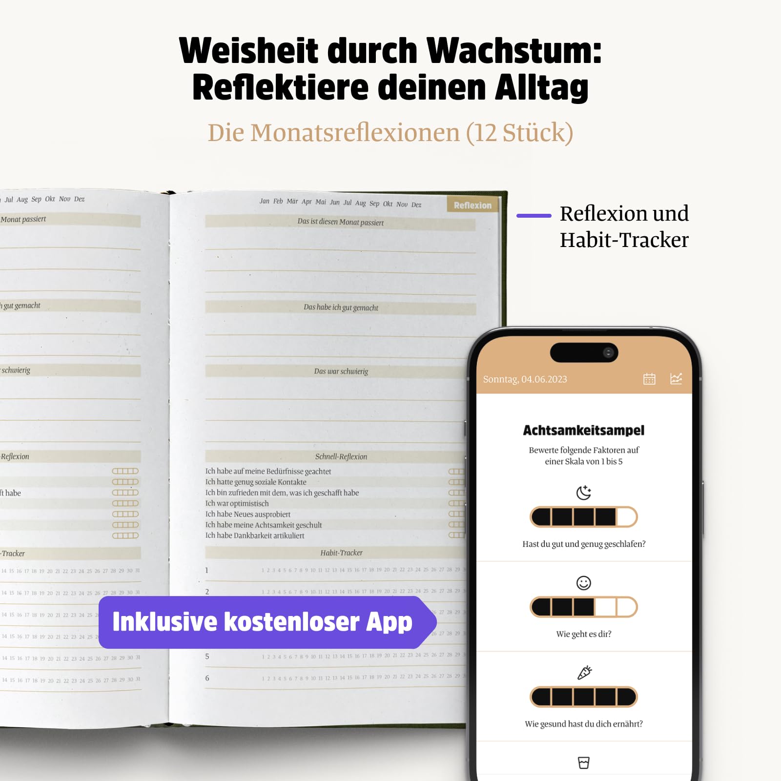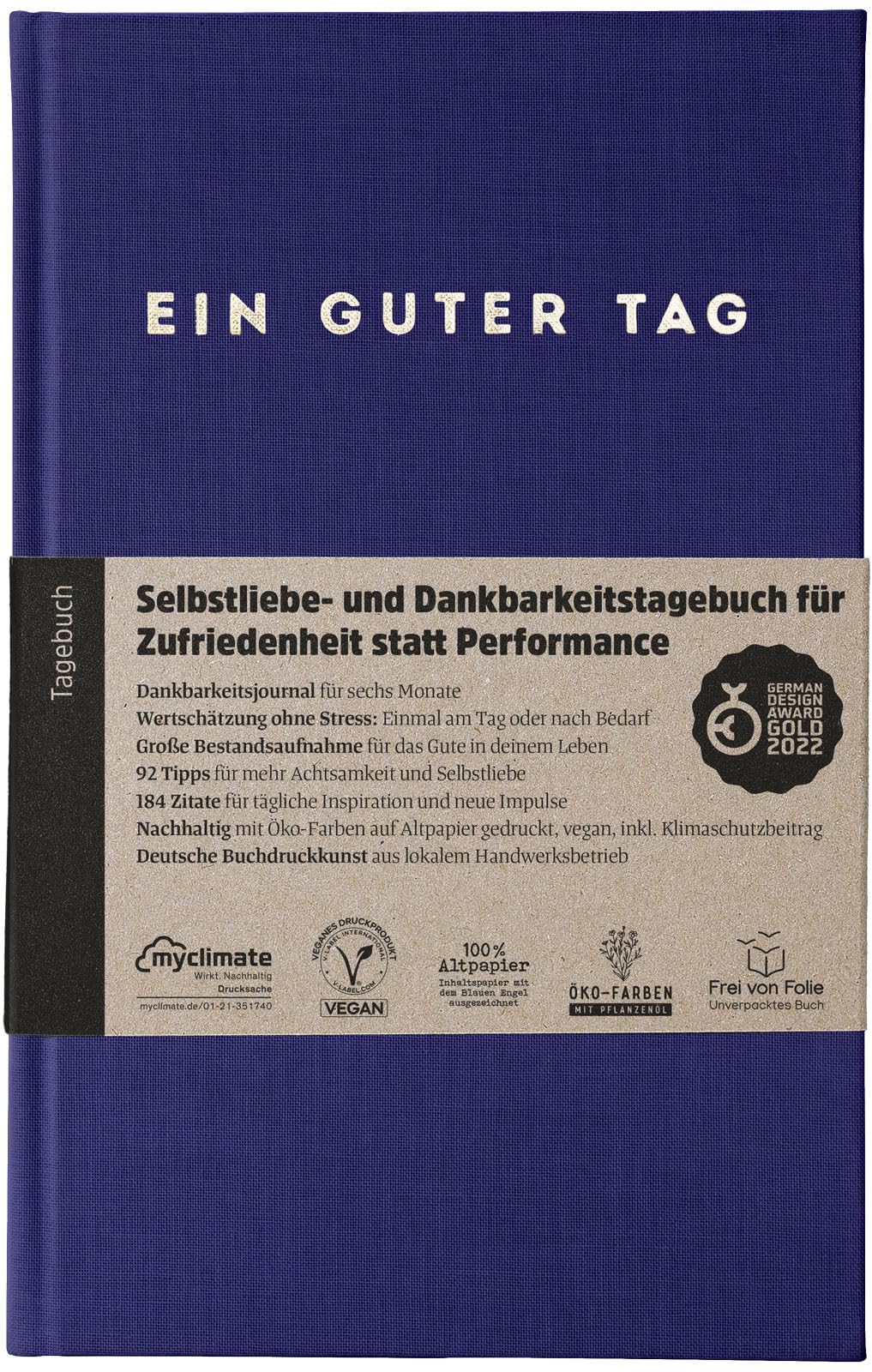 ["LOVE YOURSELF WITHOUT CHEESINESS - School yourself in gratitude more and more with just 5 minutes a day and discover the good in life. Because with the journal you create order in your mind and effectively reduce stress.","SOLID CONTENT - With 92 tips from the world of mindfulness and psychology and 184 inspiring quotes, the diary for adults gives you new perspectives for your everyday life - without toxic positivity, cheesiness, and clichés.","RADICAL SELF-KNOWLEDGE - Discover what is good for you with the help of the extensive inventory of your life and the monthly reflections.","SUSTAINABLE PRODUCTION INCL. CLIMATE COMPENSATION - We only print with certified eco-friendly inks on 100% recycled paper (Blue Angel), use vegan glue, and never wrap our books in plastic. The entire production takes place in local artisan workshops in Germany (made in Germany). This book is certified with the official V-Label.","PUBLISHING HOUSE WITH PRINCIPLES - We are a small publishing house from Berlin and since 2015 the original for mindfulness calendars and journals. Our award-winning books are regularly recommended by therapists and are the perfect gift for more stability in the world."]