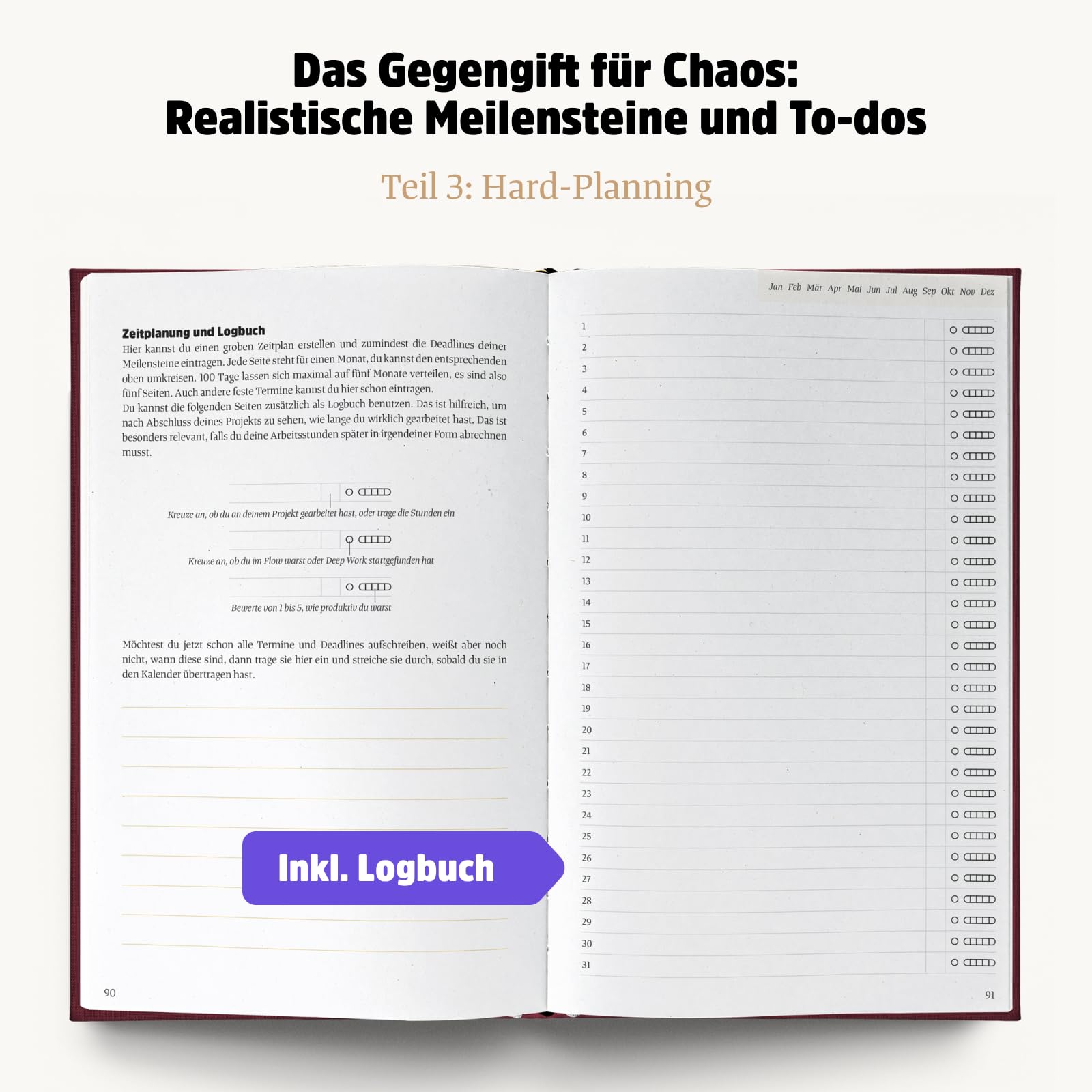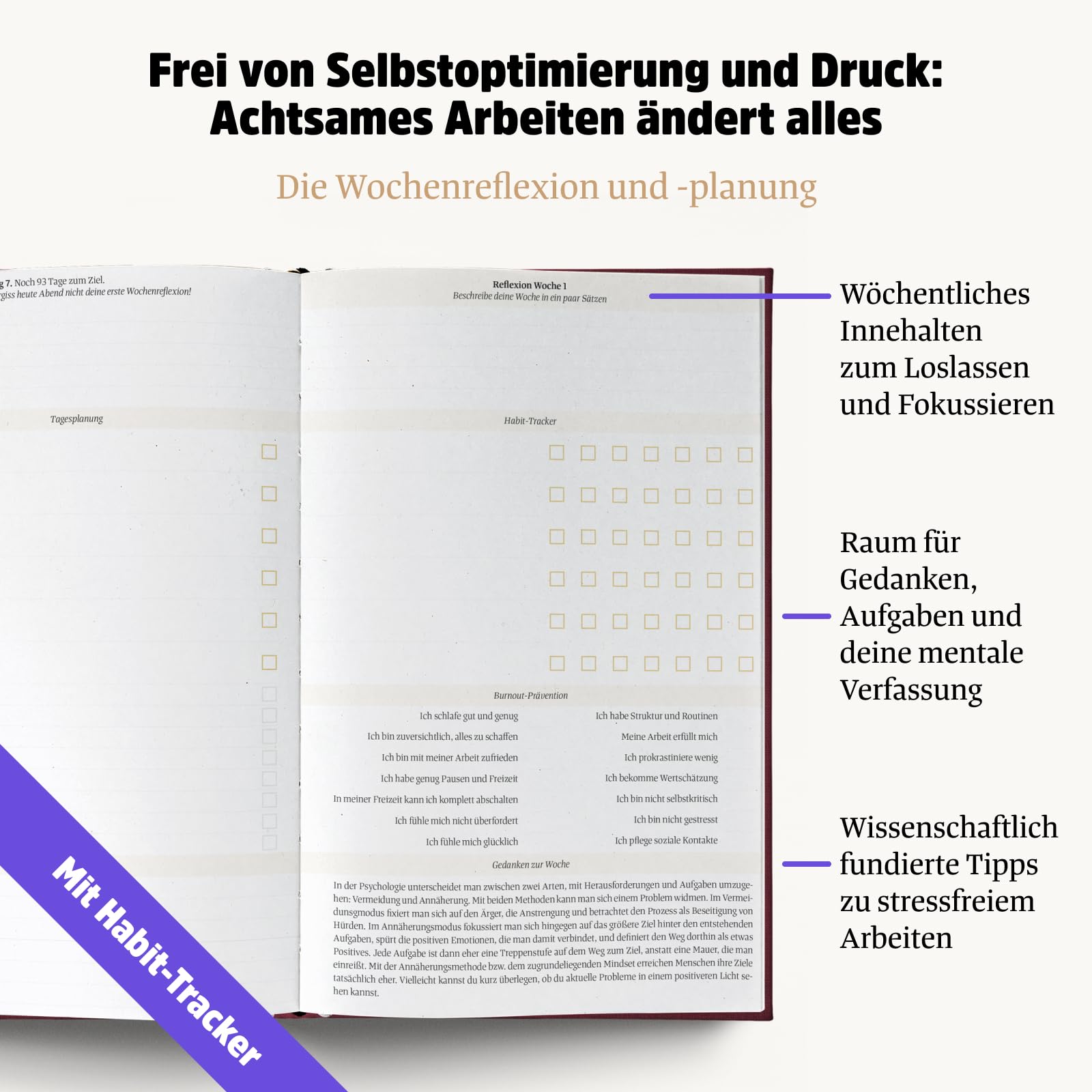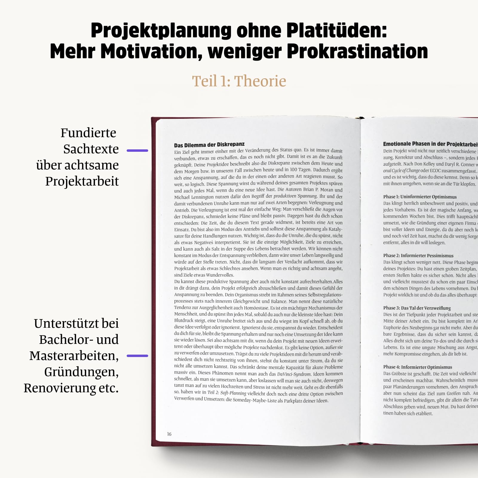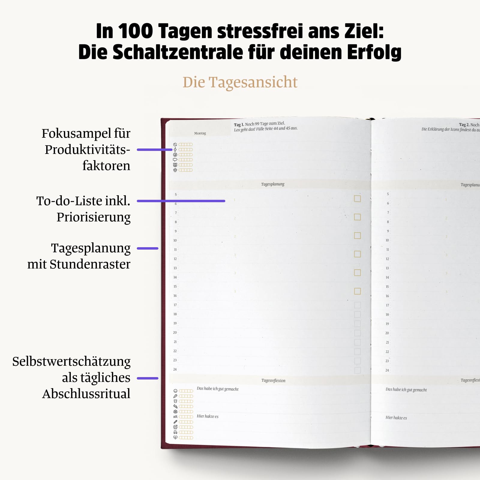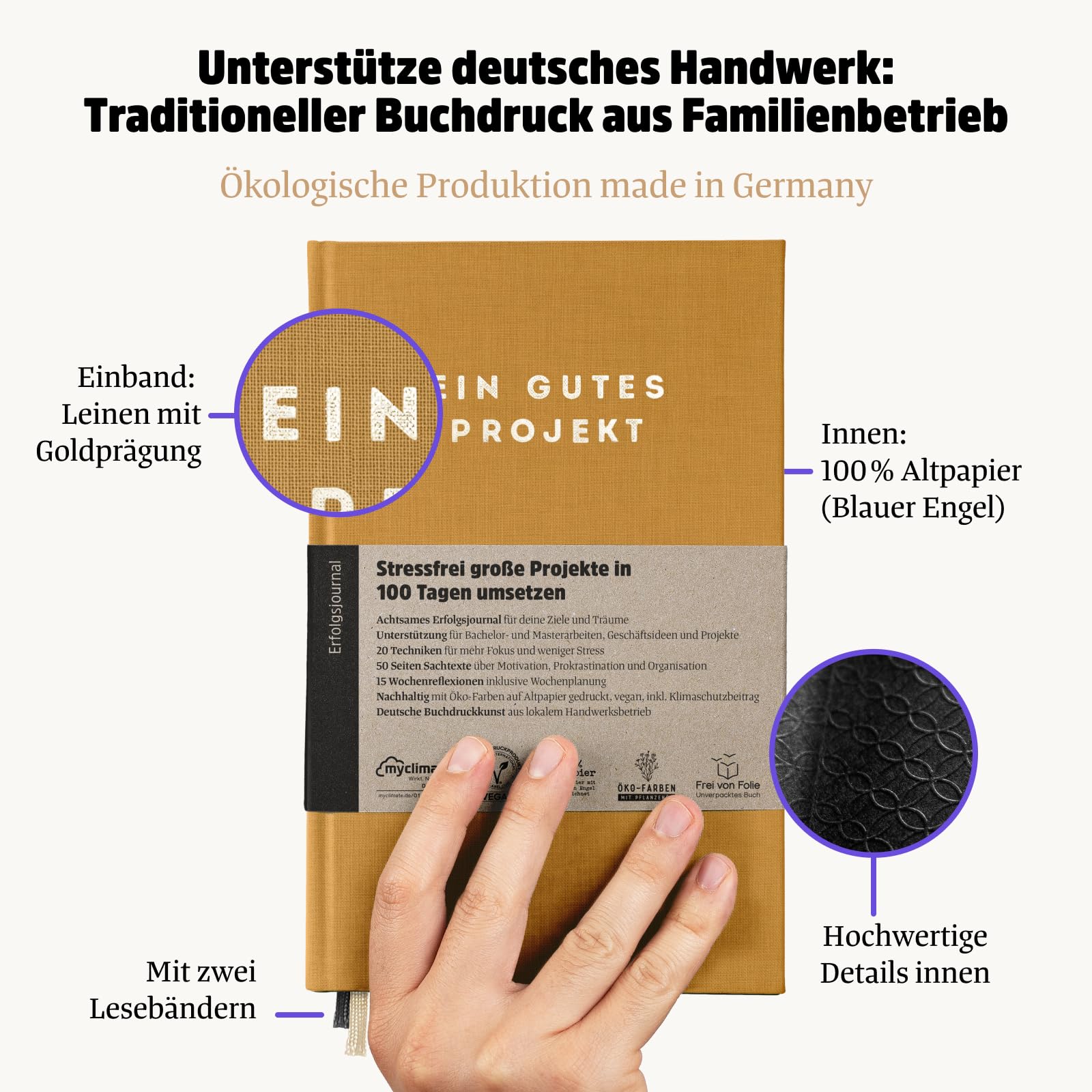["SUCCESS JOURNAL FOR 100 DAYS - Success without burnout is possible. Learn how to plan properly, keep your motivation and avoid procrastination. The mindful productivity planner is perfect for bachelor's and master's theses, business ideas, renovations, your own book, and large projects of any kind.","MINDFUL WORK - With A Good Project, you will learn everything about deadline-oriented project work in extensive factual texts. Understand the emotional phases you will go through on the way to your goal and how to deal with common problems. In the second part, it's time to structure your tasks: define milestones, establish work routines, and keep track of your to-dos.","PREVENTION FOR THE MIND - Daily check-ins as well as weekly and monthly units of self-reflection on your needs and burnout factors help you take care of your mind and recognize stress before it becomes a burden. Advice without platitudes and inspirational quotes far from kitsch will help you reach your goal.","SUSTAINABLE PRODUCTION INCLUDING CLIMATE COMPENSATION - We print exclusively with certified eco-inks on 100% recycled paper (Blue Angel), use vegan glue, and never wrap our books in plastic. The entire production takes place in local craft businesses in Germany (made in Germany).","PUBLISHER WITH PRINCIPLES - We are a small publishing house from Berlin and since 2015 the original for mindfulness calendars and journals. Our award-winning books are regularly recommended by therapists and are the perfect gift for more stability in the world."]