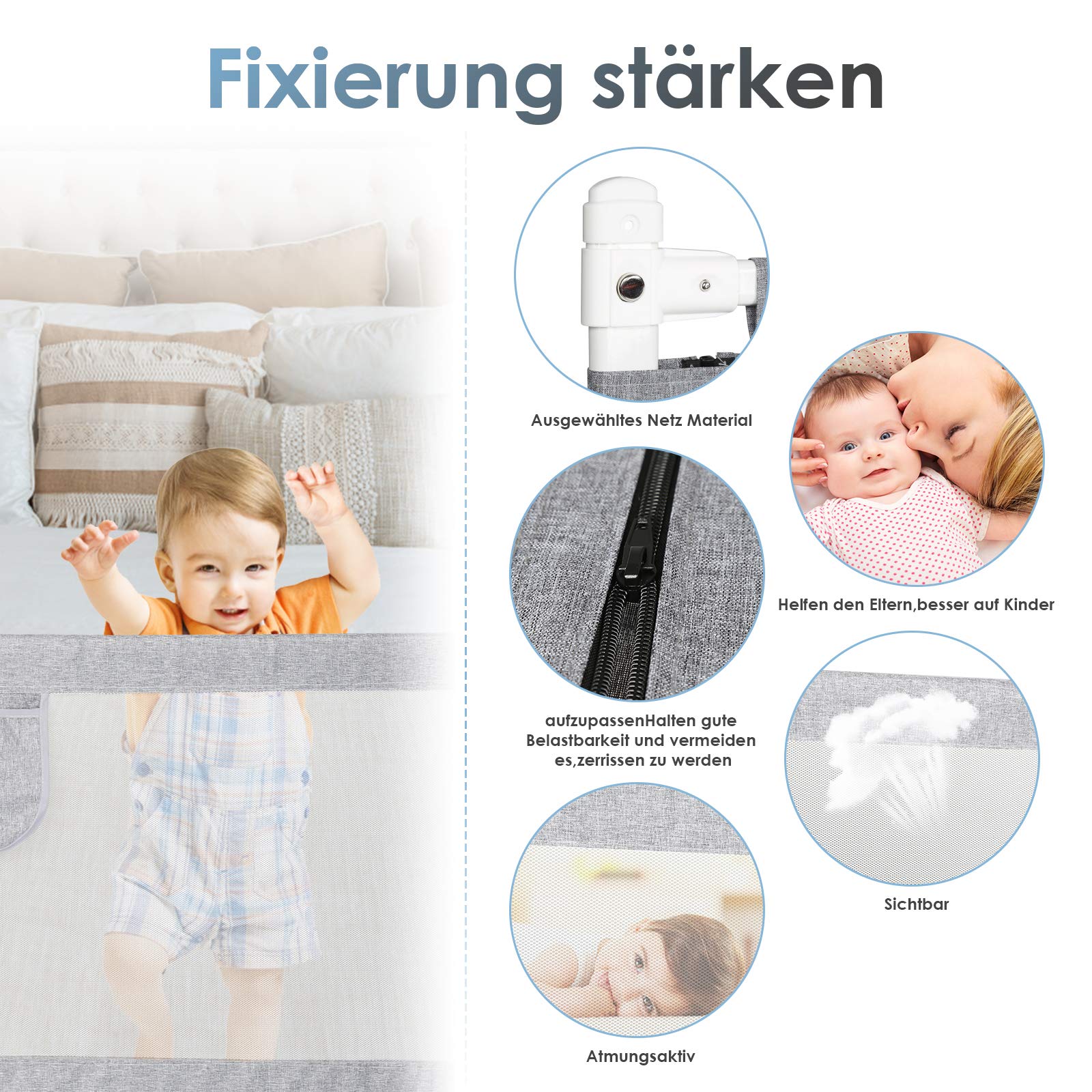 ["đăClean and practicalăThe baby rail is washable and reusable. When you don't need it, you can simply put it away and save space in the corner.","đăEasy installationăNo tools or complicated processes are required. Simply adjust the rail by hand. The holder is under the mattress. The bed guard is suitable for beds, family beds, children's beds, and baby beds. The anti-slip strip prevents the guard from slipping.","đăHeight adjustableăYou can adjust the height of the new bed rail freely according to the thickness of the mattress. The bed rail is vertically designed and can be freely raised/lowered. The lifting rod can be placed on the surface of the bed to facilitate getting in and out. The guardrail for children's fall protection bed can be raised vertically, providing your child with protection from falling out.","đăHigh quality and safetyăThe bed guard is made of linen fabric + carbon steel. The breathable nylon mesh ensures that the mother can see the baby through the mesh. The steel tube makes the frame more stable and durable, the high-density round parts effectively reduce damage caused by breakage.","đăWide applicationăThis baby guardrail is suitable for children's beds, double beds, and other large beds. Note: Not suitable for box spring beds."]