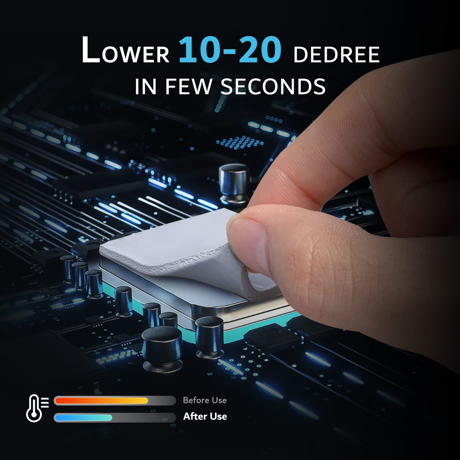 "Easy to use - 100 x 100mm with light adhesive on two sides, cut it freely for your individual needs, peel off the double-sided protective film and stick it. The soft and compressible improved thermal material allows for a 30-40% compression rate, making it a perfect replacement for traditional thermal grease."