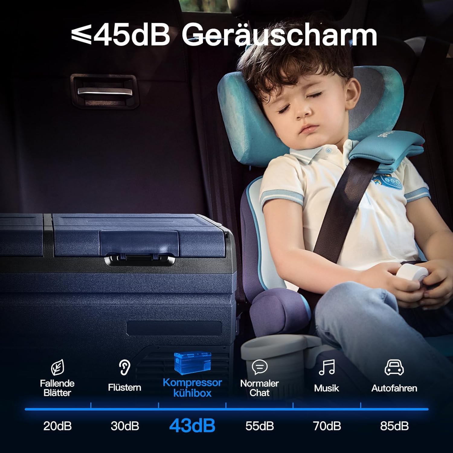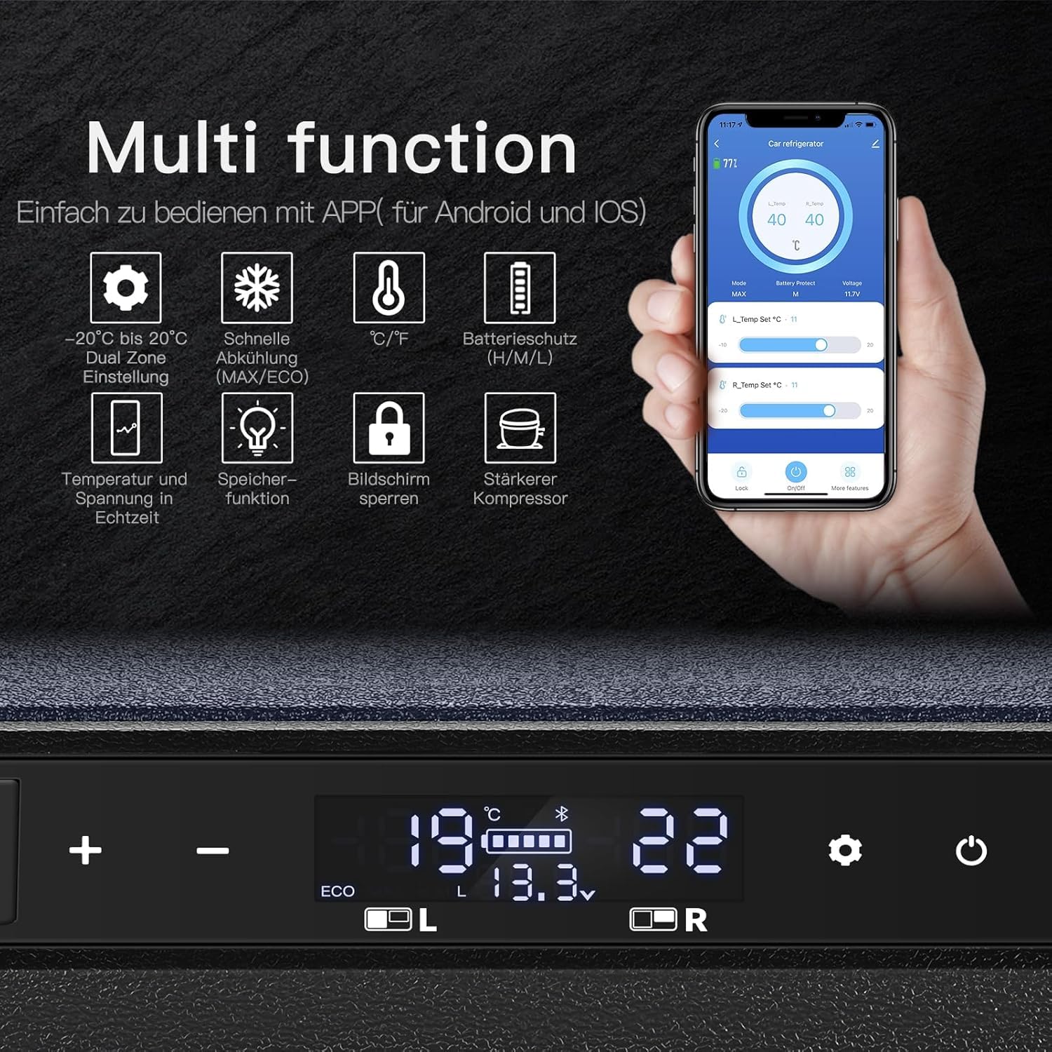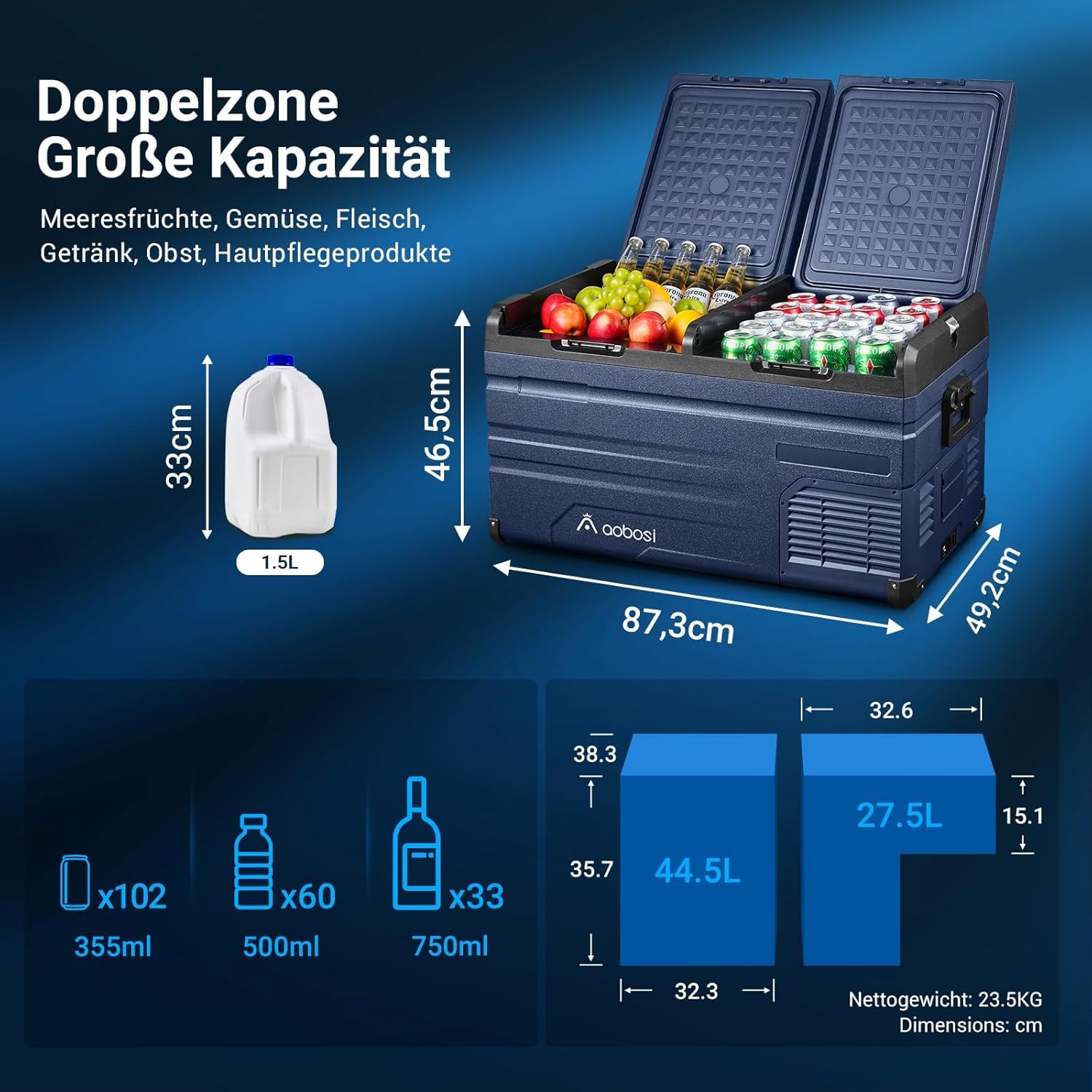 "Double zone: The cooler compressor has two zones, 44.5 liters on the left and 27.5 liters on the right side, totaling 72 liters, space for upright 2-liter bottles. This car fridge holds 102 cans of cola, 60 bottles of water, or 33 bottles of red wine. There are a total of two zones, and the temperature in each zone is independently controlled.
