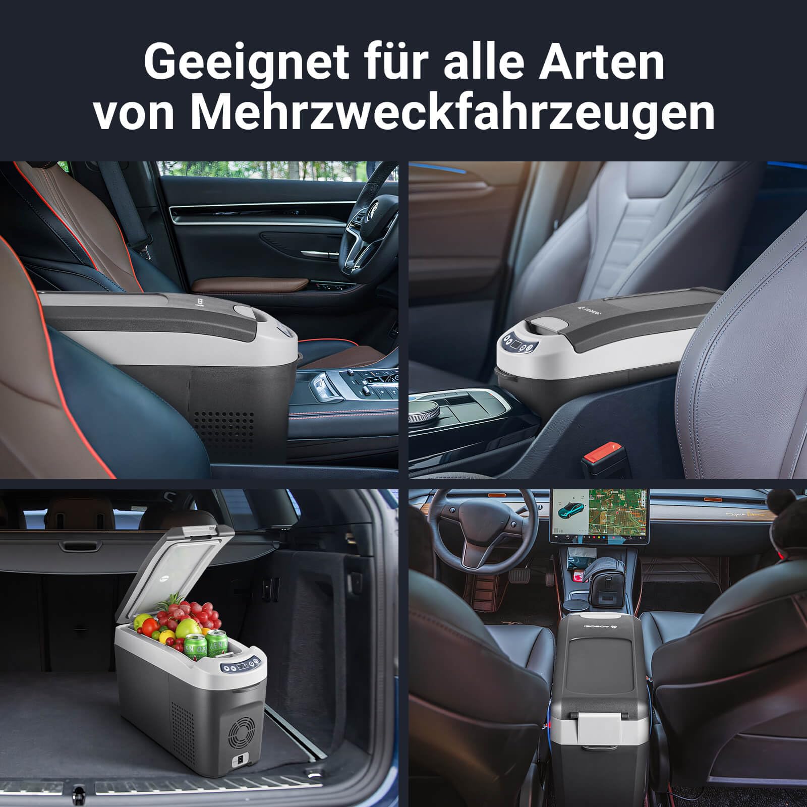 "Armrest compressor cooler: The AAOBOSI 15L cooler 12v features a compact and attractive design. Due to its compact size (22.2 x 9.3 x 14.2 inches), it fits between the front seats of a multifunctional vehicle. You can use it to cool drinks, meat, vegetables, ice cream, and other items."