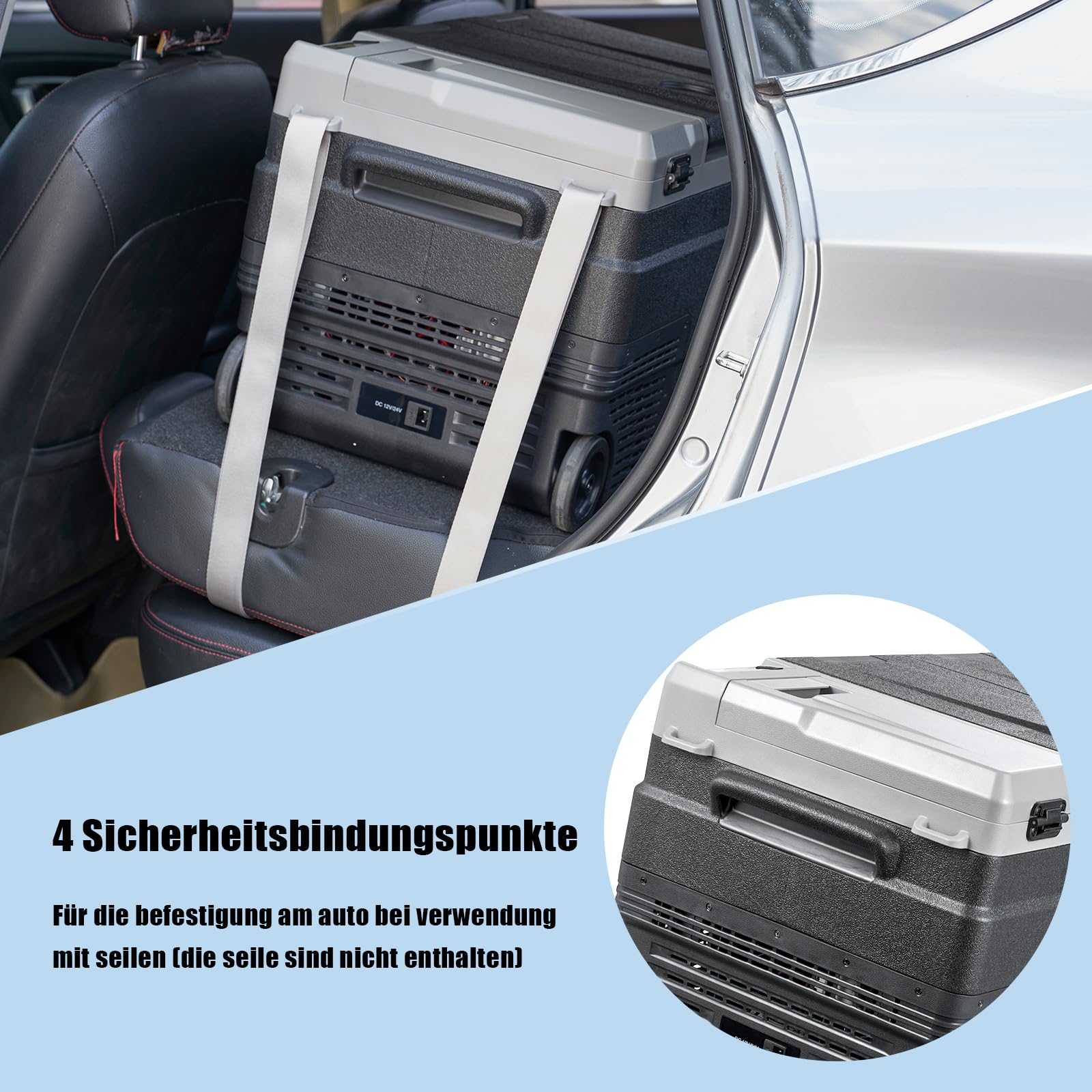 ["Portable Car Freezer Box"] Our refrigerator comes with high-quality off-road wheels and a foldable pull handle, with two holes cut on the side for securely attaching a rope to cars and trucks to keep the cooler box stable during travel. In addition, the car fridge is equipped with 2 LED night lights, 1 USB port, and 1 bottle opener to meet some of your travel needs.