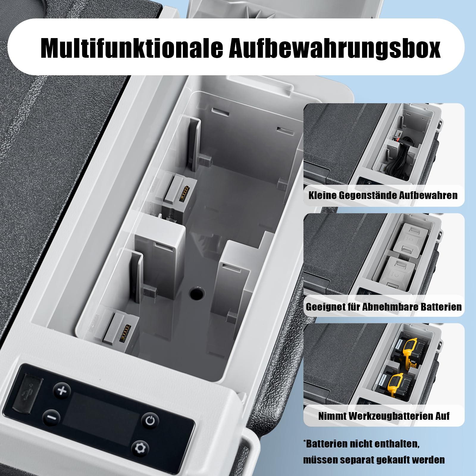 ["Battery-Powered Tool Compatibility"] The AAOBOSI compressor cooler box has a dual battery charging station for two batteries, ensuring continuous power supply. With two adapters, it is compatible with BOSCH tool batteries or removable batteries for extended runtime and wireless convenience. The built-in storage compartment is perfect for storing the AC/DC power cable or smaller items. (Batteries not included)