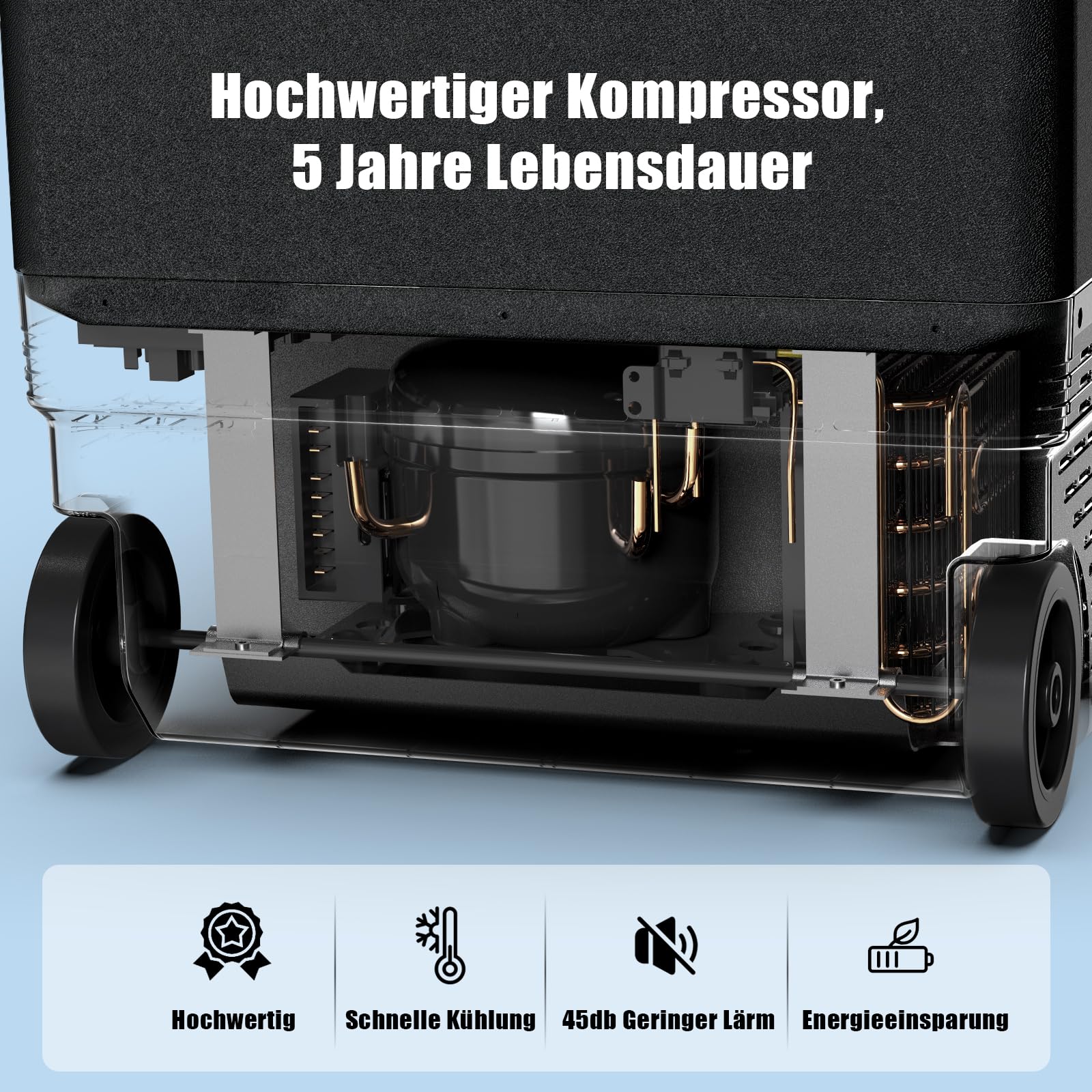 ["MAX/ECO Mode"] This compressor cooler box offers two operating modes: MAX mode (quick cooling) and ECO mode (energy saving). In MAX mode, power consumption is about 60 watts, and in ECO mode about 45 watts, making it very energy efficient. It also has a voltage protection unit (H/M/L) that prevents the car from not starting due to a dead battery.