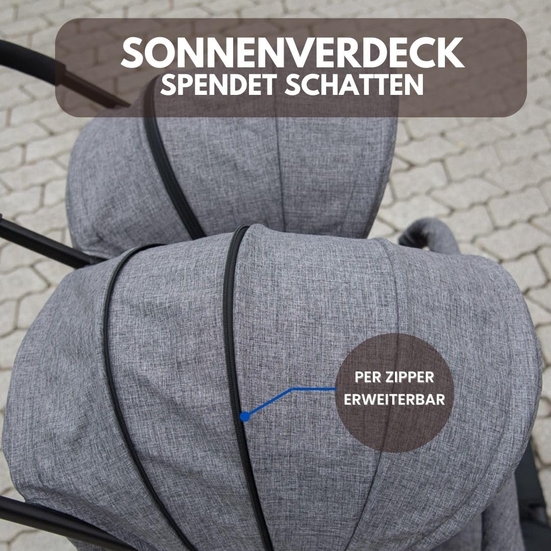 Well protected: Baby or toddler are secured by the harness system in the double buggy. Expandable XXL canopies with UV protection 50+ shield from sun and wind. Conveniently, a matching rain cover is already included.