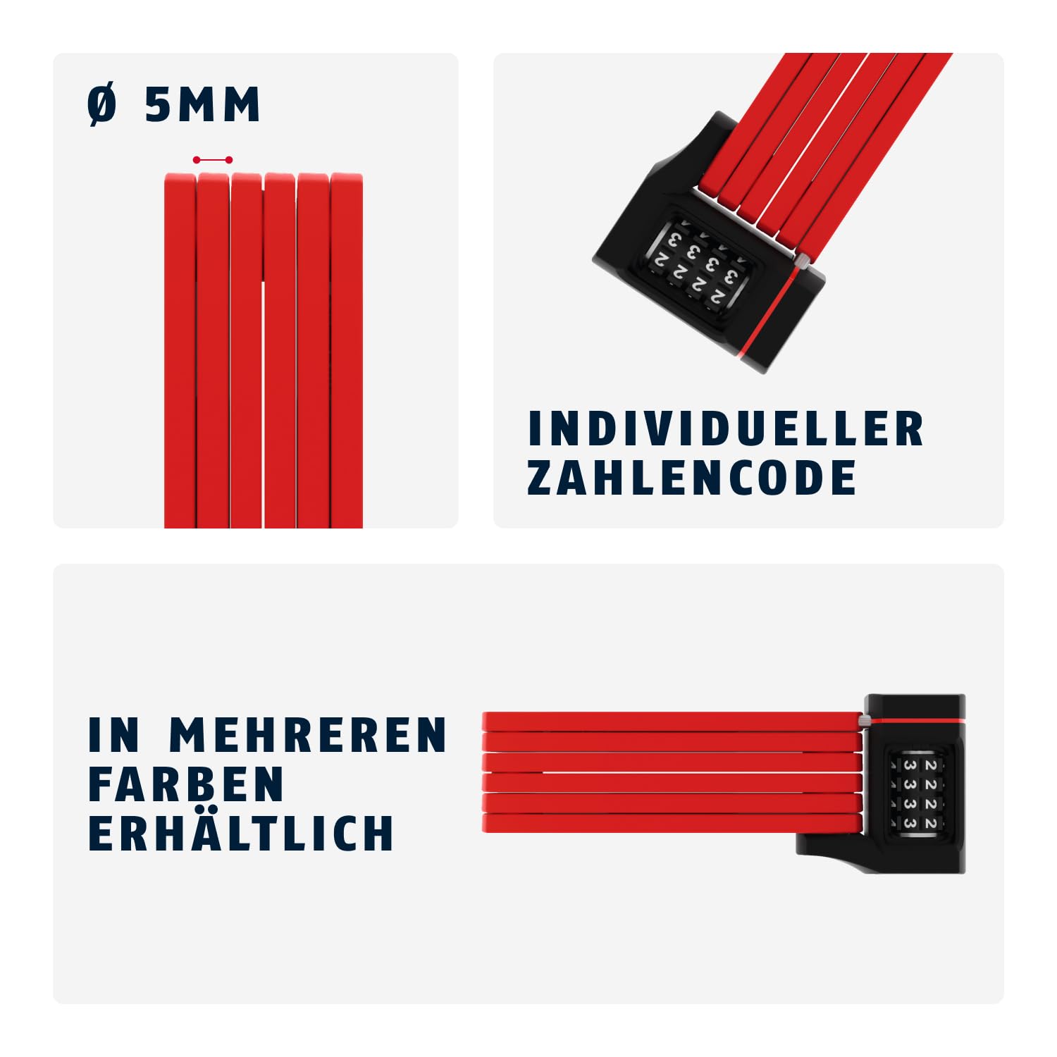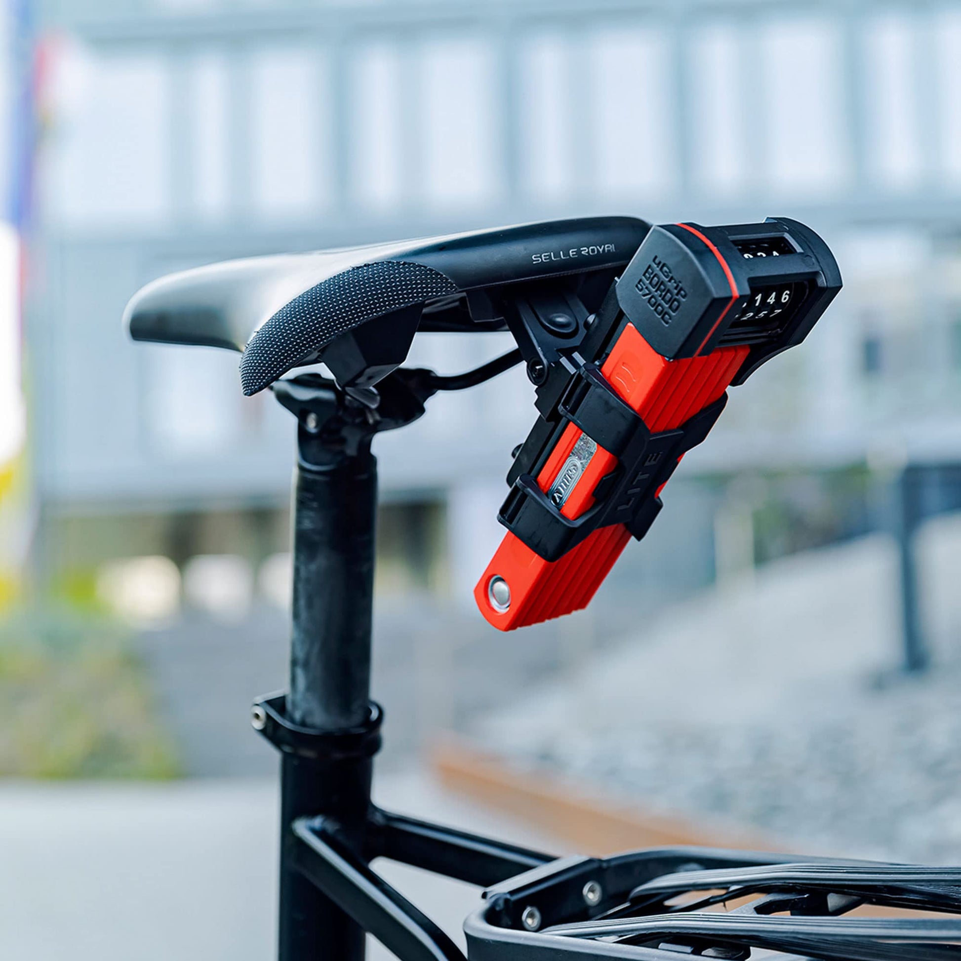 ["ABUS SECURITY LEVEL 7: The fashionable combination lock with 5 mm thick bars provides protection against low to medium theft risk; the 2-component number wheels ensure long-lasting readability of the digits", "INDIVIDUALLY ADJUSTABLE: This model is available in numerous color variations of the lock body and can be visually adapted to a helmet or bike, for example - individually adjustable number code", "FOLDABLE AND COMPACT: The special rivets allow flexible folding of the lock to a handy size of max. 6.7 cm x 3.5 cm x 17.8 cm, thus enabling easy and space-saving transport", "RELIABLE LOCK FOR BIKES: Bordo uGrip 5700C80 - Length 80 cm, Weight 848 g without holder, ABUS Security Level 7, holder included in delivery", "INCL. SH 5700 HOLDER: tool-free mounting with practical tension straps - lock can be taken out of the holder frontally"]